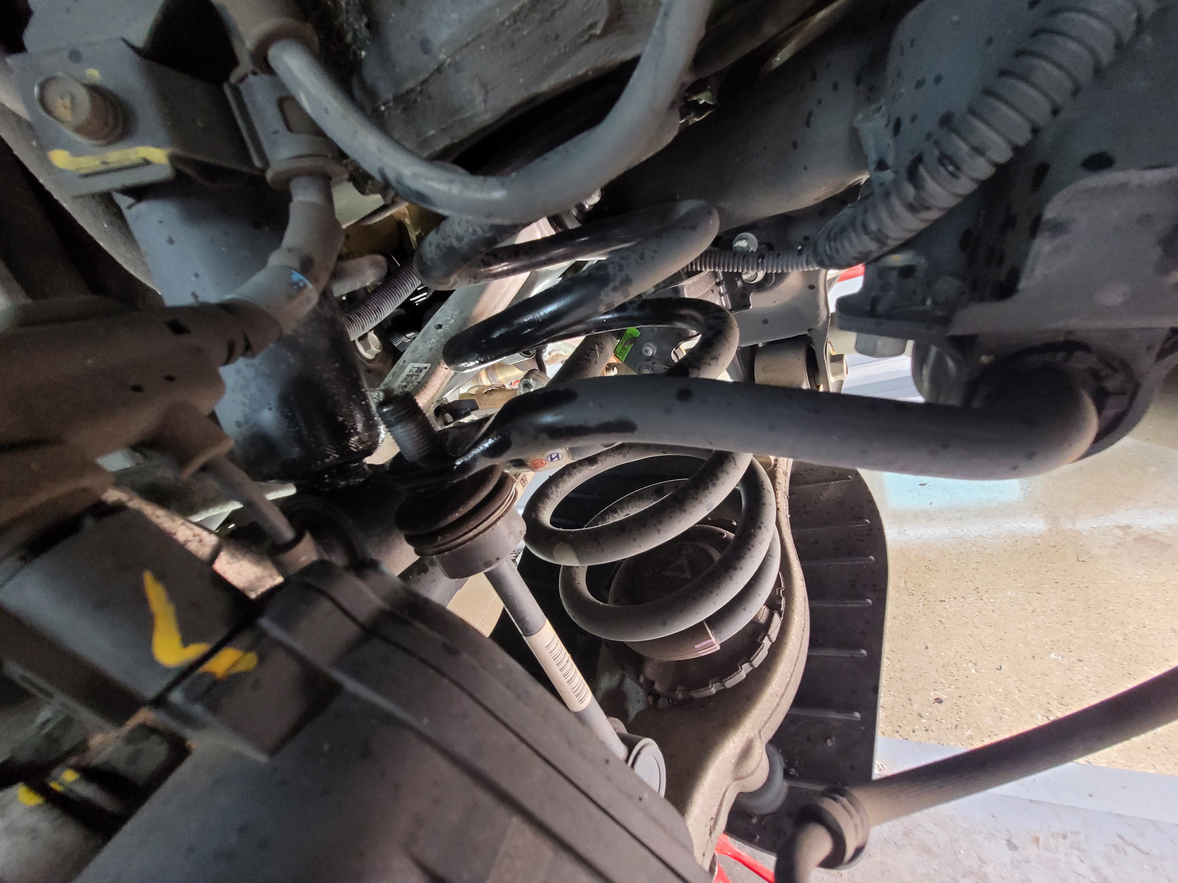기아자동차 더뉴K9 고급택시 딥크로마블루 색상 차량에 스테빌라이저링크 너트를 탈거하고 라이트 레벨센서를 탈거하고 로우암 바깥쪽 볼트너트를 탈거합니다