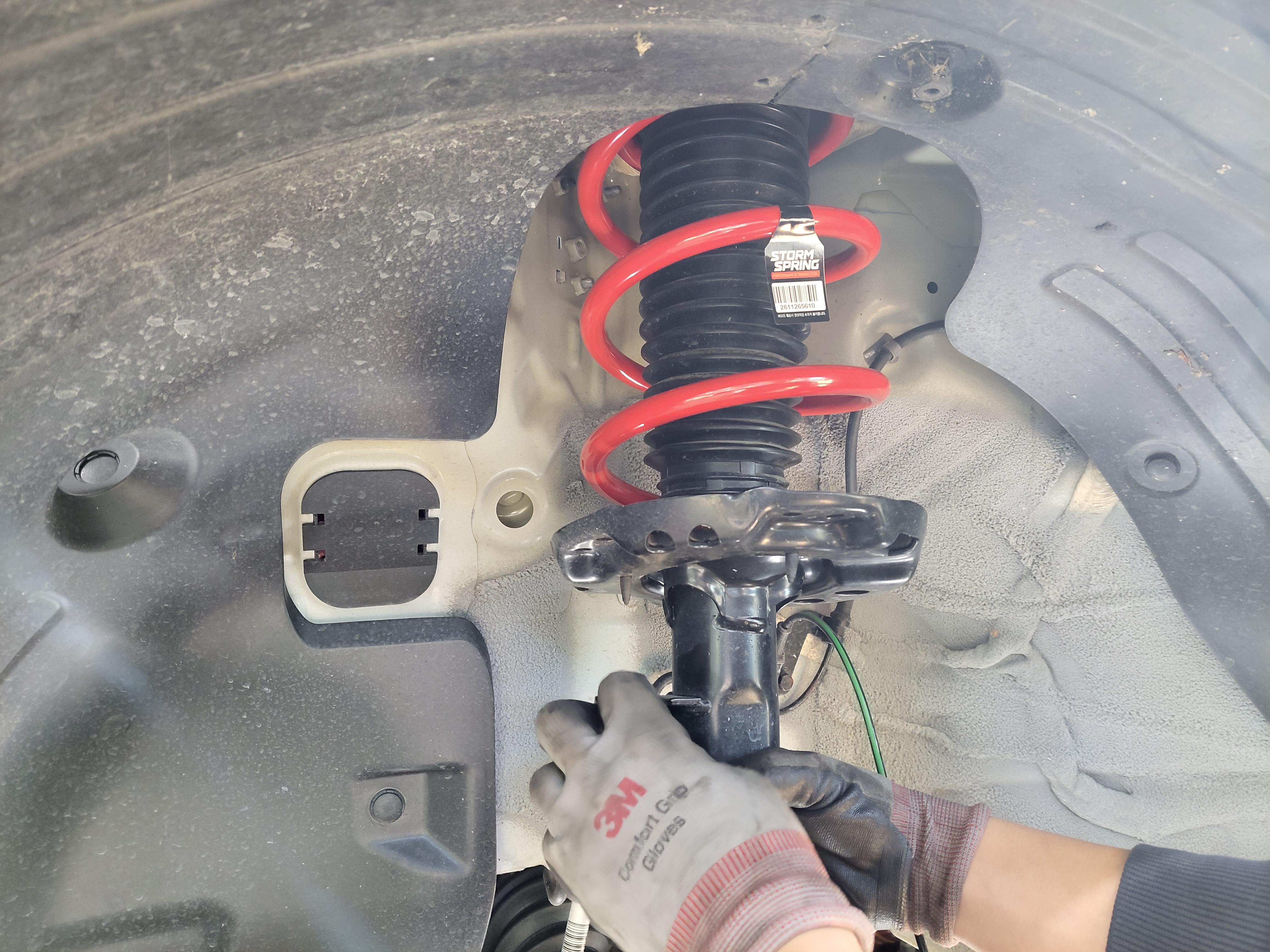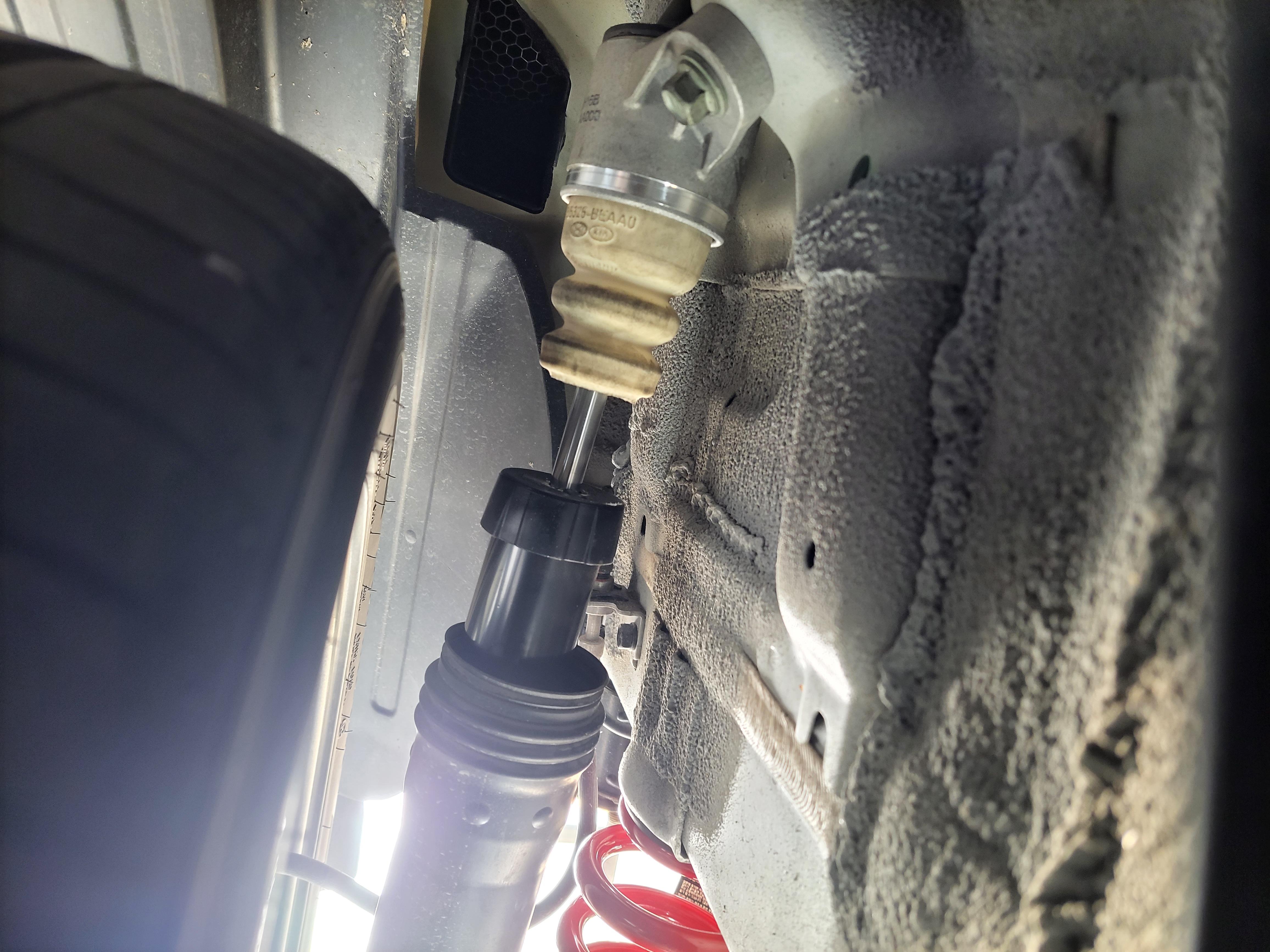 쇼바에 스톰스프링을 조립하고 차량에 장착하고 있습니다