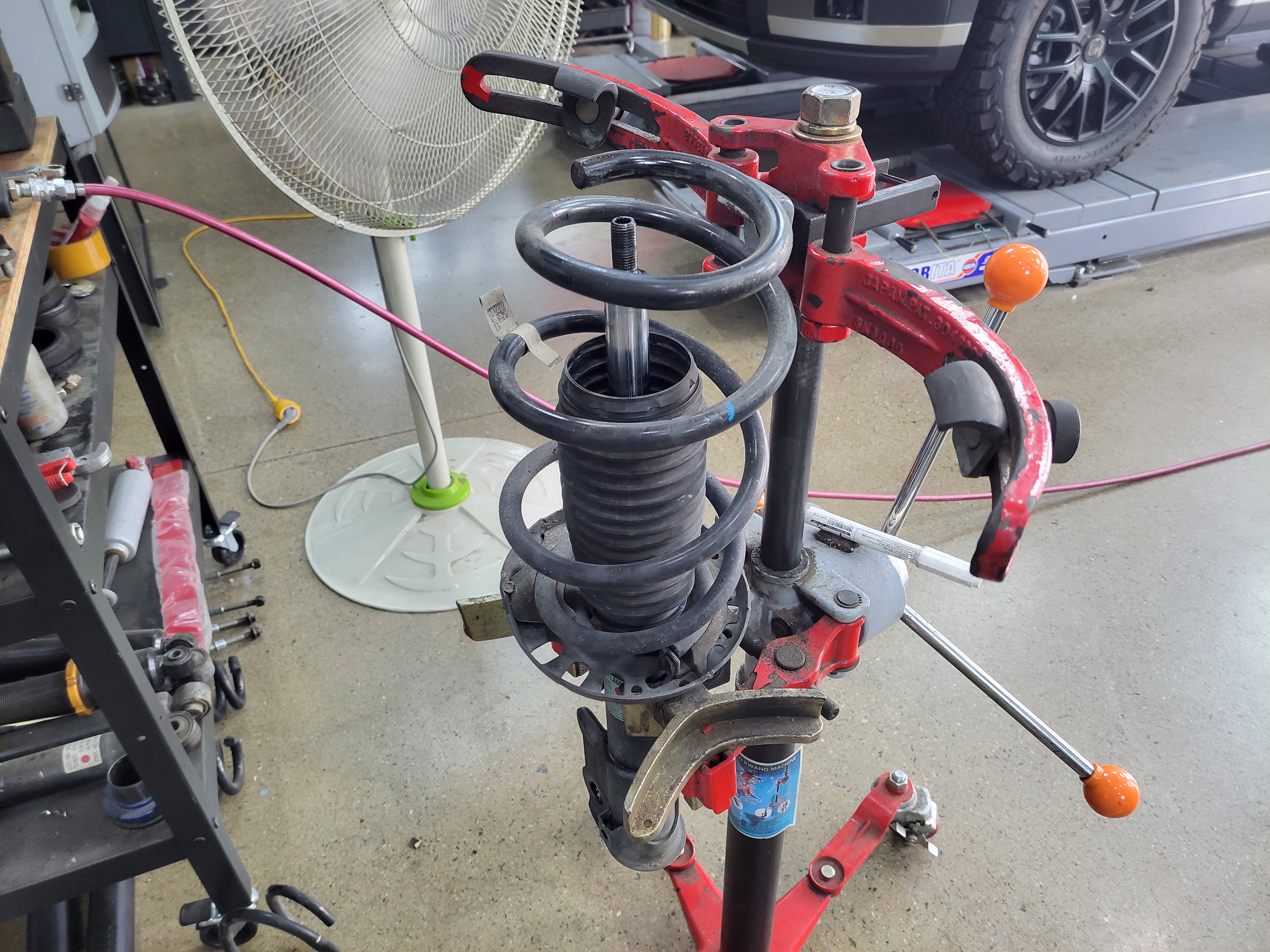 쇼바스프링을 탈거하려고 준비하고 있습니다
