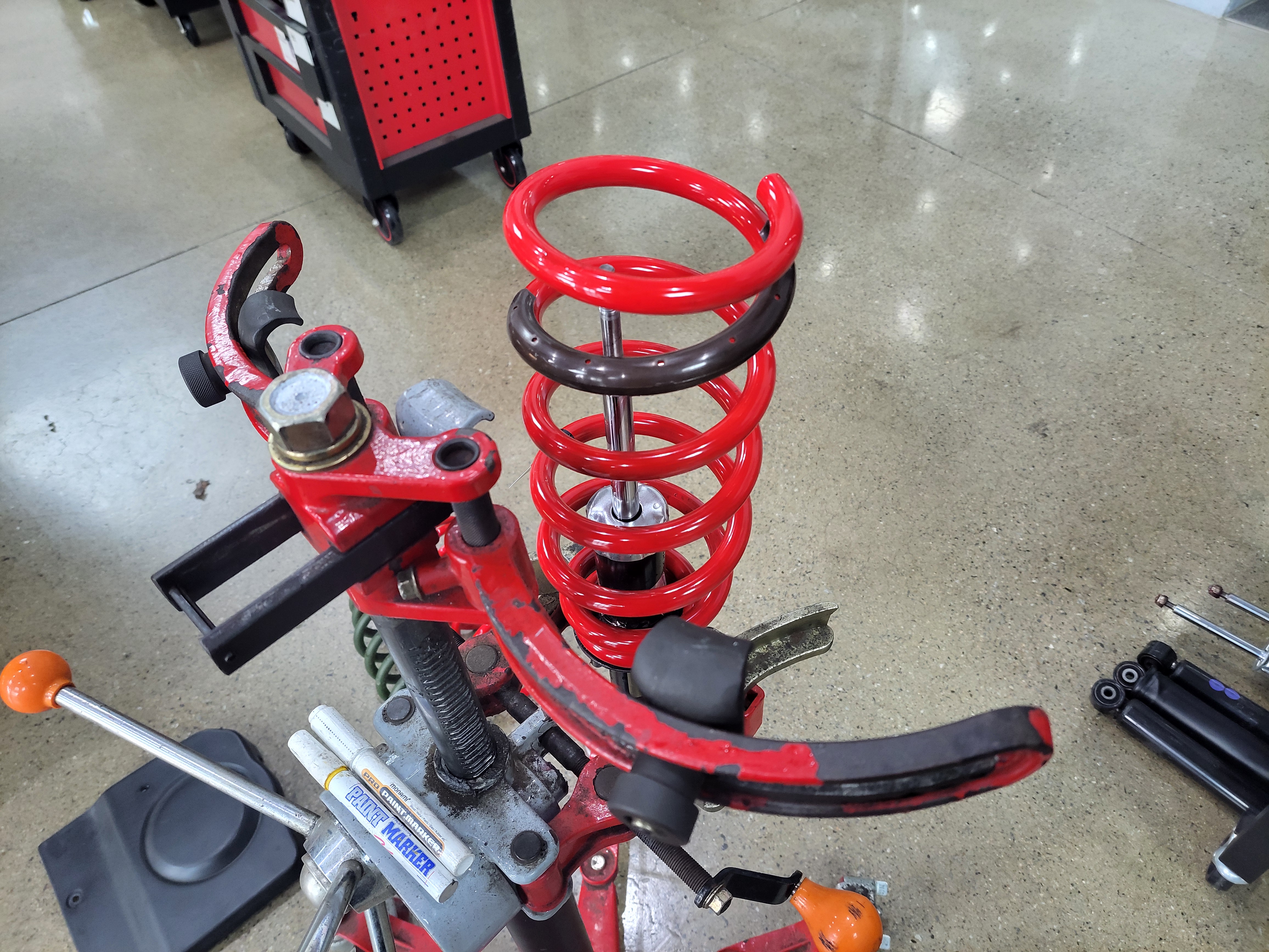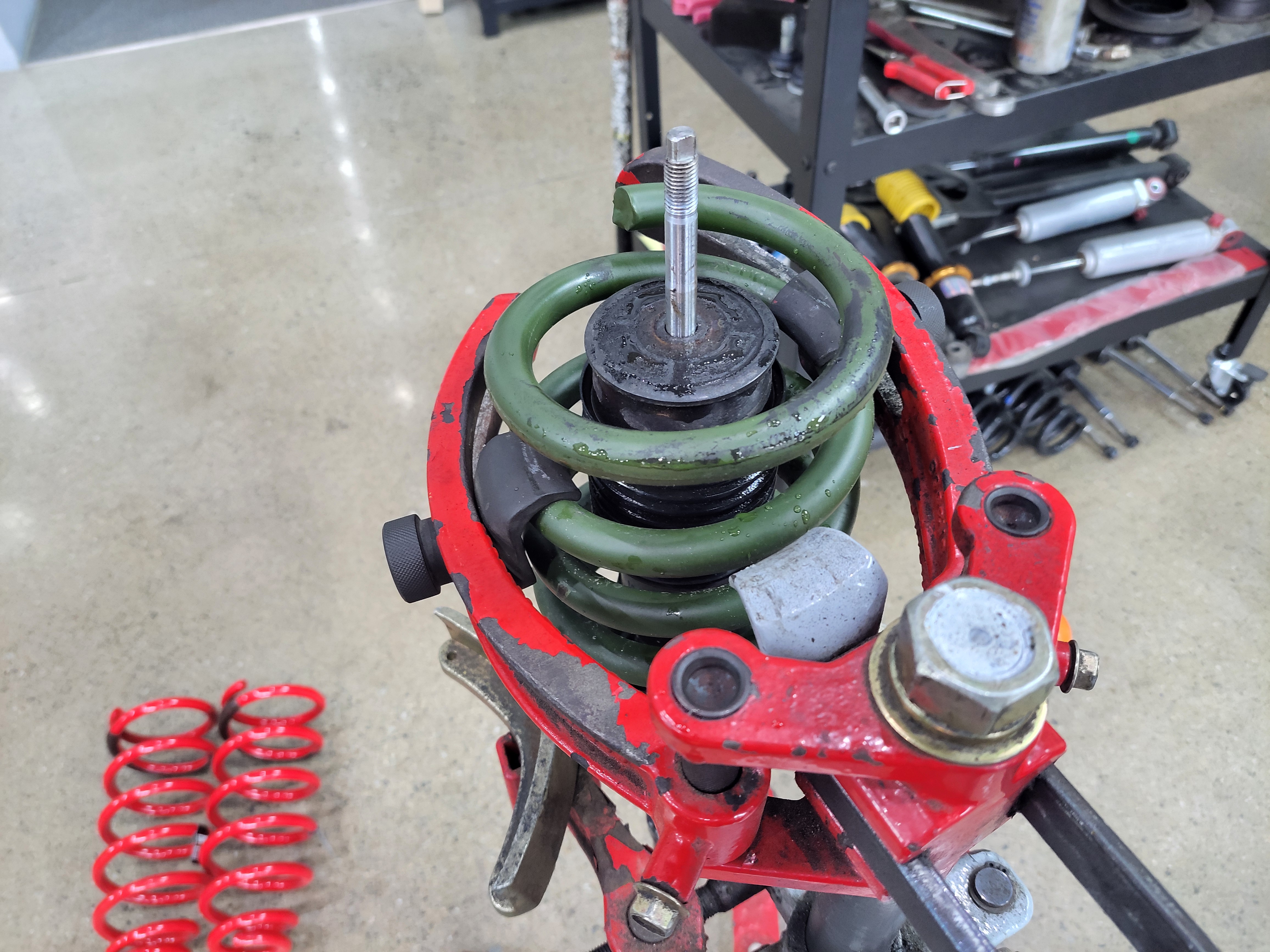 스프링 압축기를 이용하여 순정쇼바에 조립을 하고