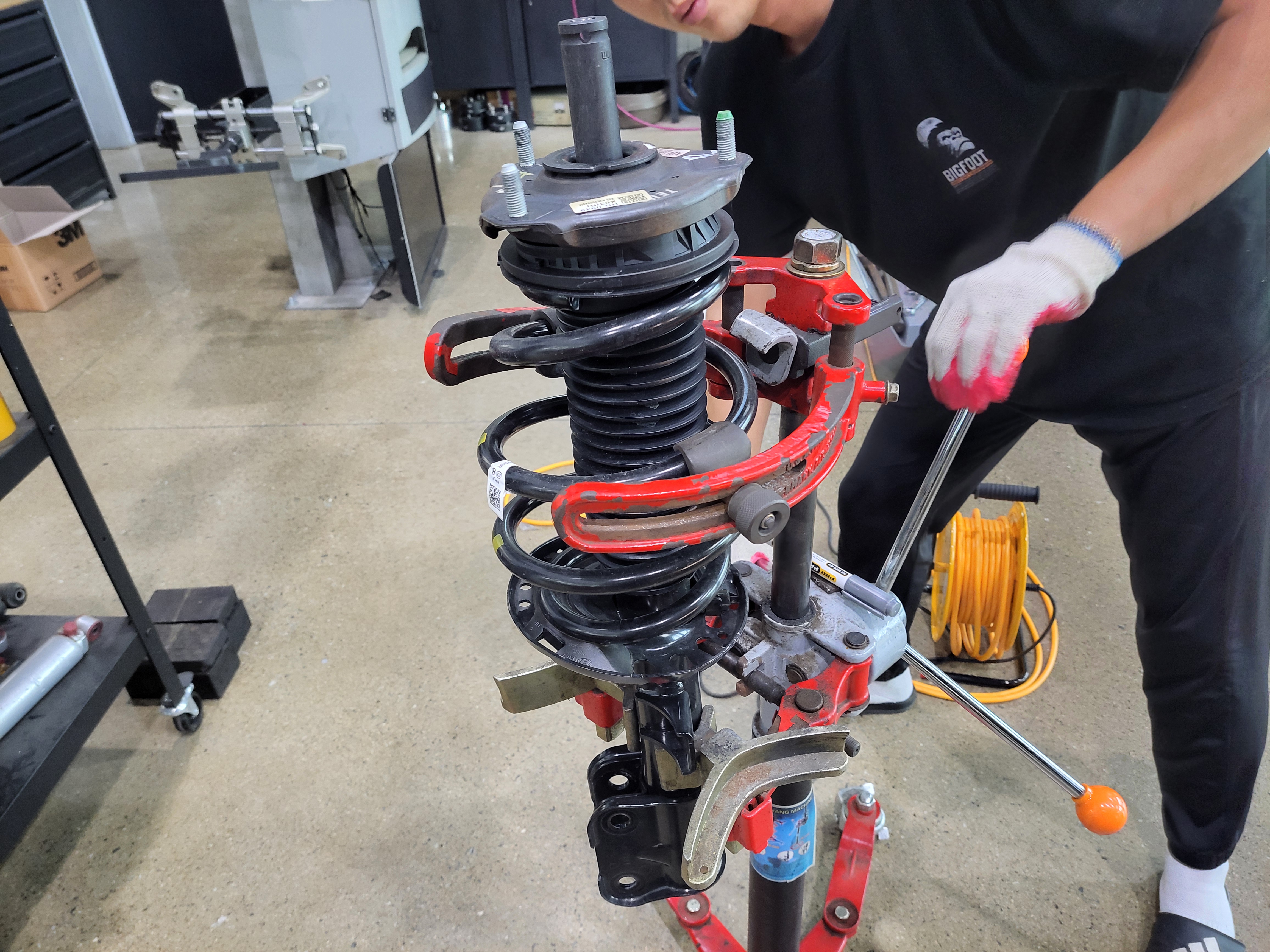 프런트 쇼바스프링을 스프링 압축기에 고정을 시키고
