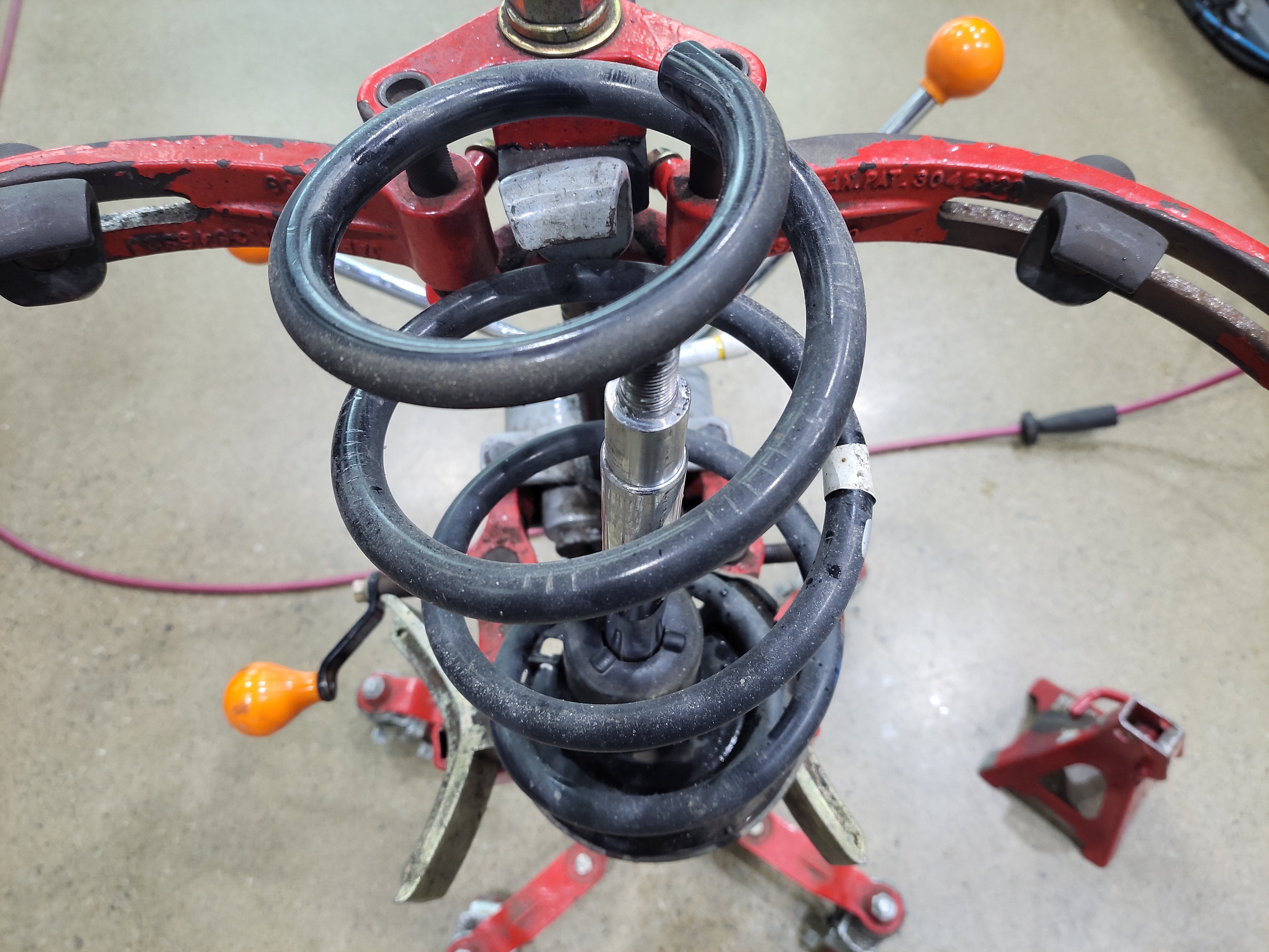 스프링 압축기에 고정을 하여 스프링을 탈거하고 있습니다