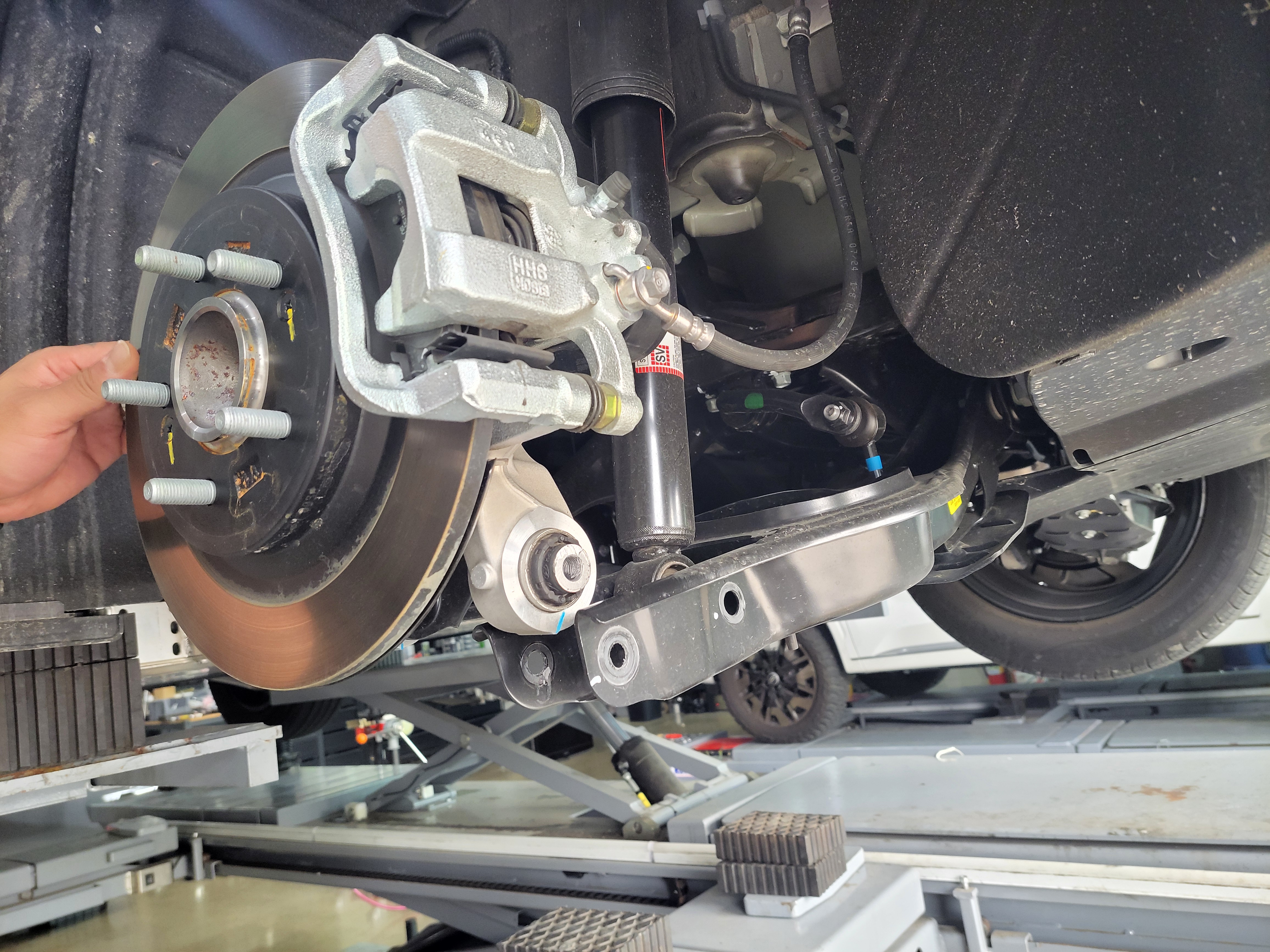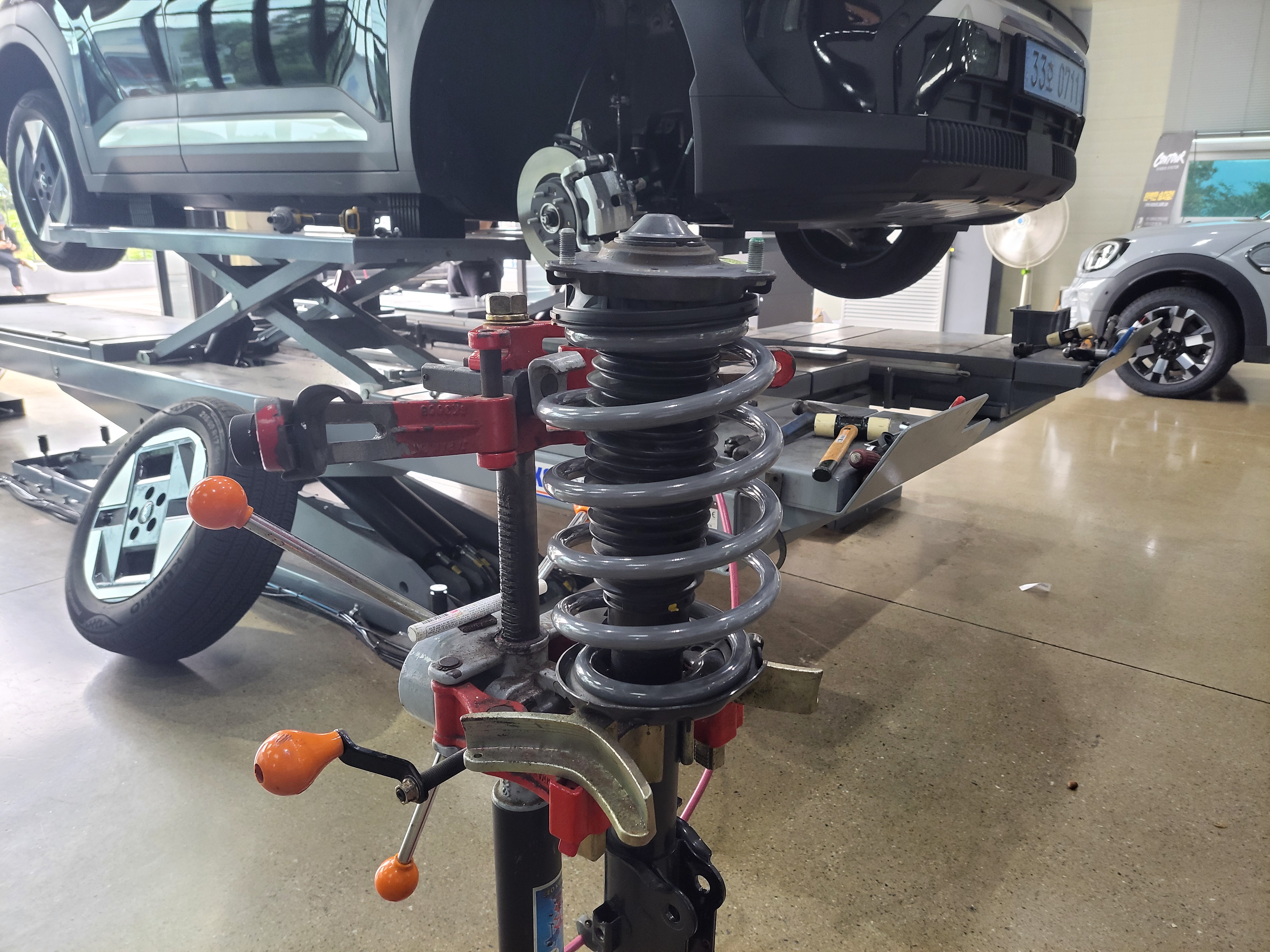 스프링을 탈거하기 위해 리프트 위에 차량이 위치하고 있습니다