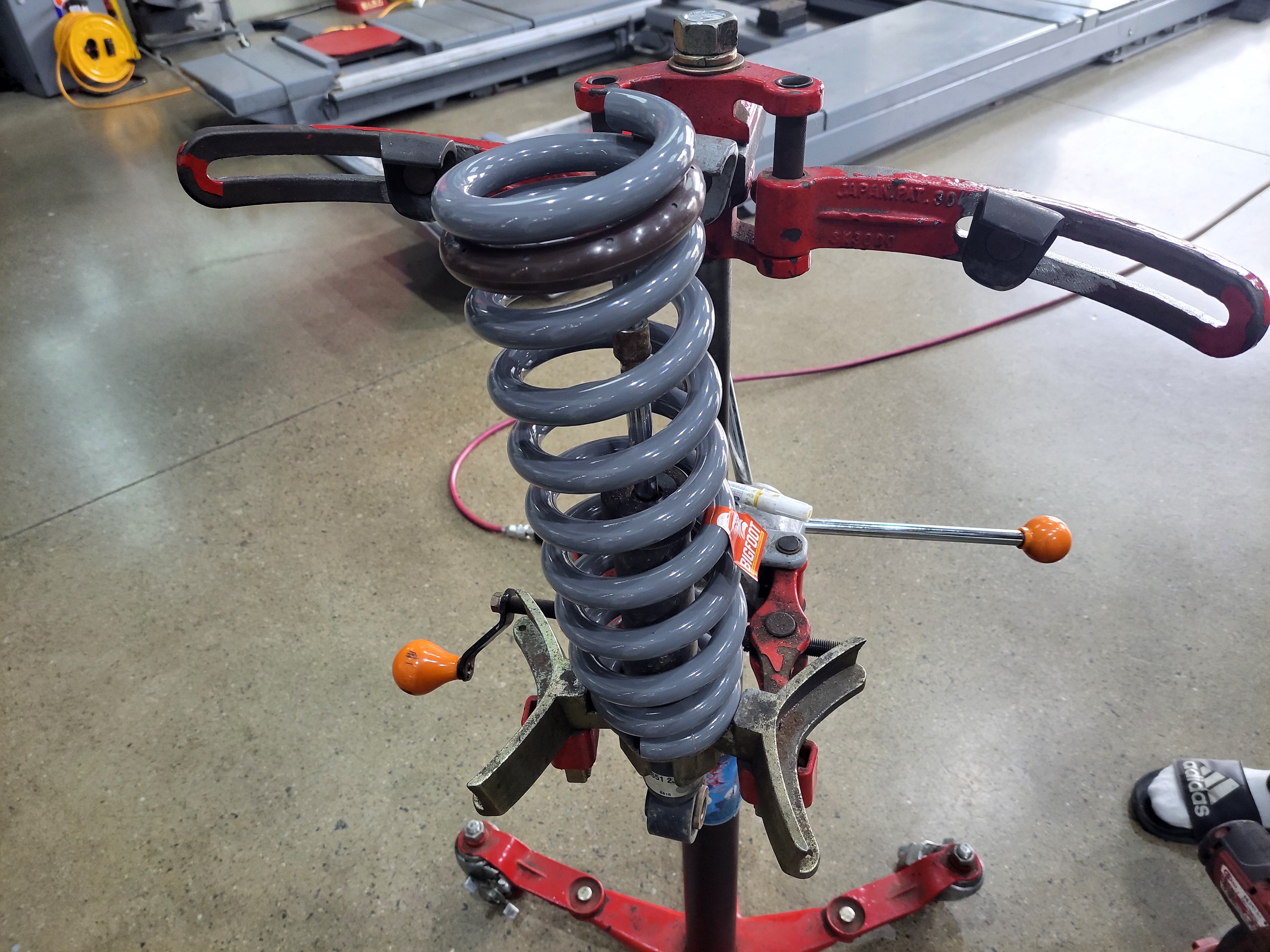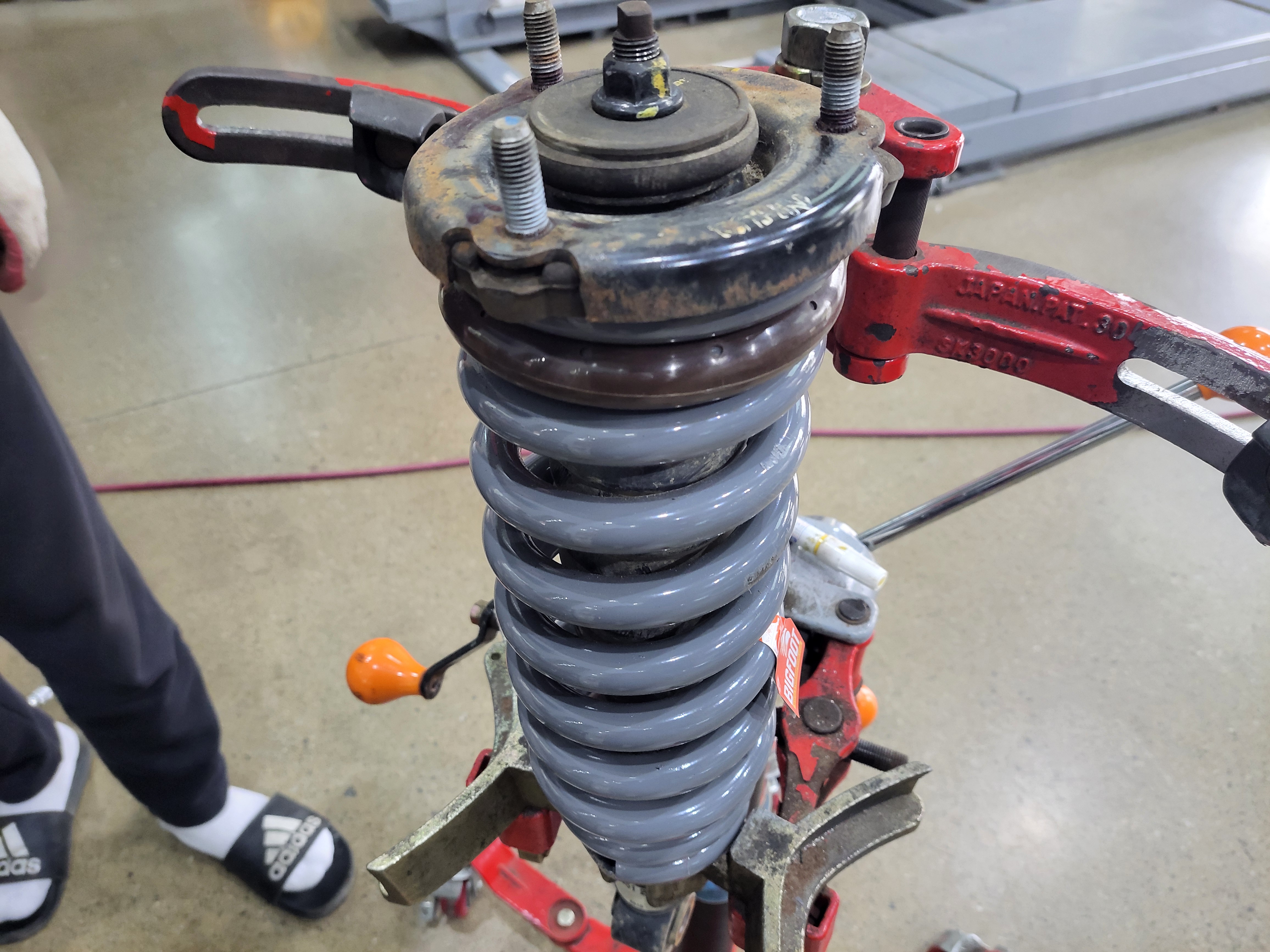 스프링 압축기에 쇼바스프링을 거치하고