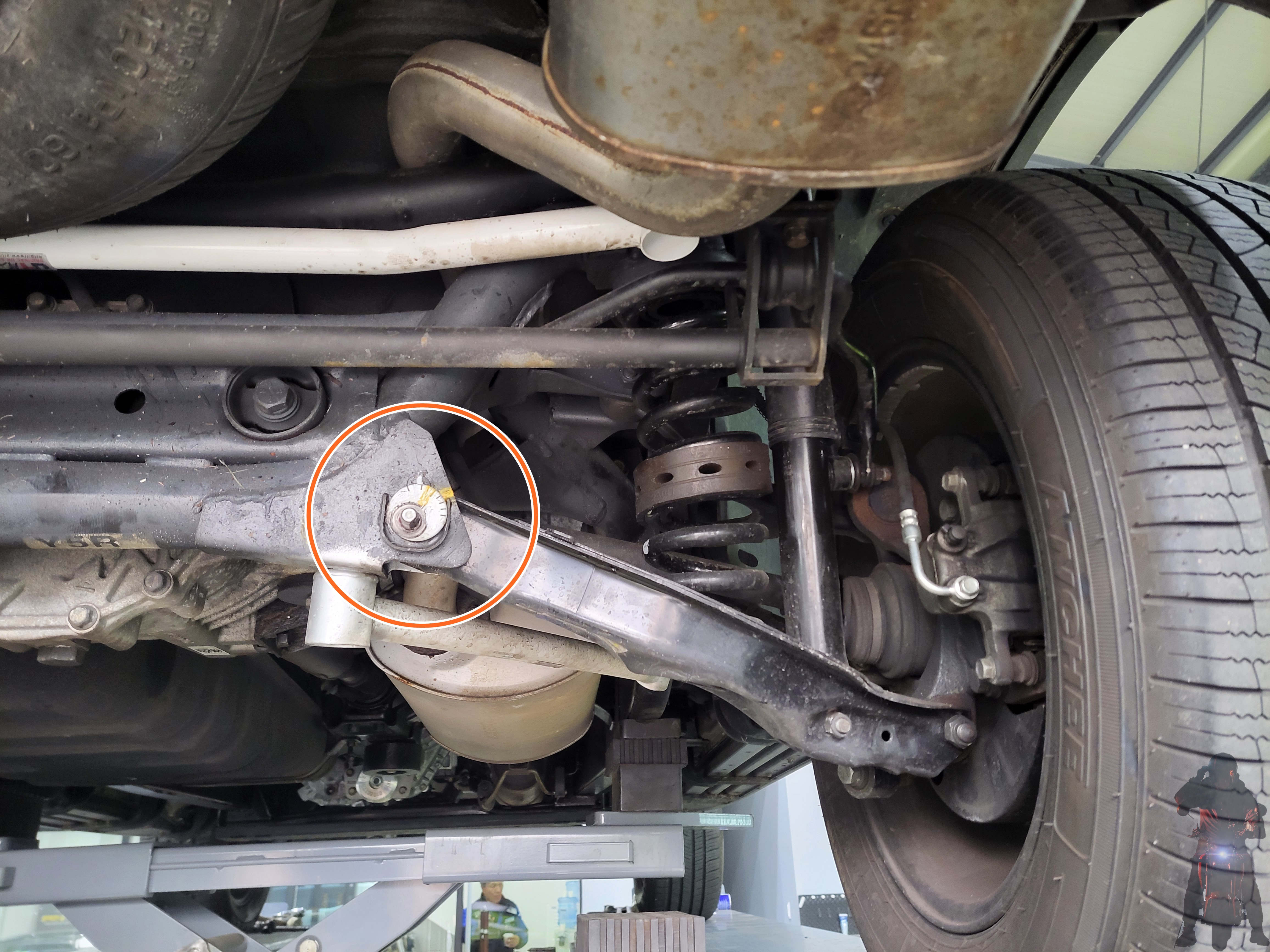 쌍용KGM모빌리티 렉스턴 W 차량의 로우암 안쪽 편심볼트너트는