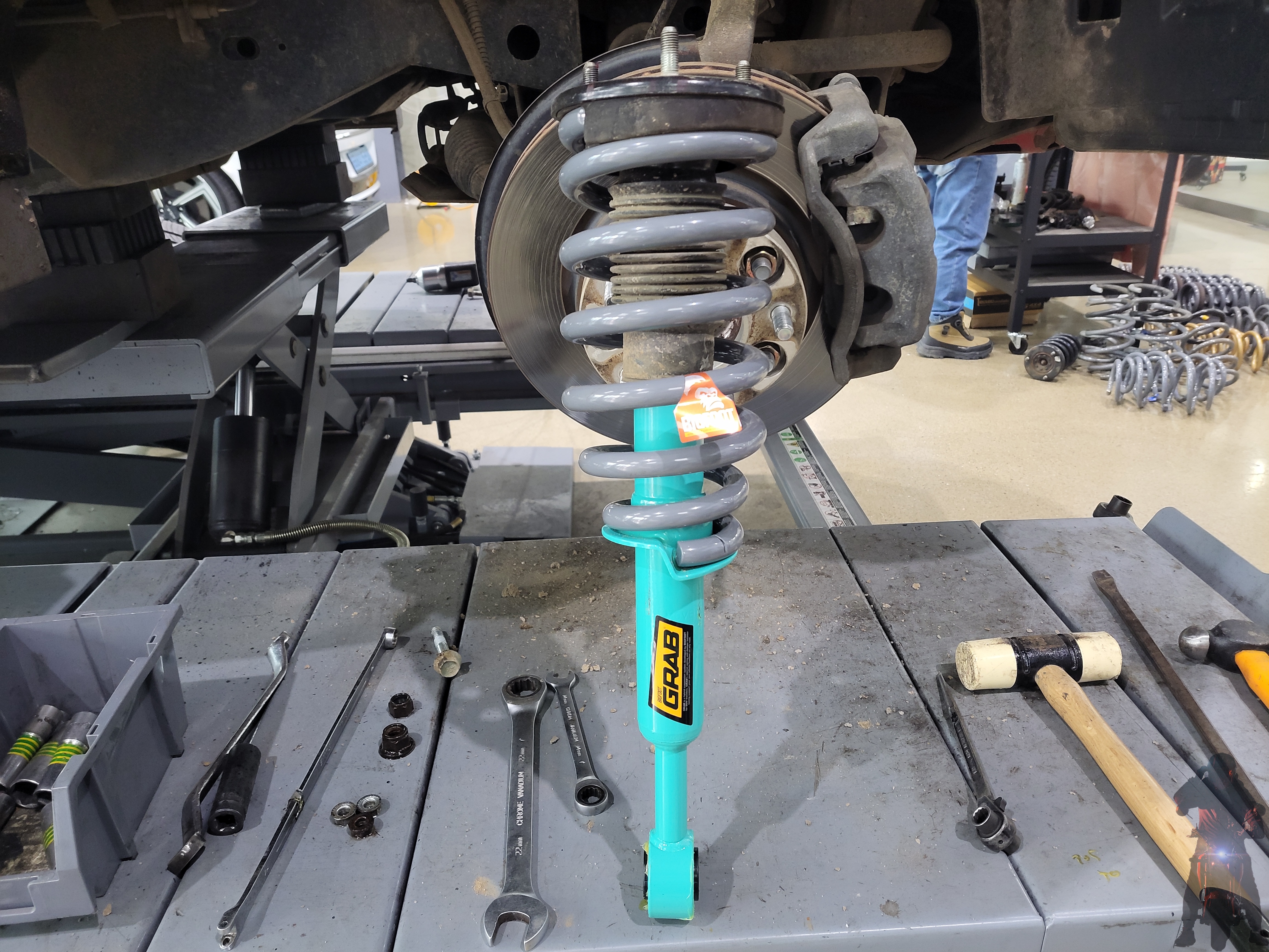 스프링 압축기에 쇼바를 고정하고 그랩쇼바와 빅풋스프링을