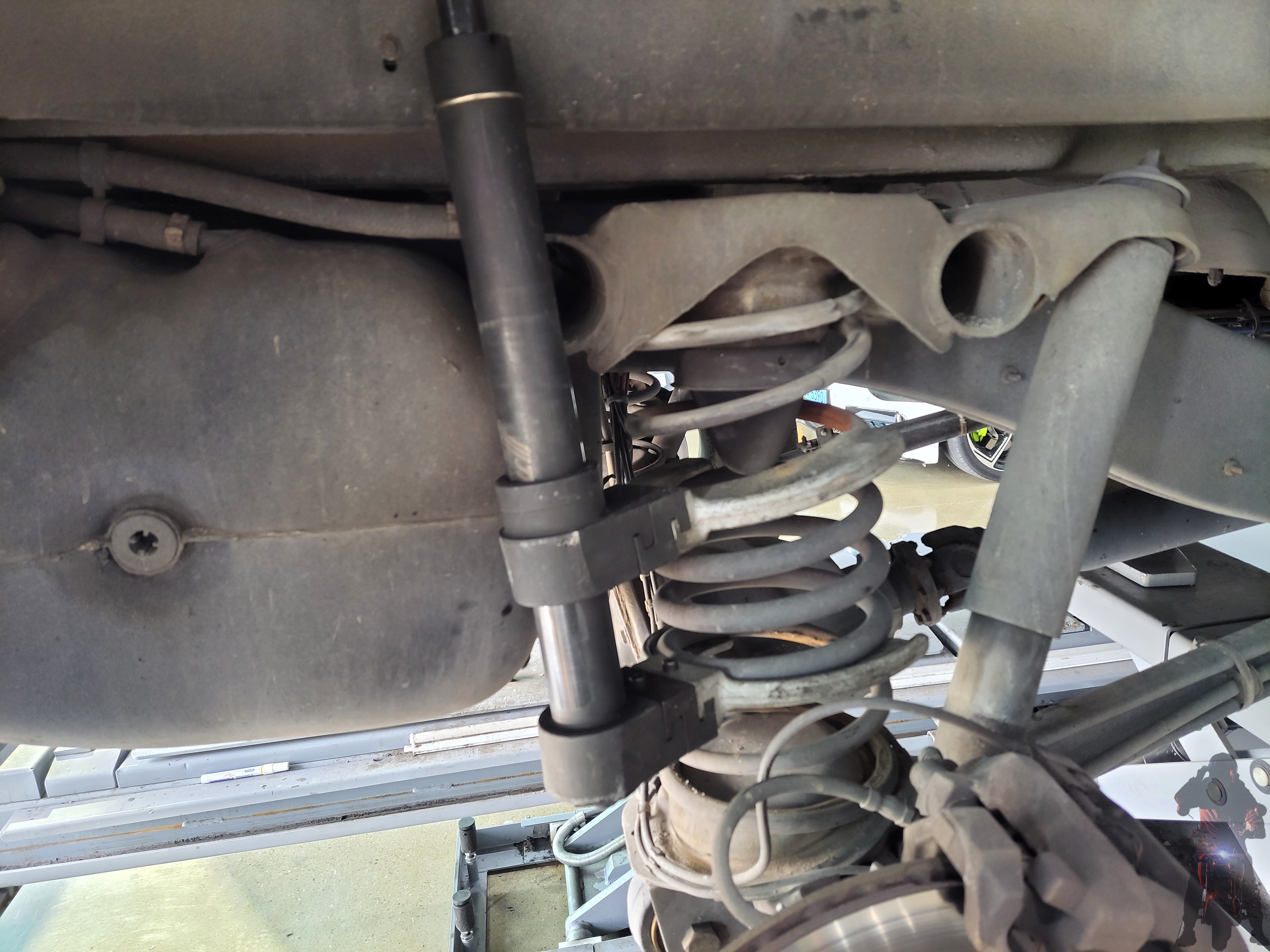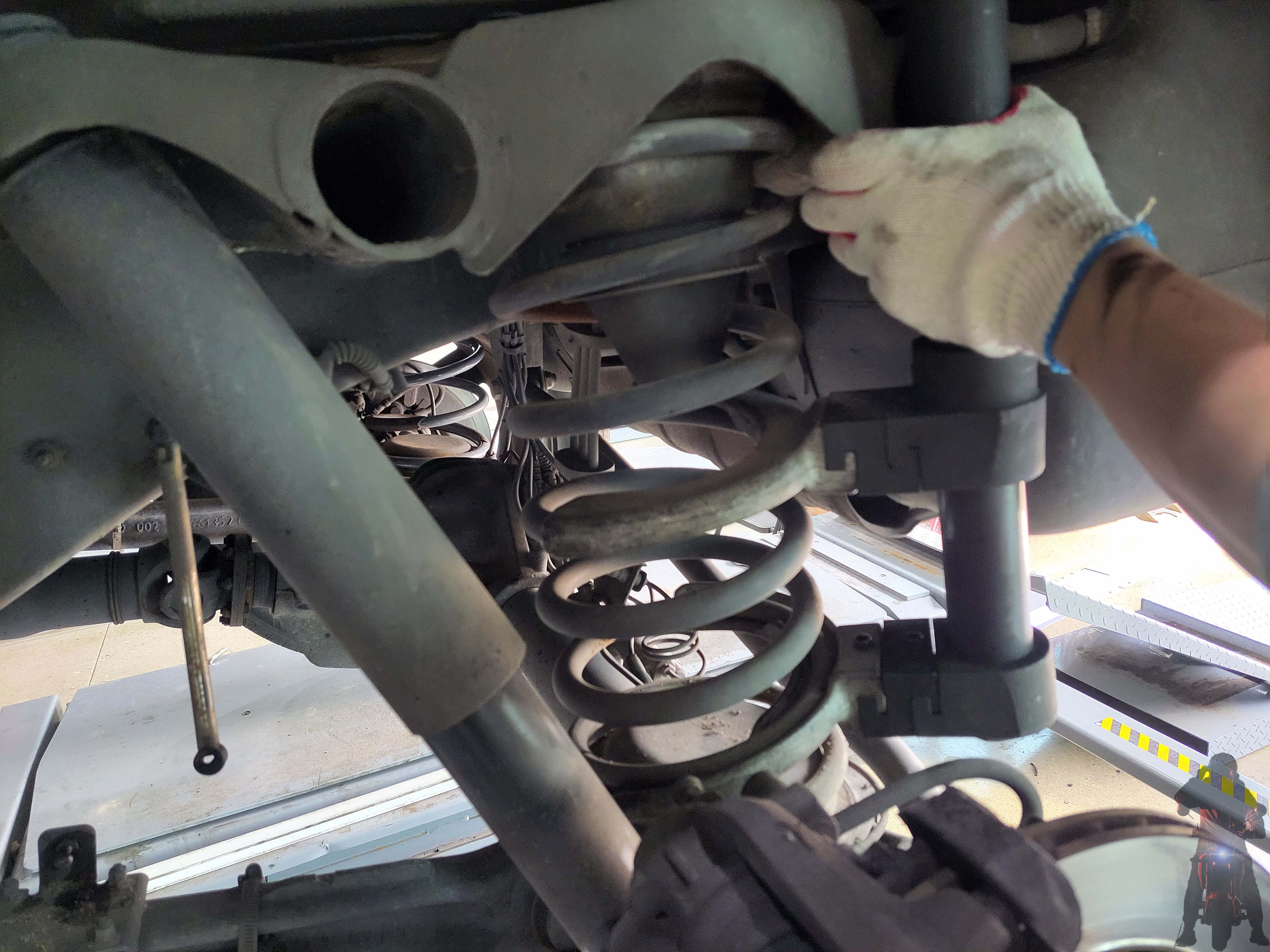 스프링 압축기를 이용하여 차량에 장착하고 있습니다