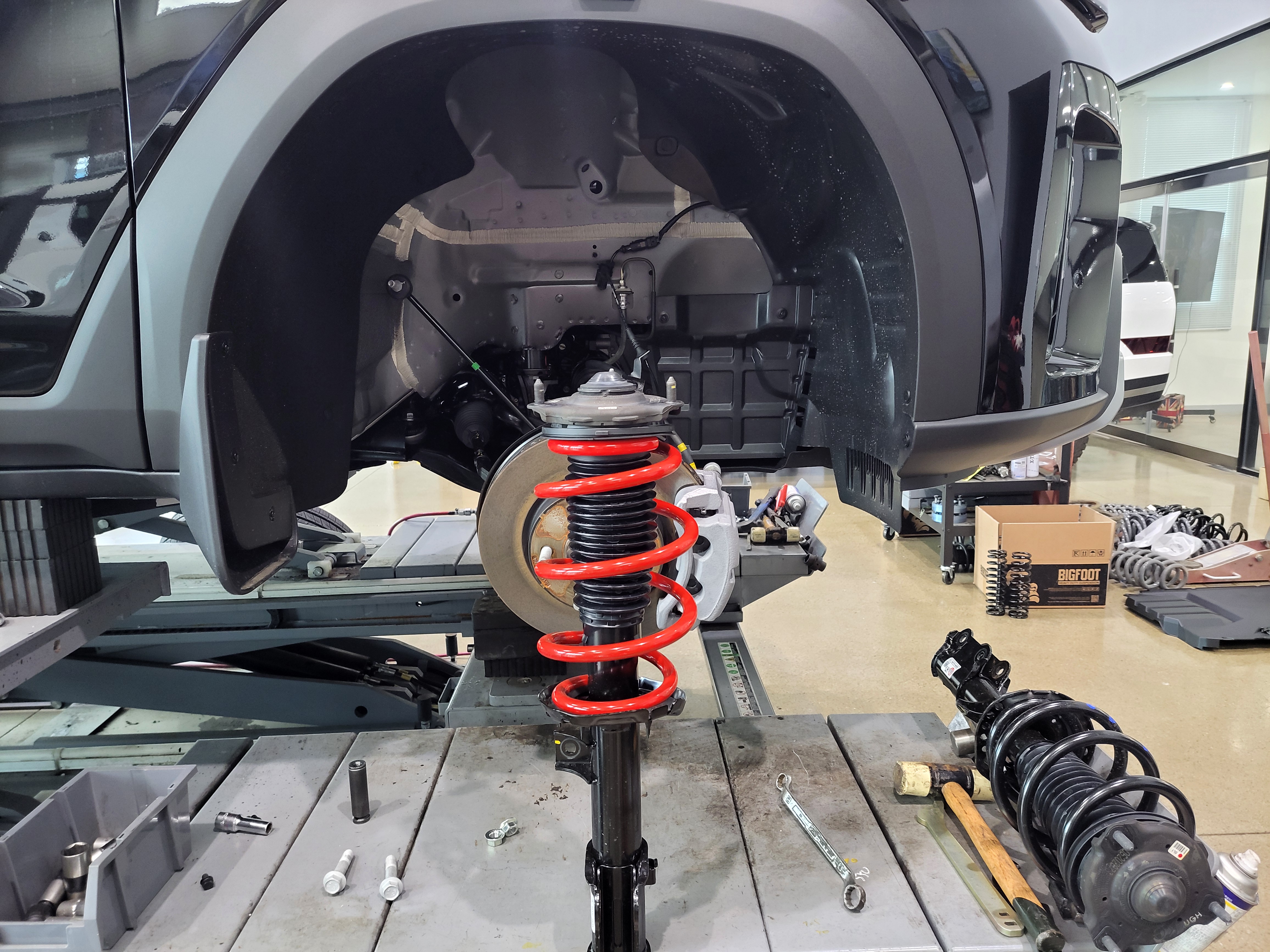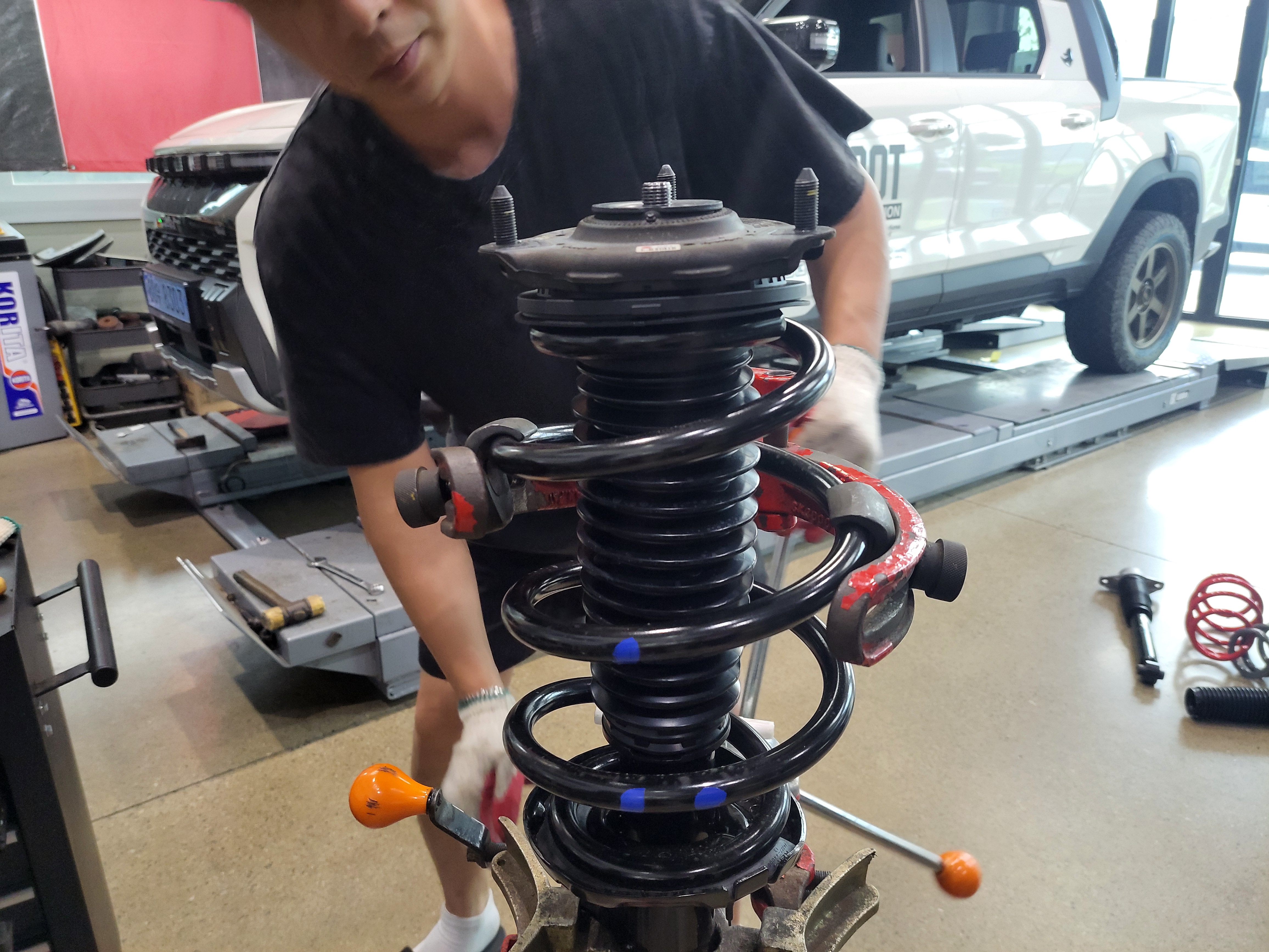 KGM 무쏘EV 4WD 차량의 순정스프링을 탈거하고 있습니다