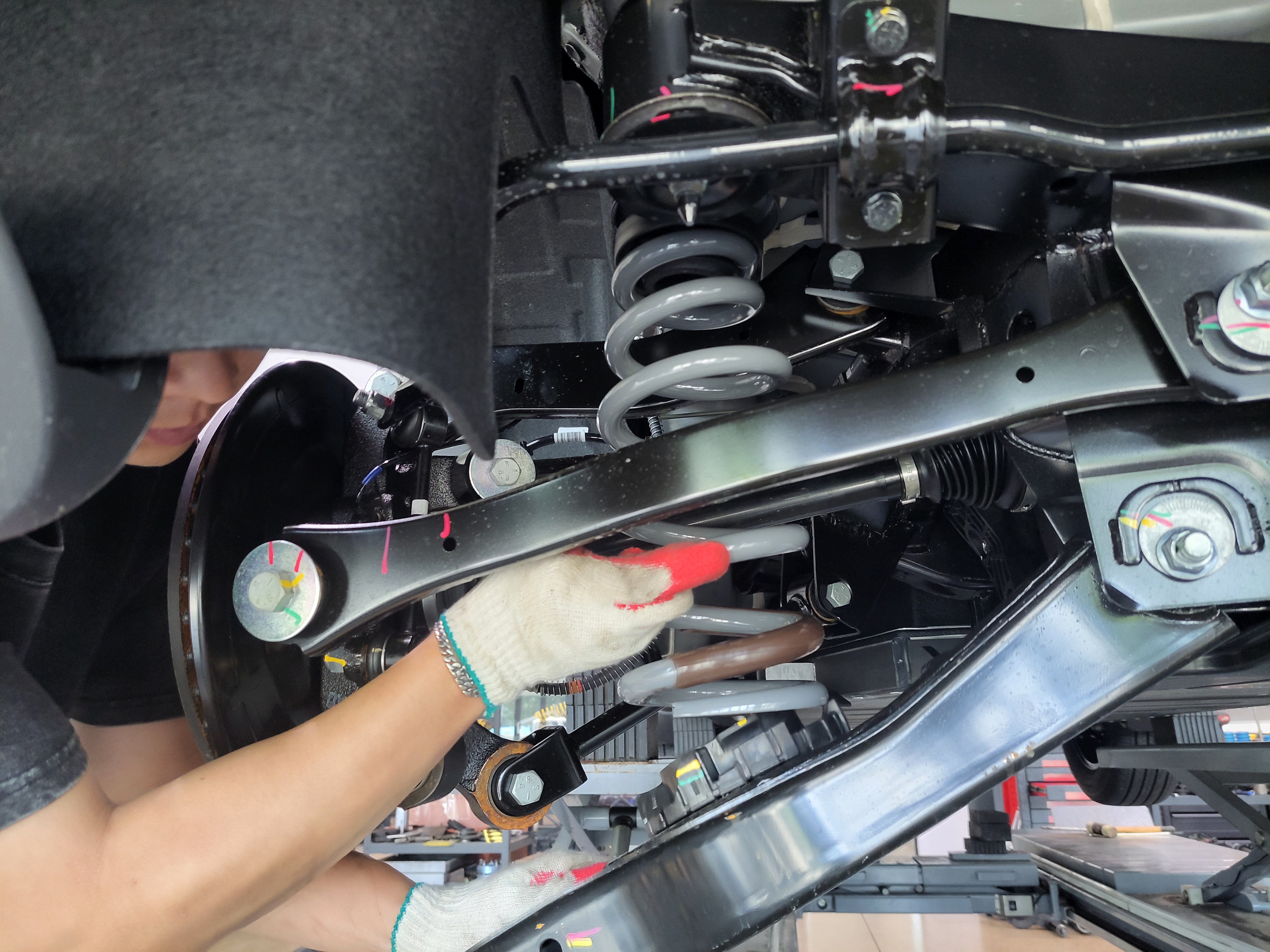 KGM 무쏘EV 4WD 차량에 리어스프링을 장착하고 있습니다