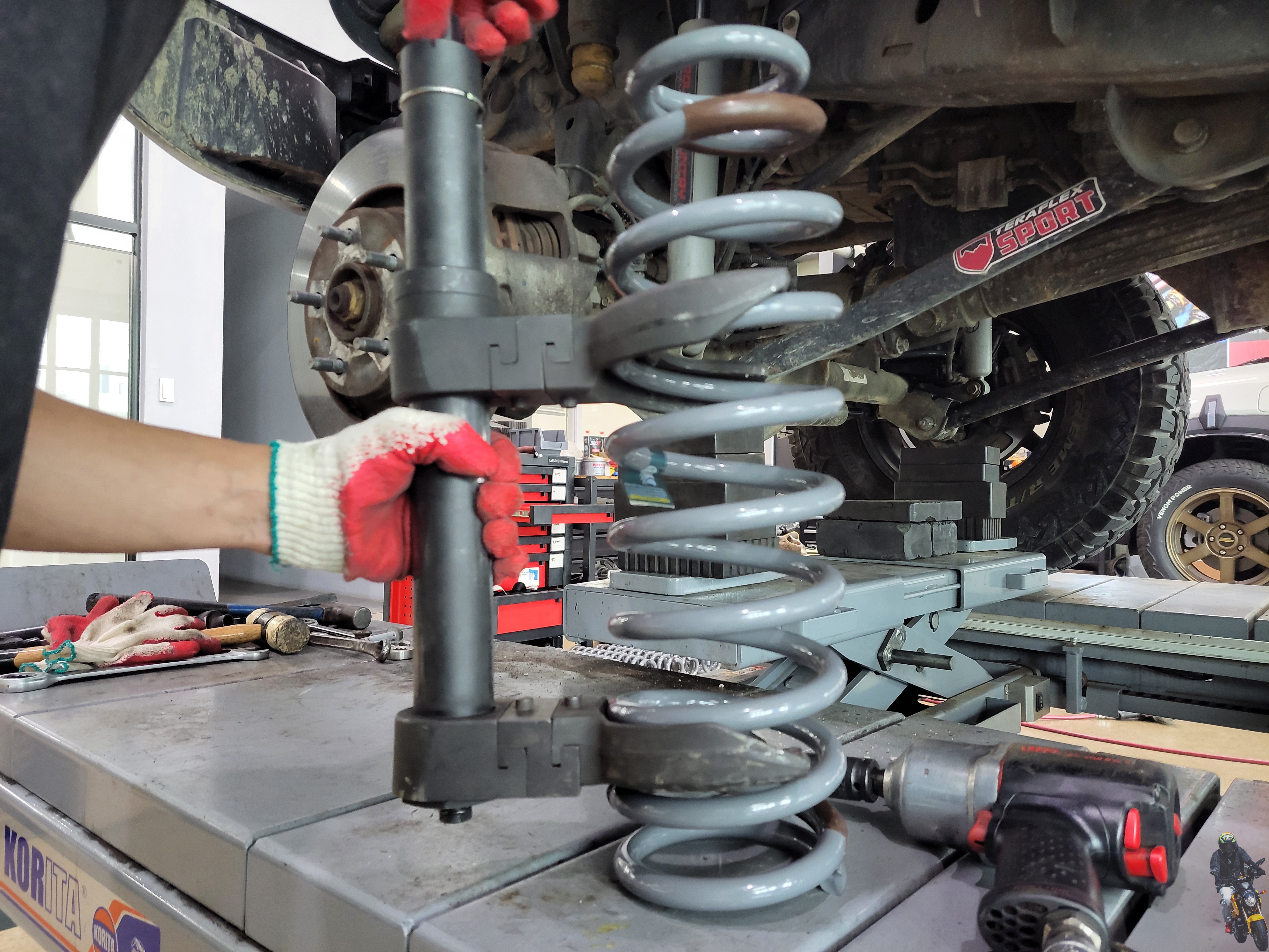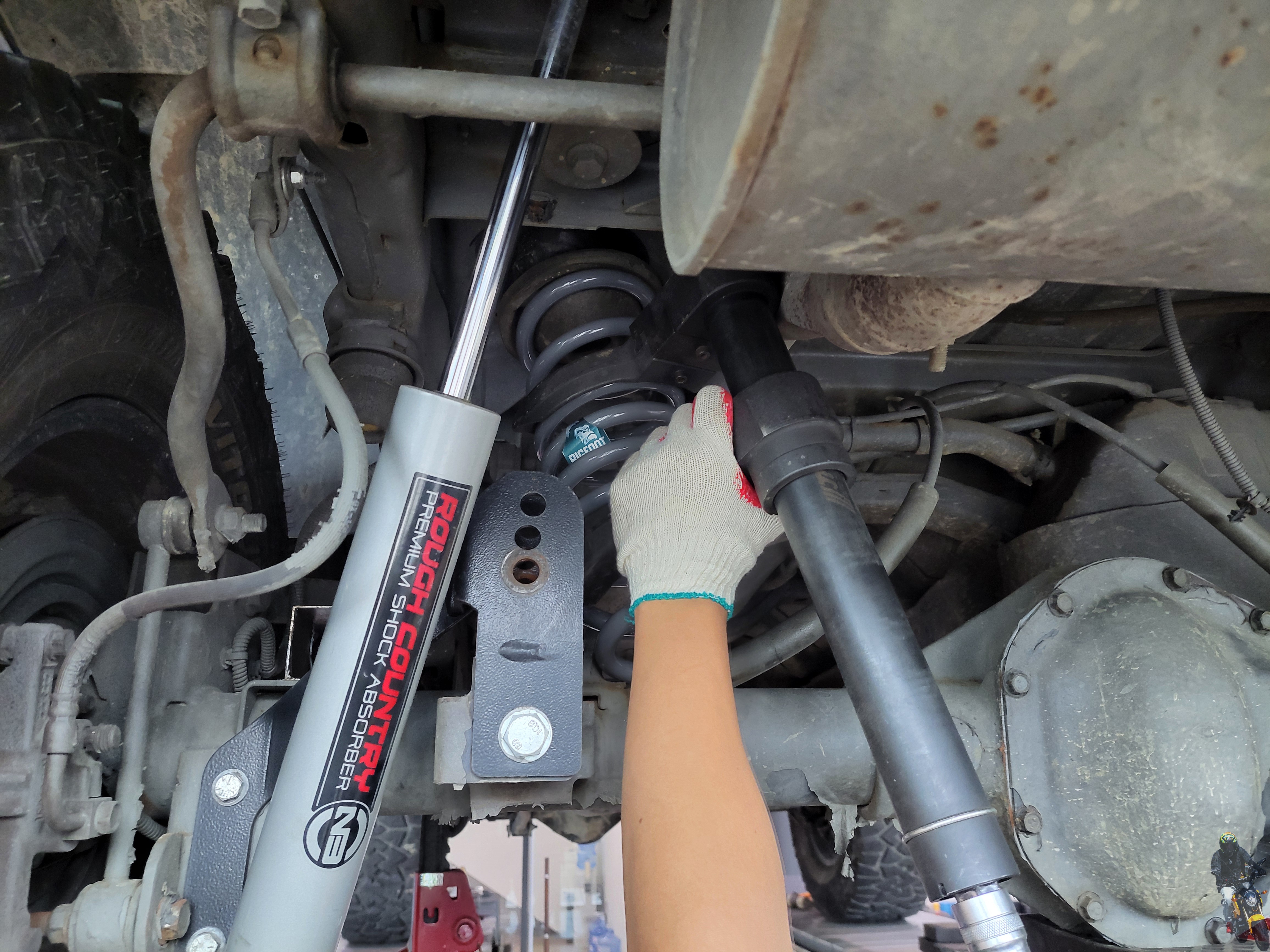스프링을 압축하여 빅풋스프링을 장착하고 있습니다