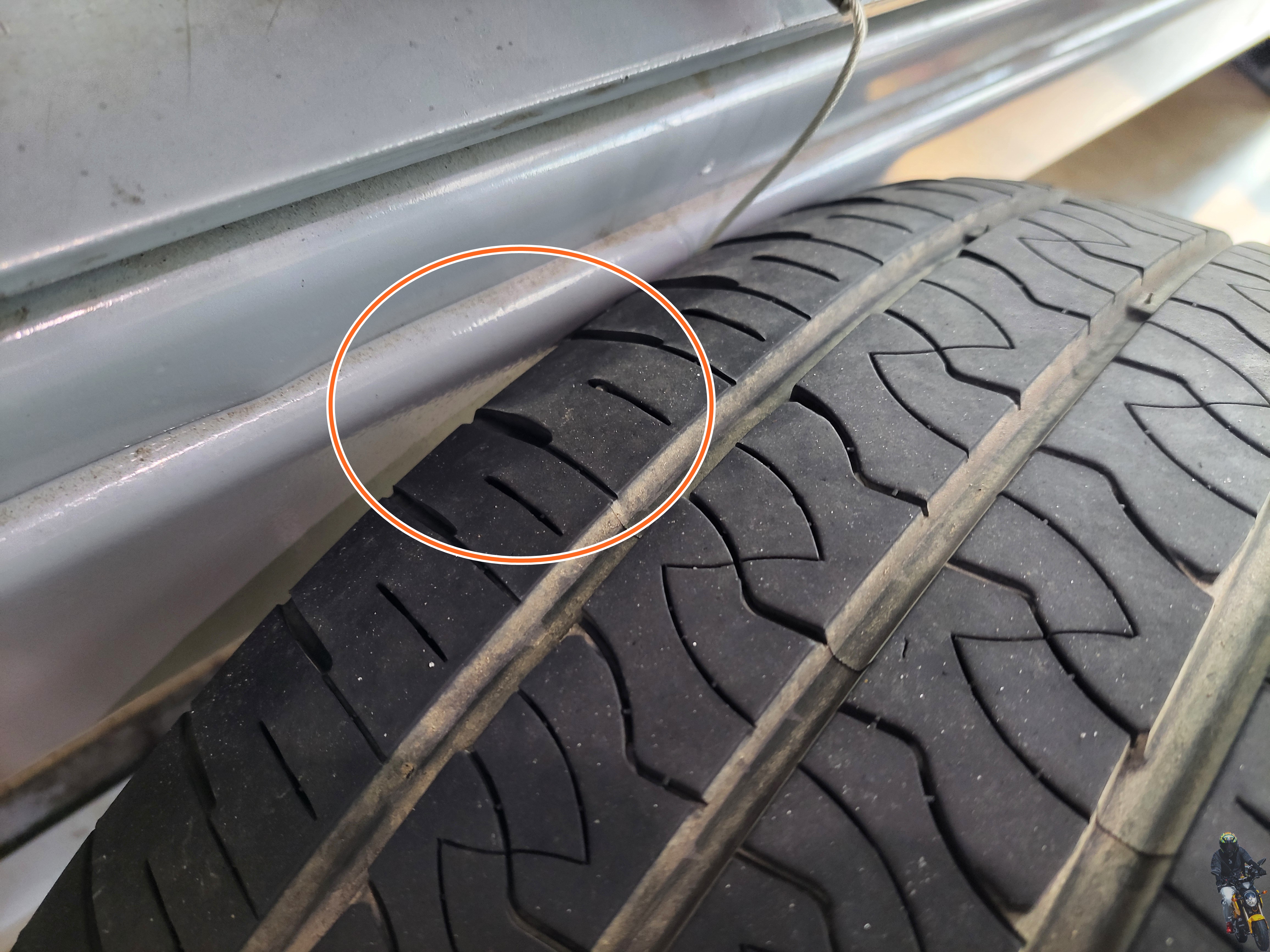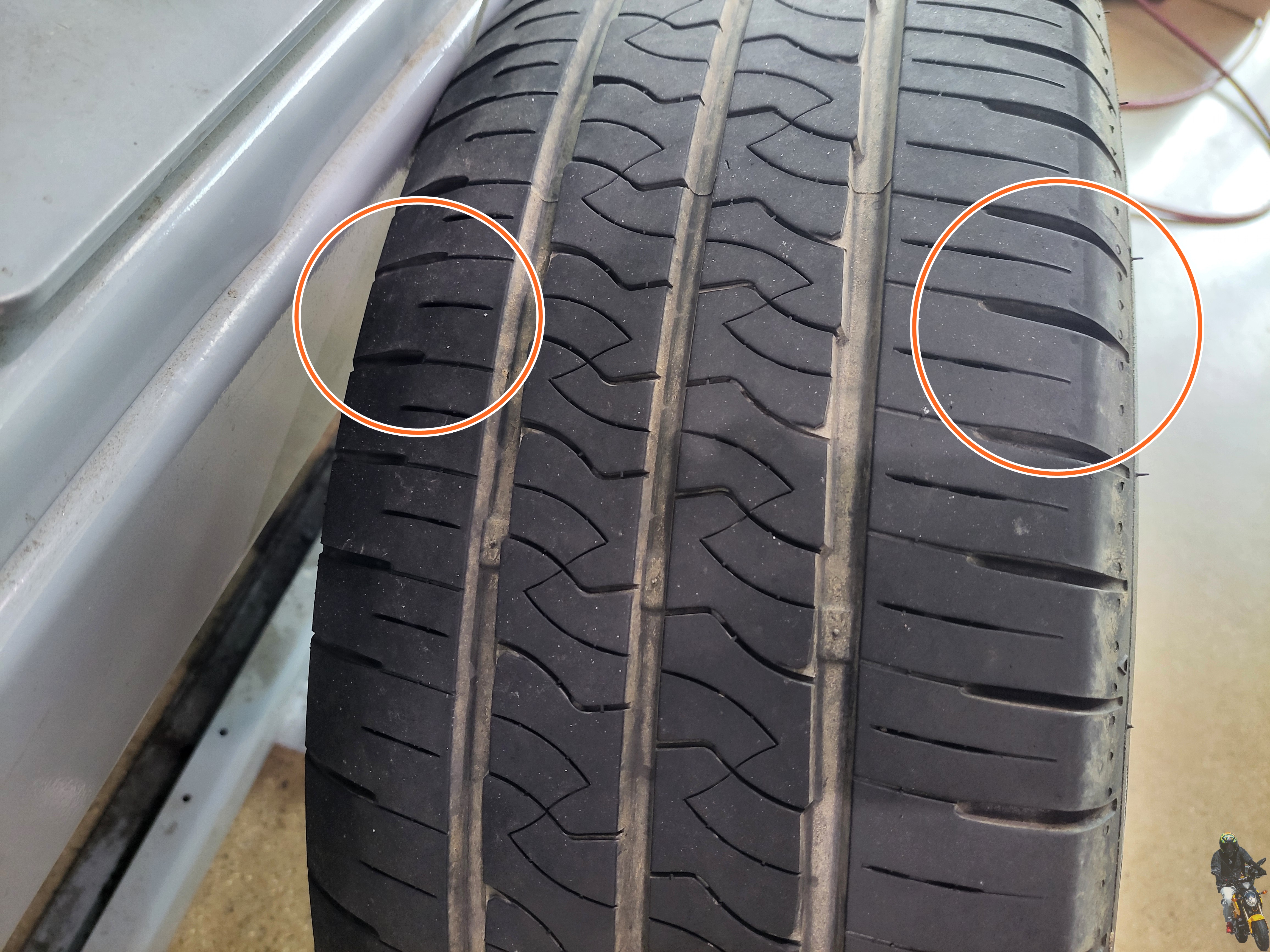 타이어를 확인해 보니 안쪽 편마모에 타이어 날이 섰습니다