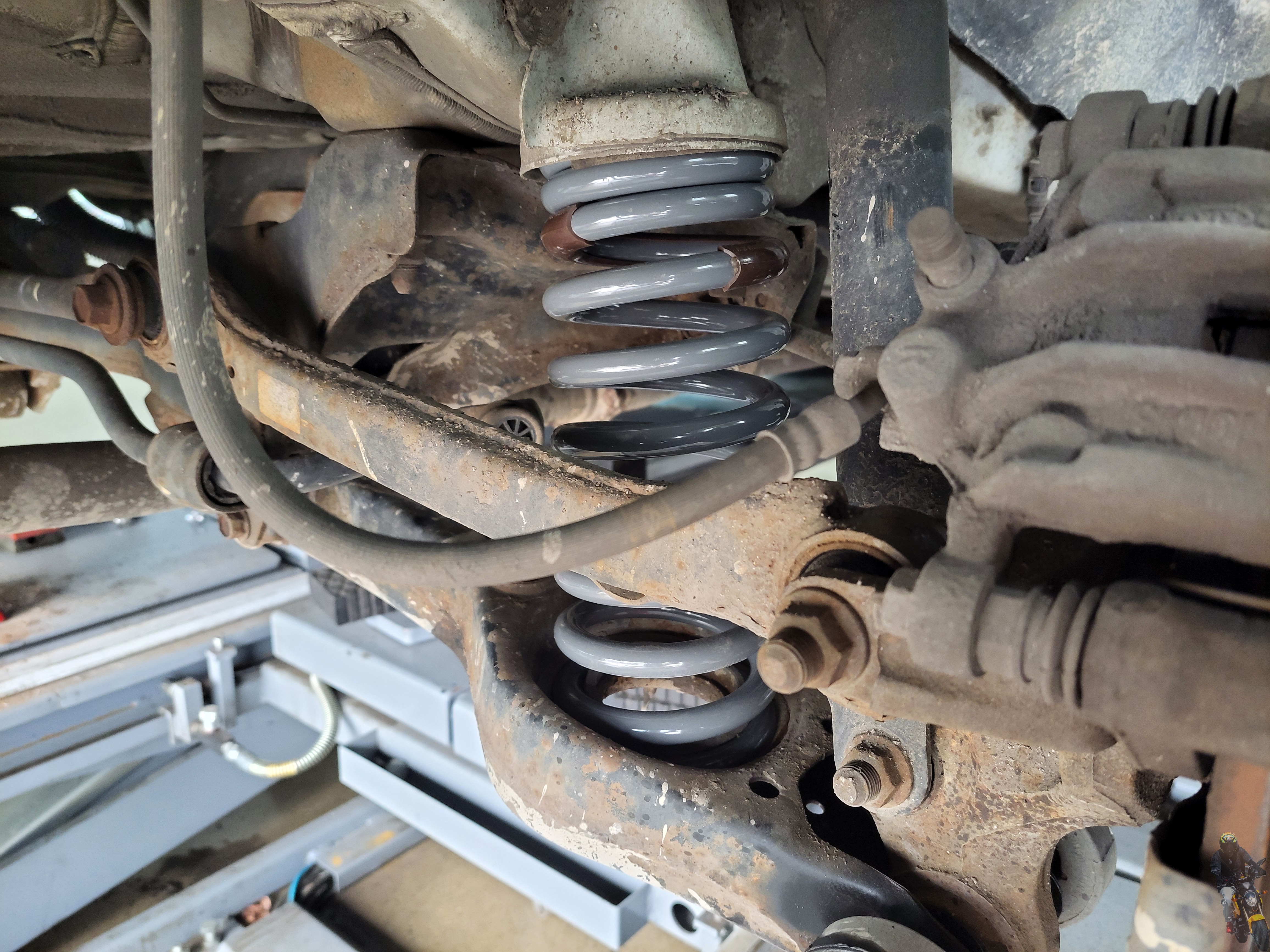 차량을 리프트에 올리고 프런트 쇼바스프링을 확인해
