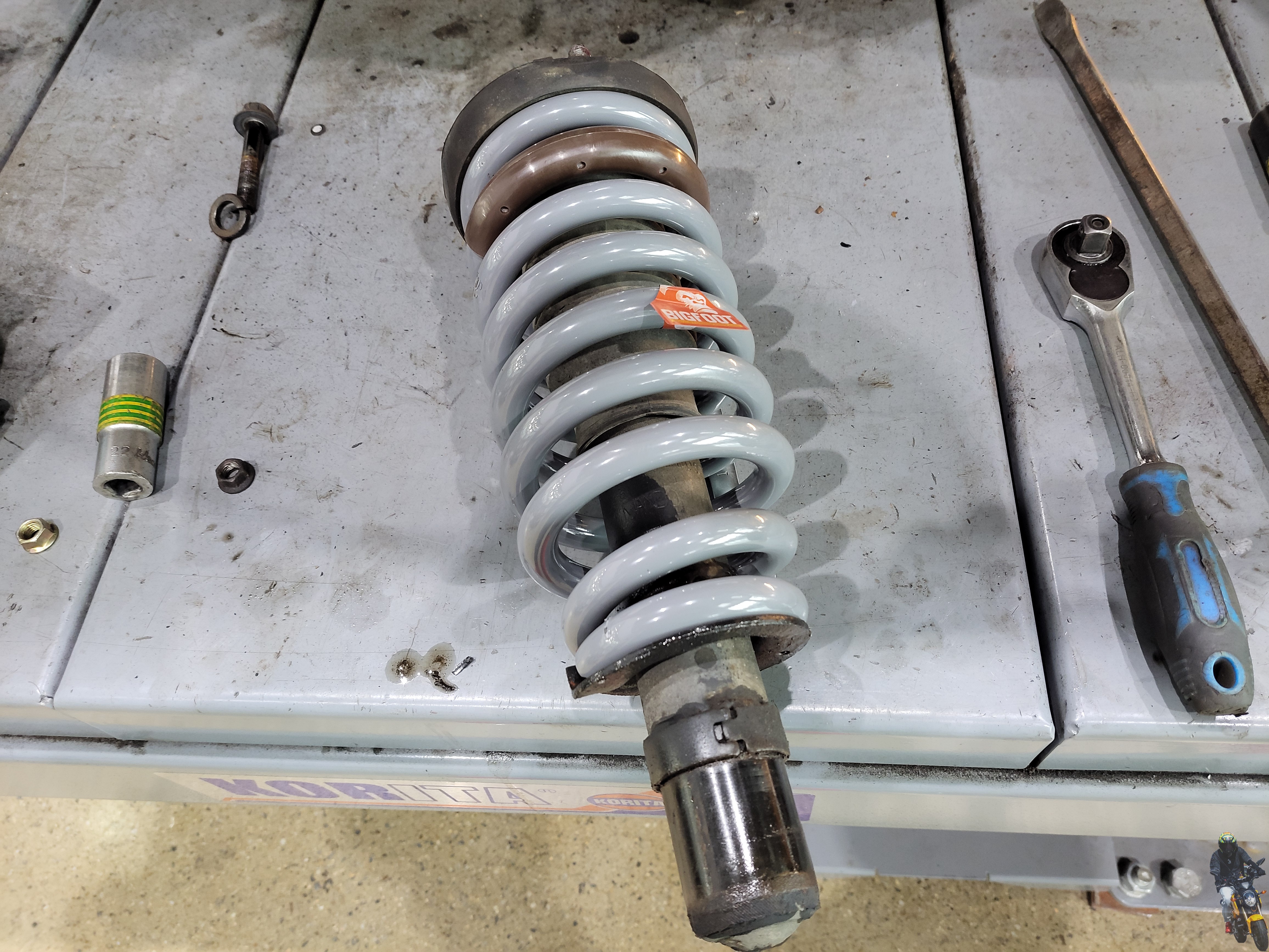 스프링 압축기에 쇼바를 고정하고 빅풋스프링 장착을 하고 있습니다