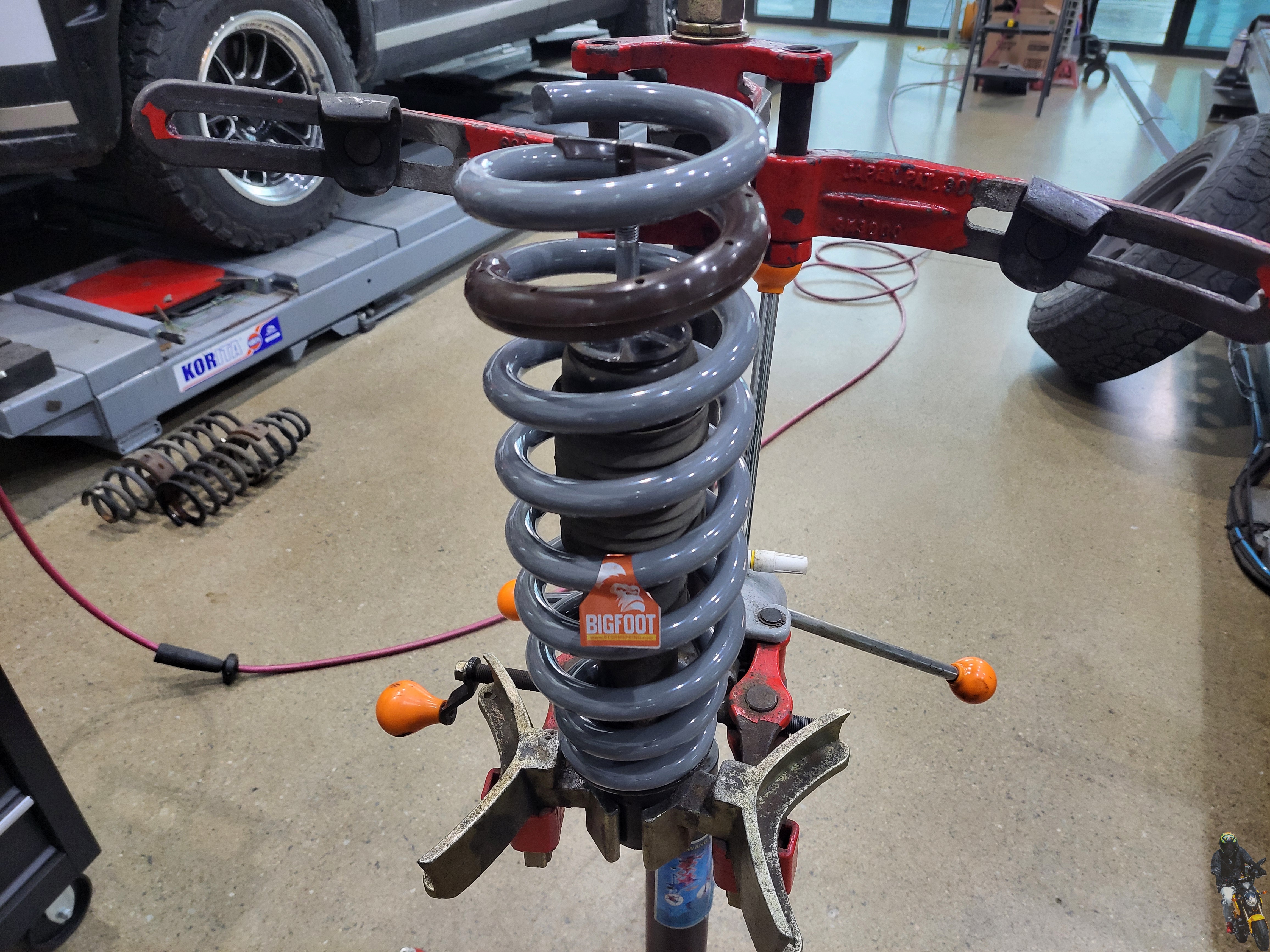 스프링 압축기를 이용해서 빅풋스프링을 차량에 장착하고 있습니다