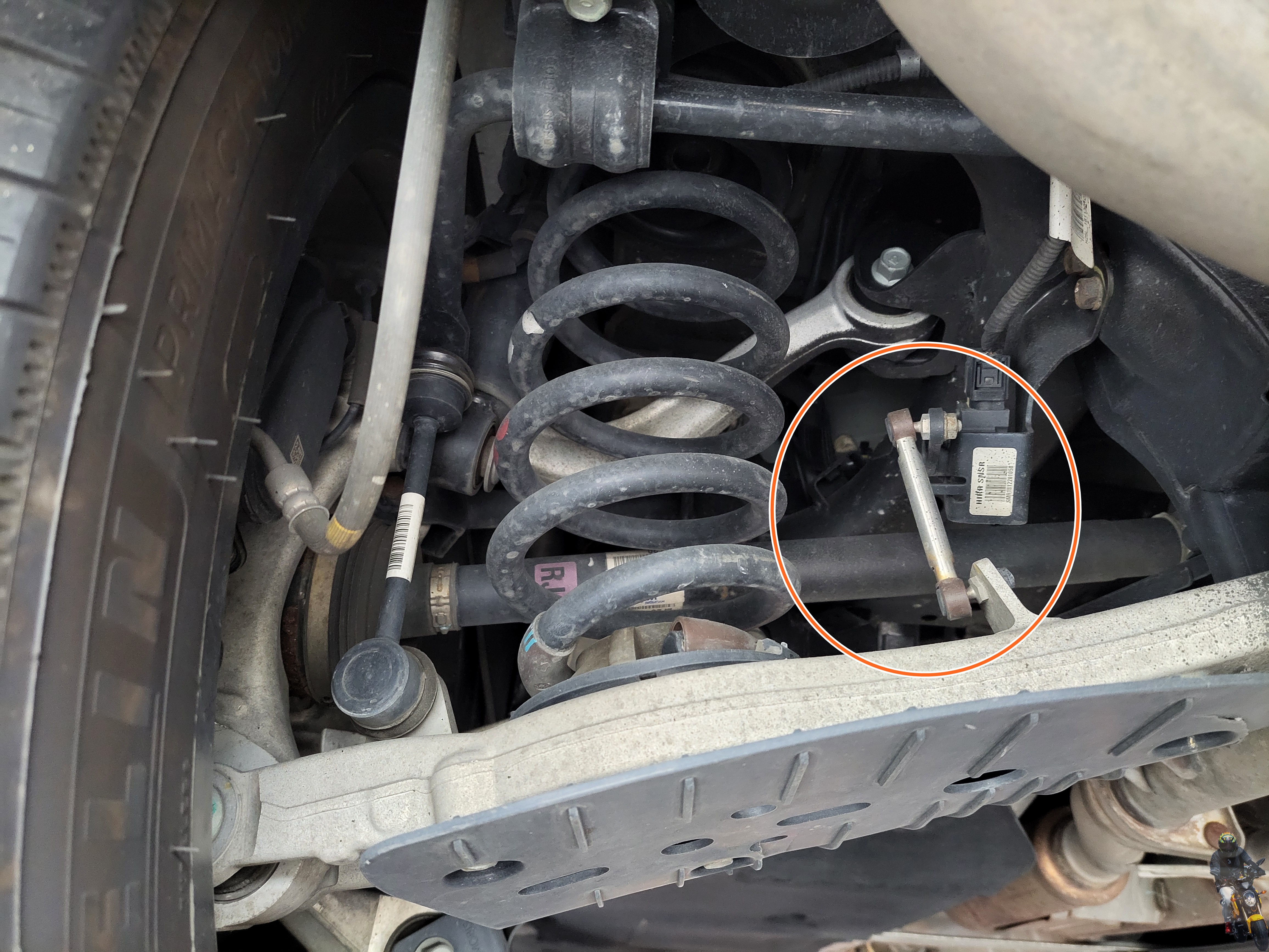 운전석 리어 스프링 옆에는 이렇게 라이트 조사각 레벨 센서가