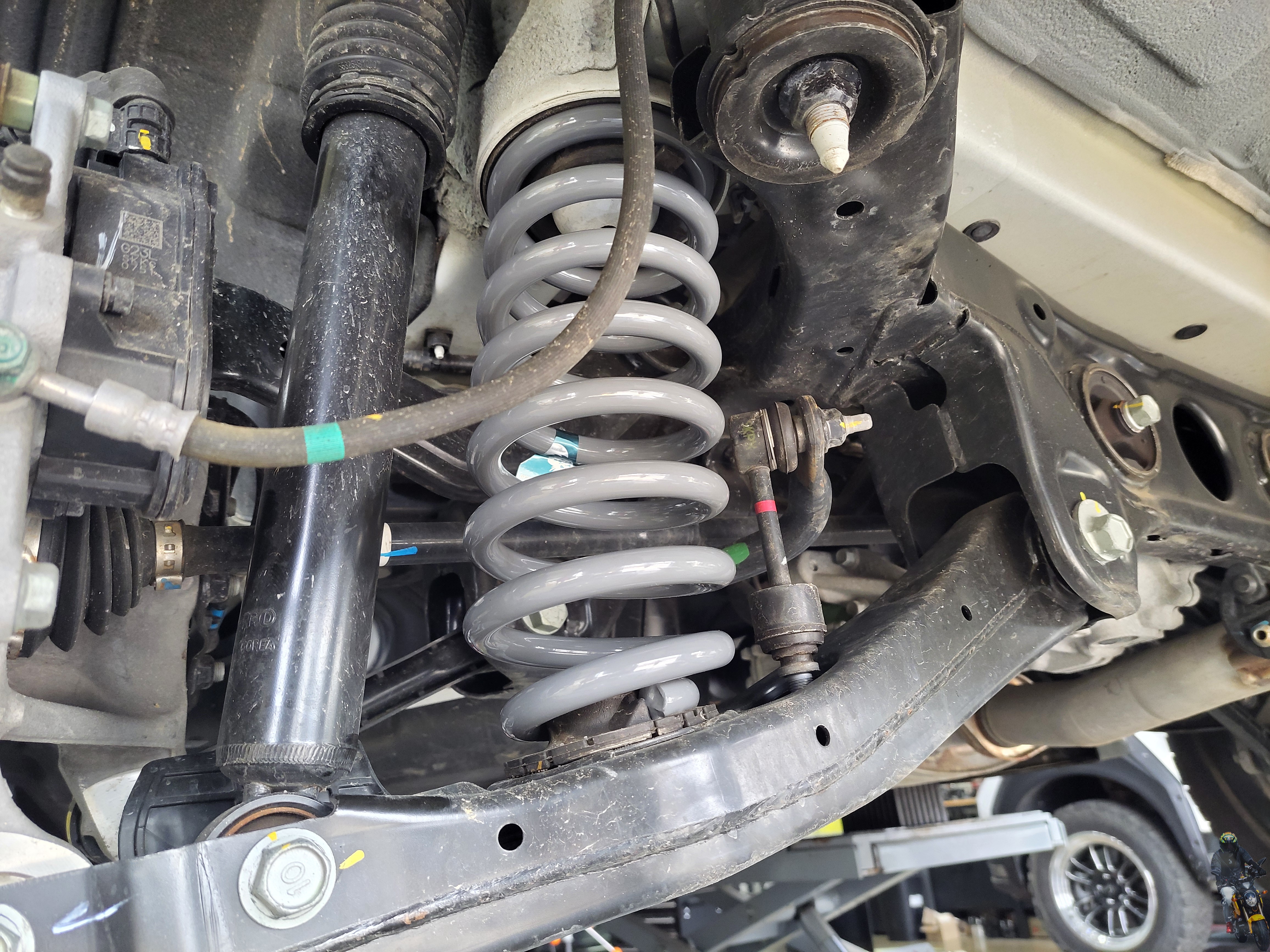 싼타페 MX5 차량의 리어 쇼바와 스프링의 모습입니다
