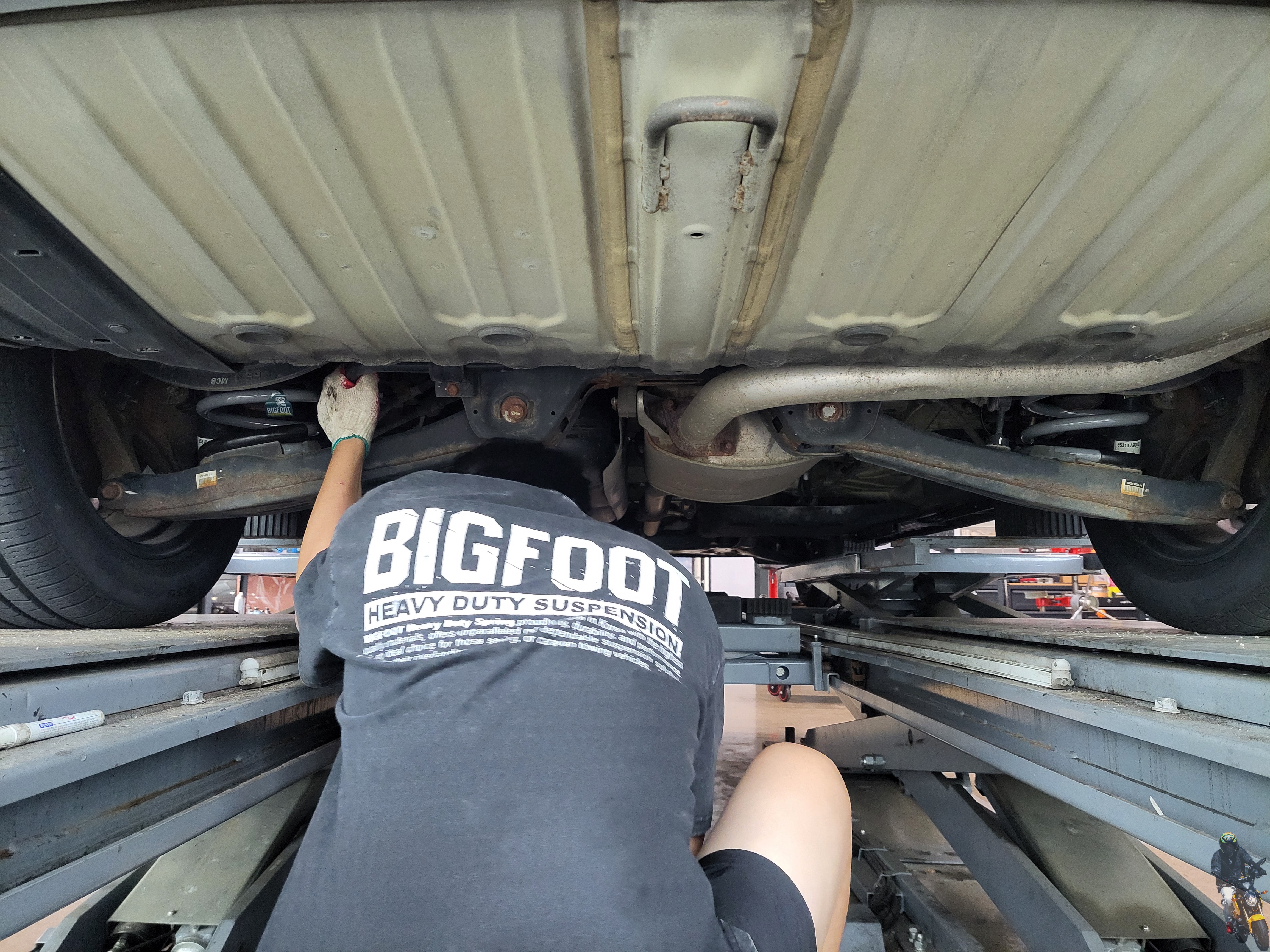 빅풋스프링을 차량에 장착하고 볼트너트를 조이고 있습니다