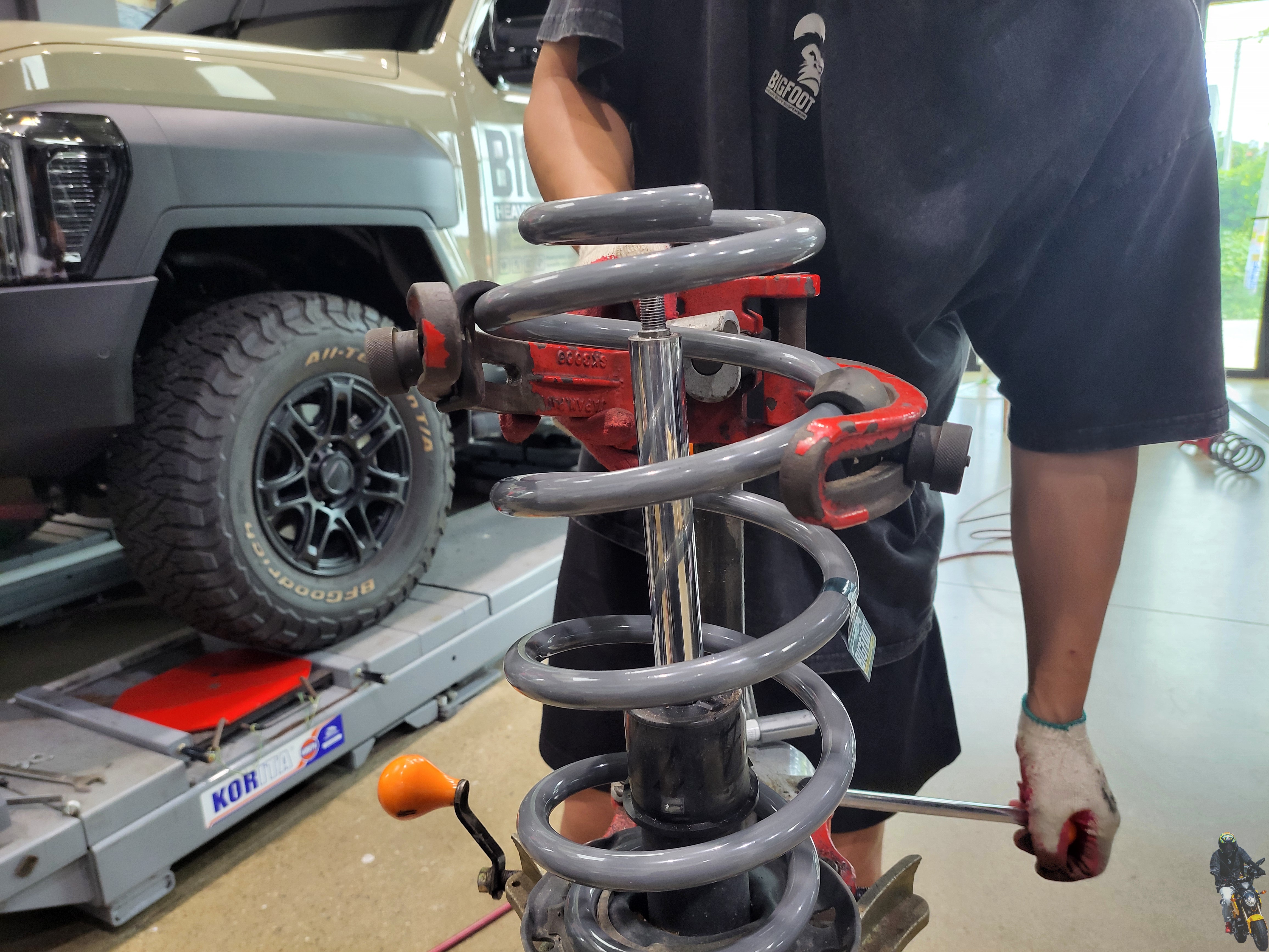 빅풋스프링을 순정 쇼바에 안착을 시키고 스프링을 압축하고 있습니다