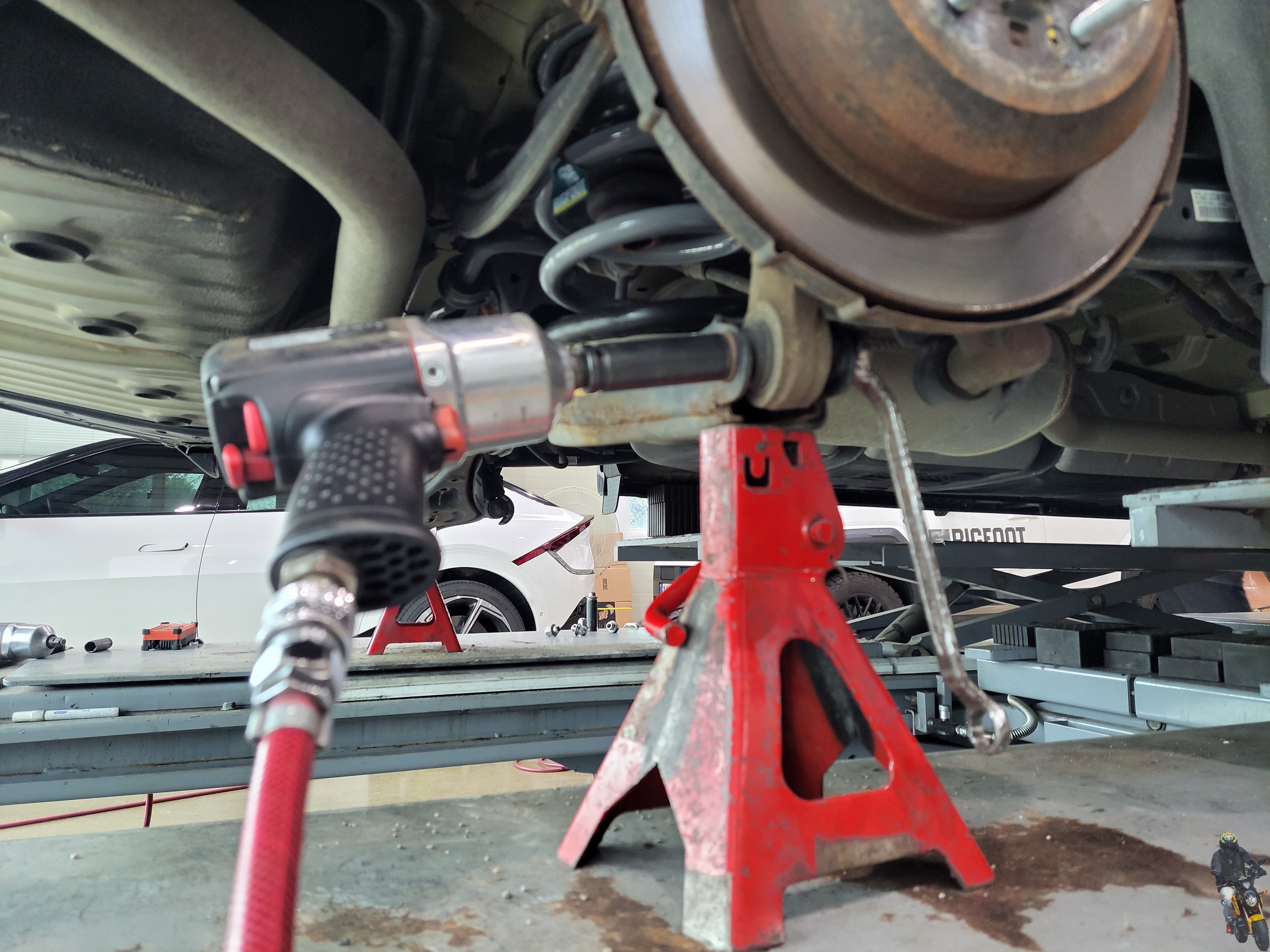 휠타이어를 탈거하고 순정쇼바를 탈거하려고 준비하고 있습니다