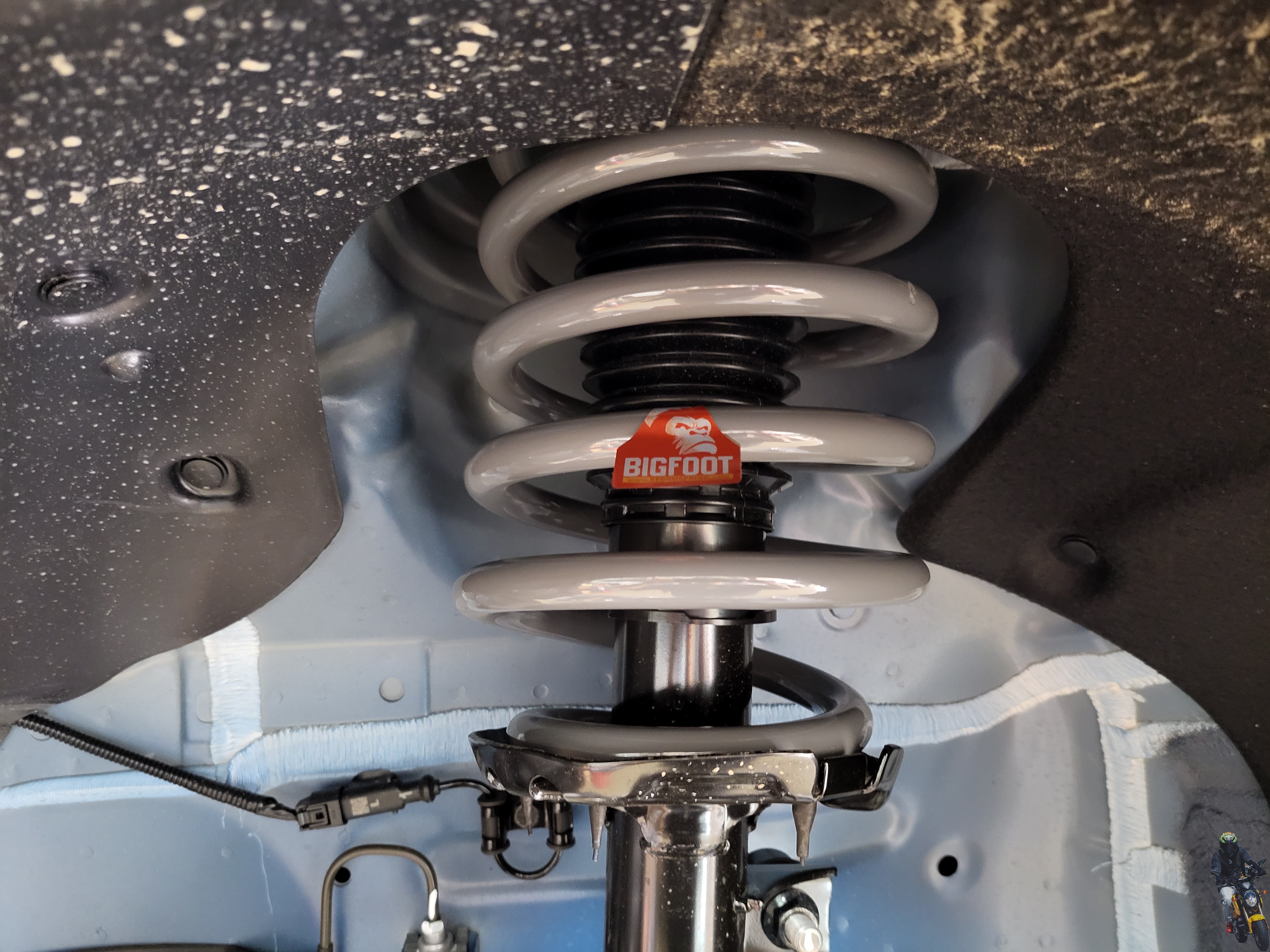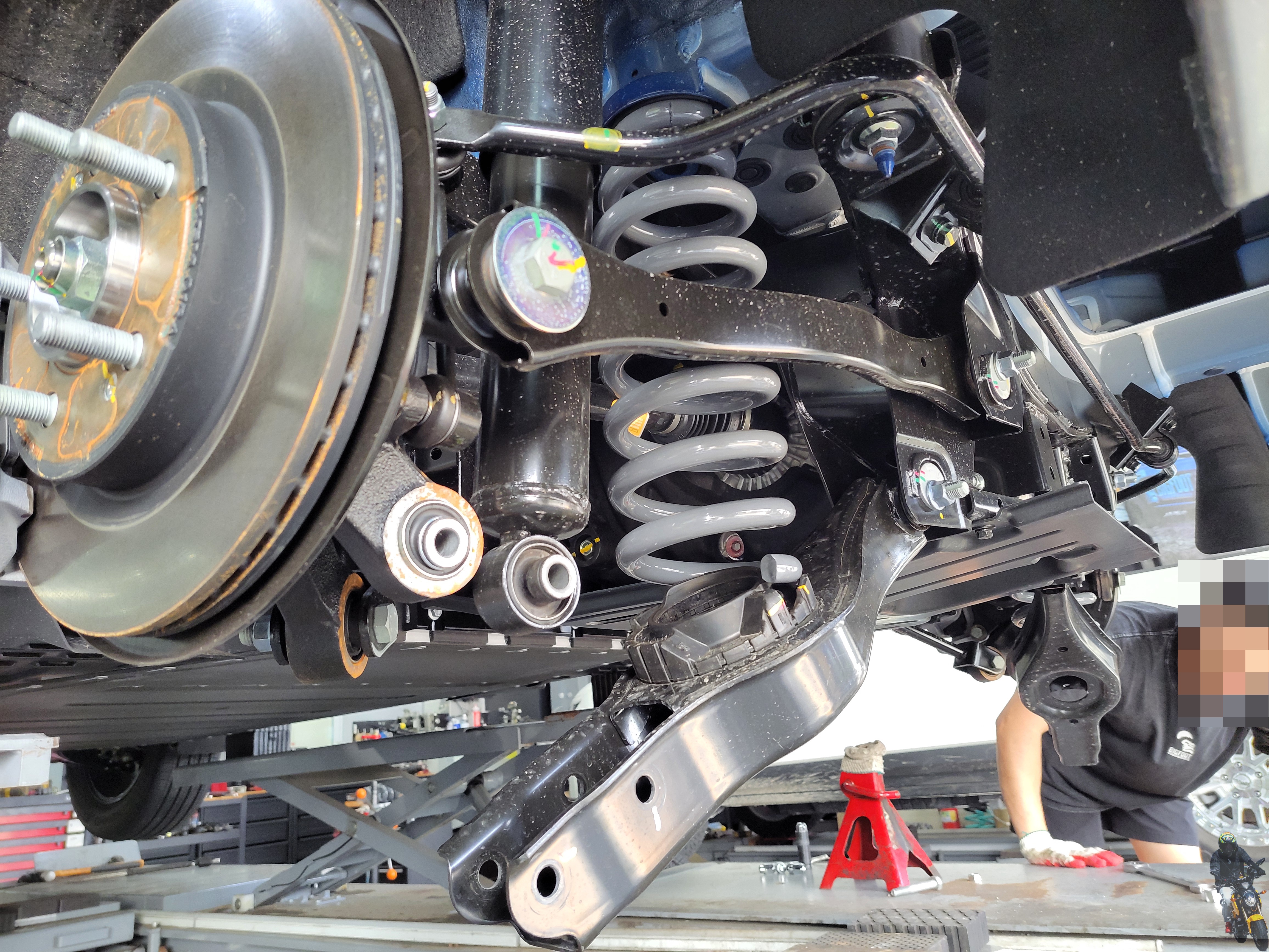 순정쇼바에 조립된 빅풋스프링을 차량에 장착하고 있습니다