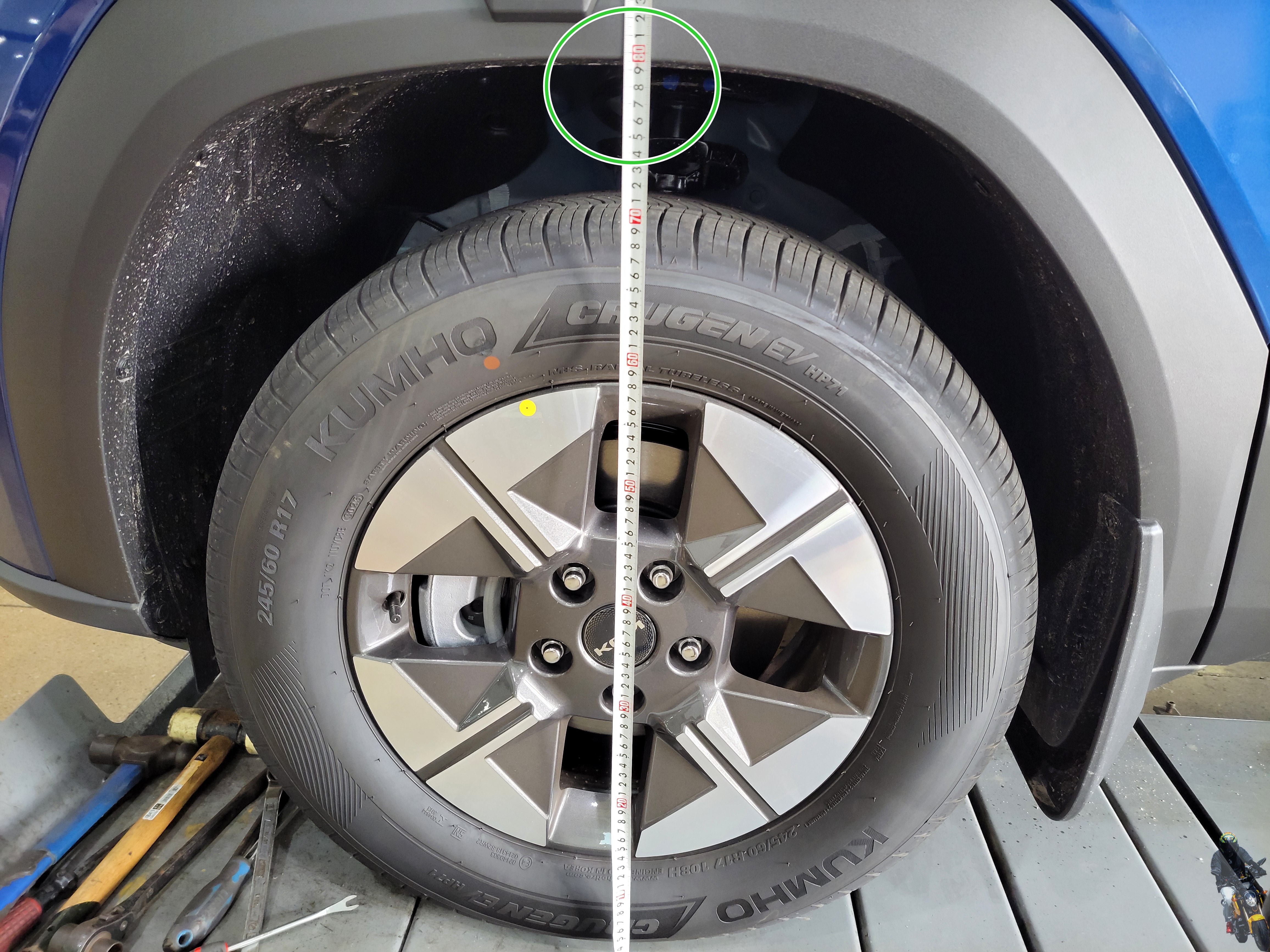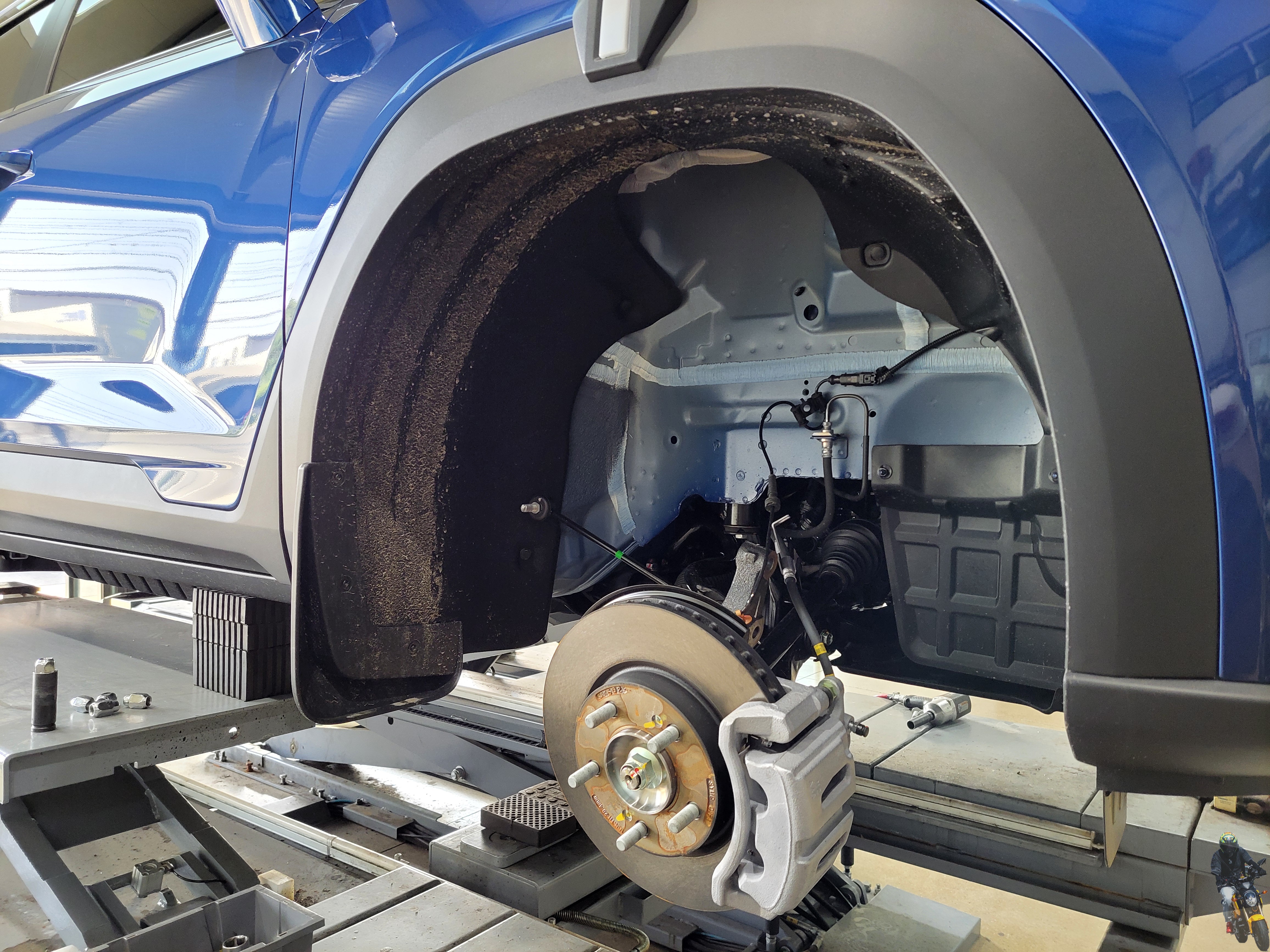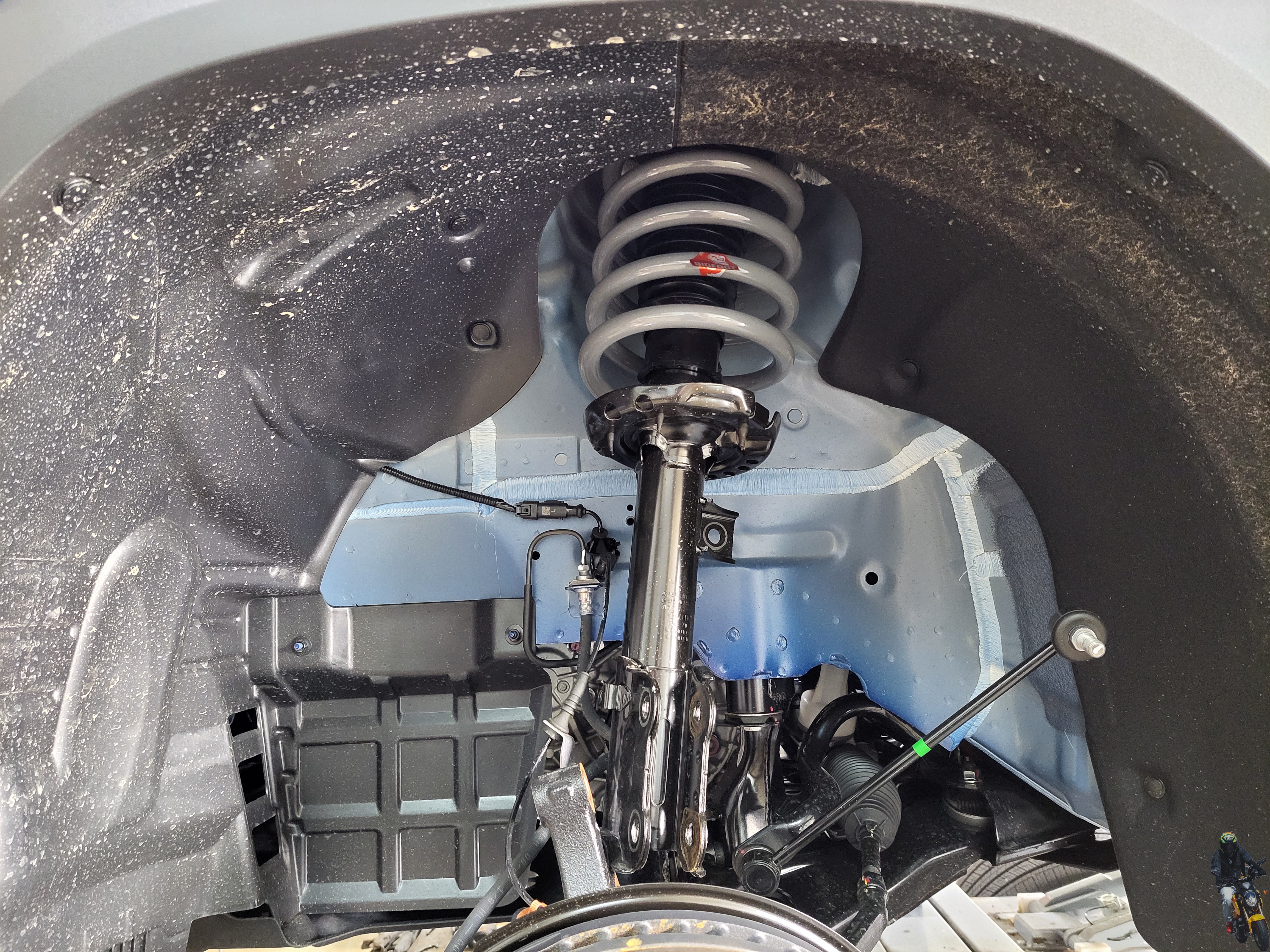 무쏘EV 차량의 프런트 쇼바스프링이 탈거된 휠하우스의 모습입니다