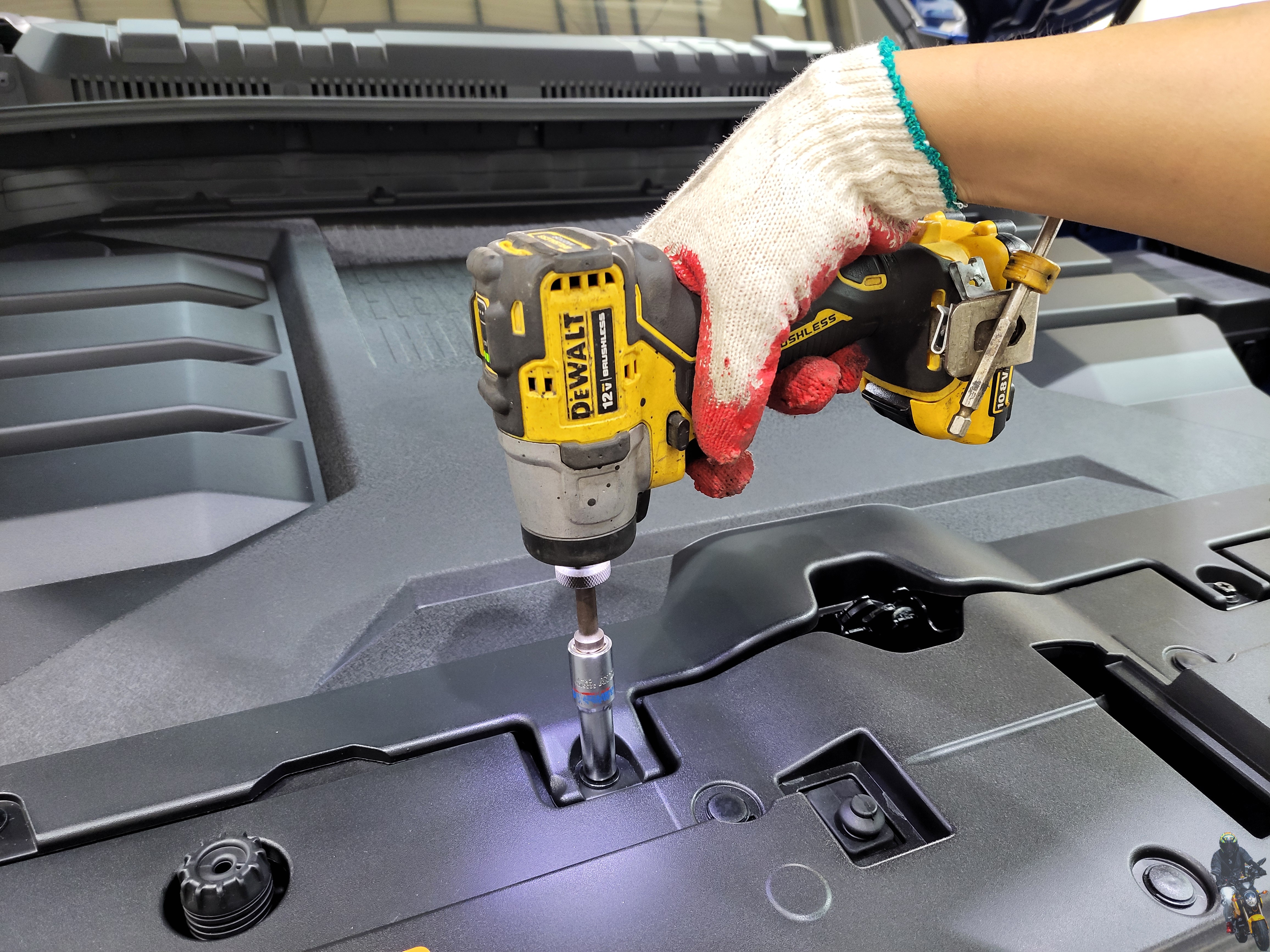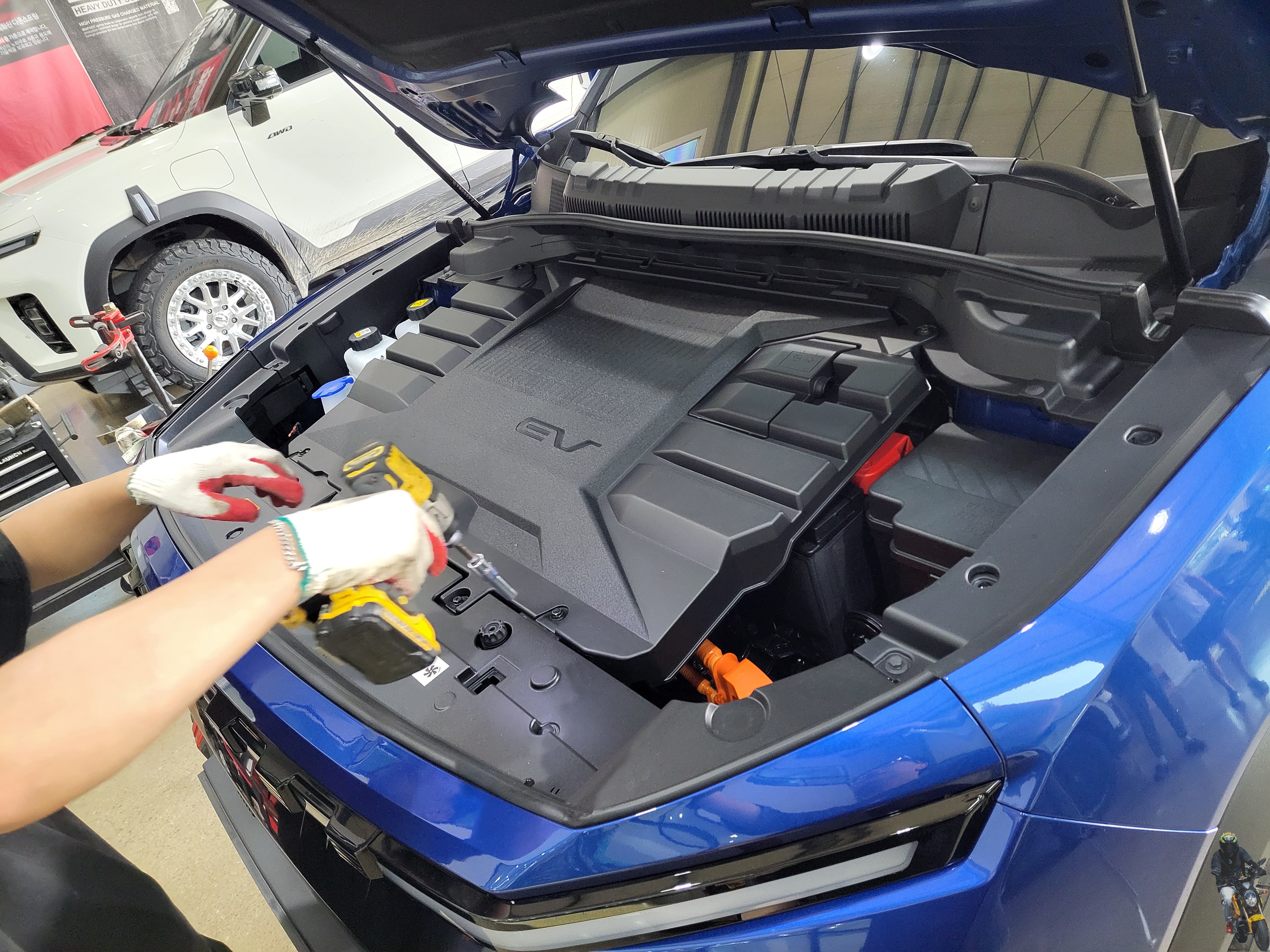 빅풋스프링 장착을 모두 마치고 본넷 안쪽 플라스틱 커버를 조립하고 있습니다