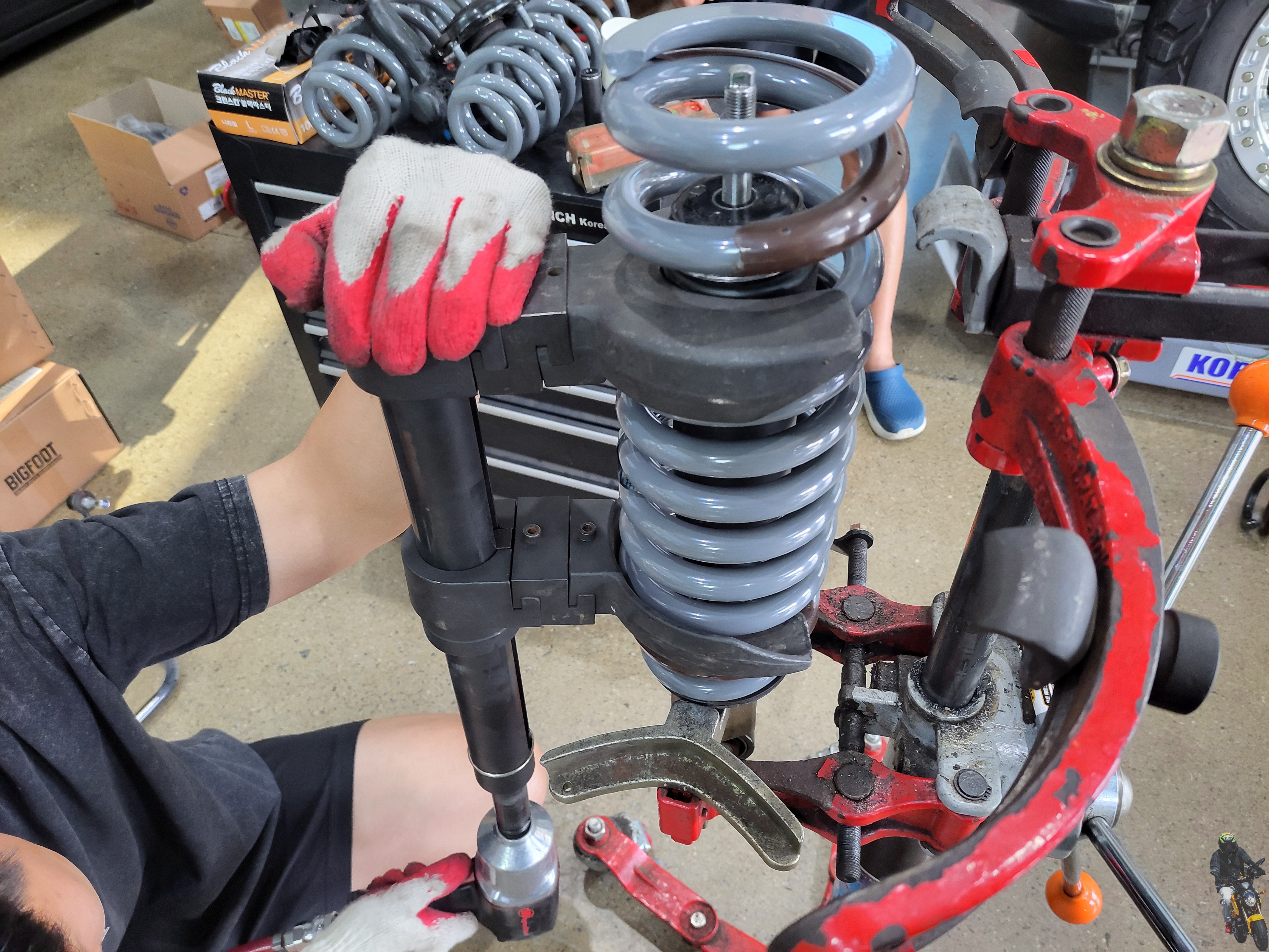 빅풋스프링 조립을 마친 쇼바스프링을 차량에 장착하였습니다