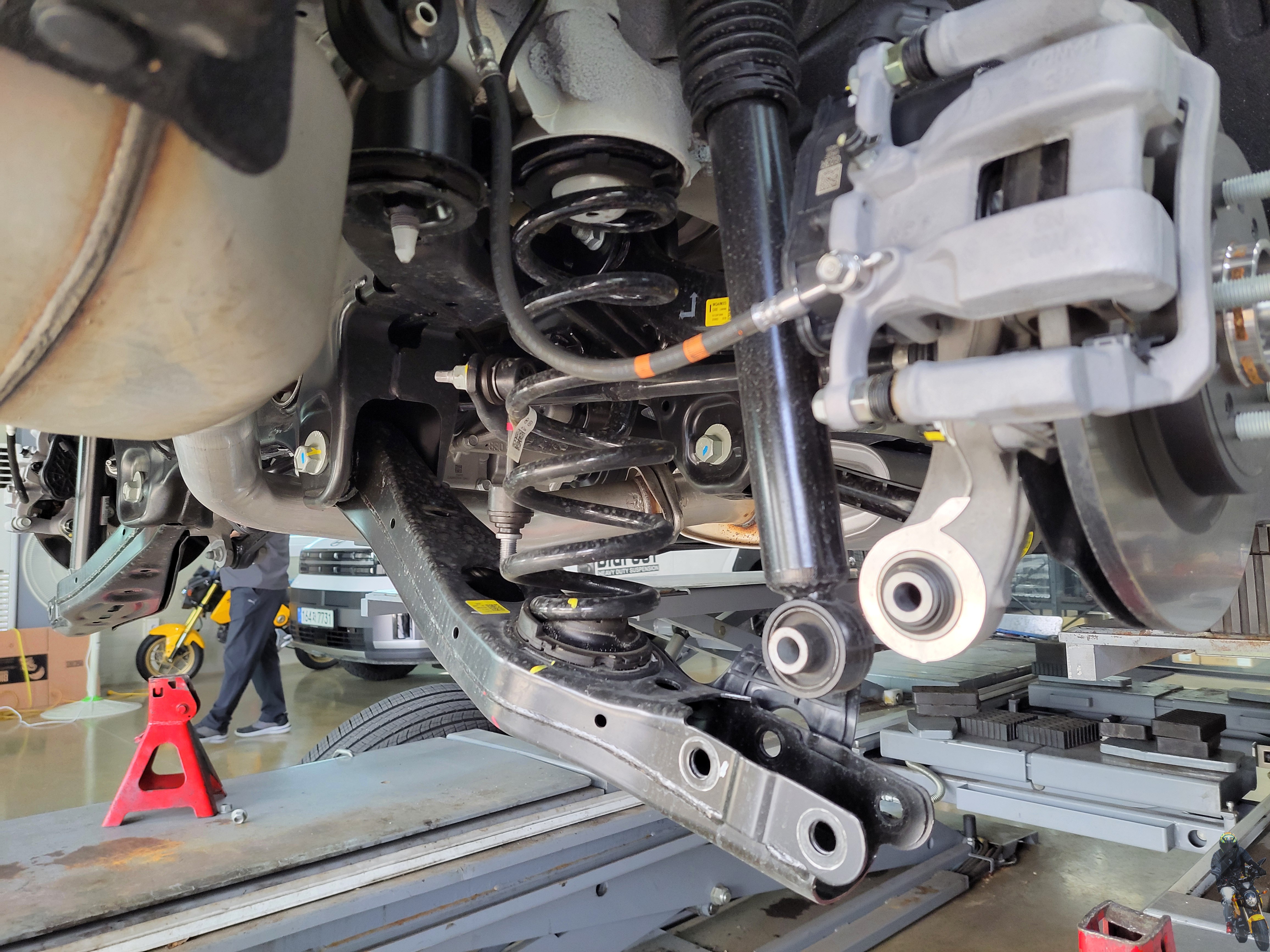차량을 리프트에 올리고 하부 리어 서스펜션 쪽을 보고 있습니다