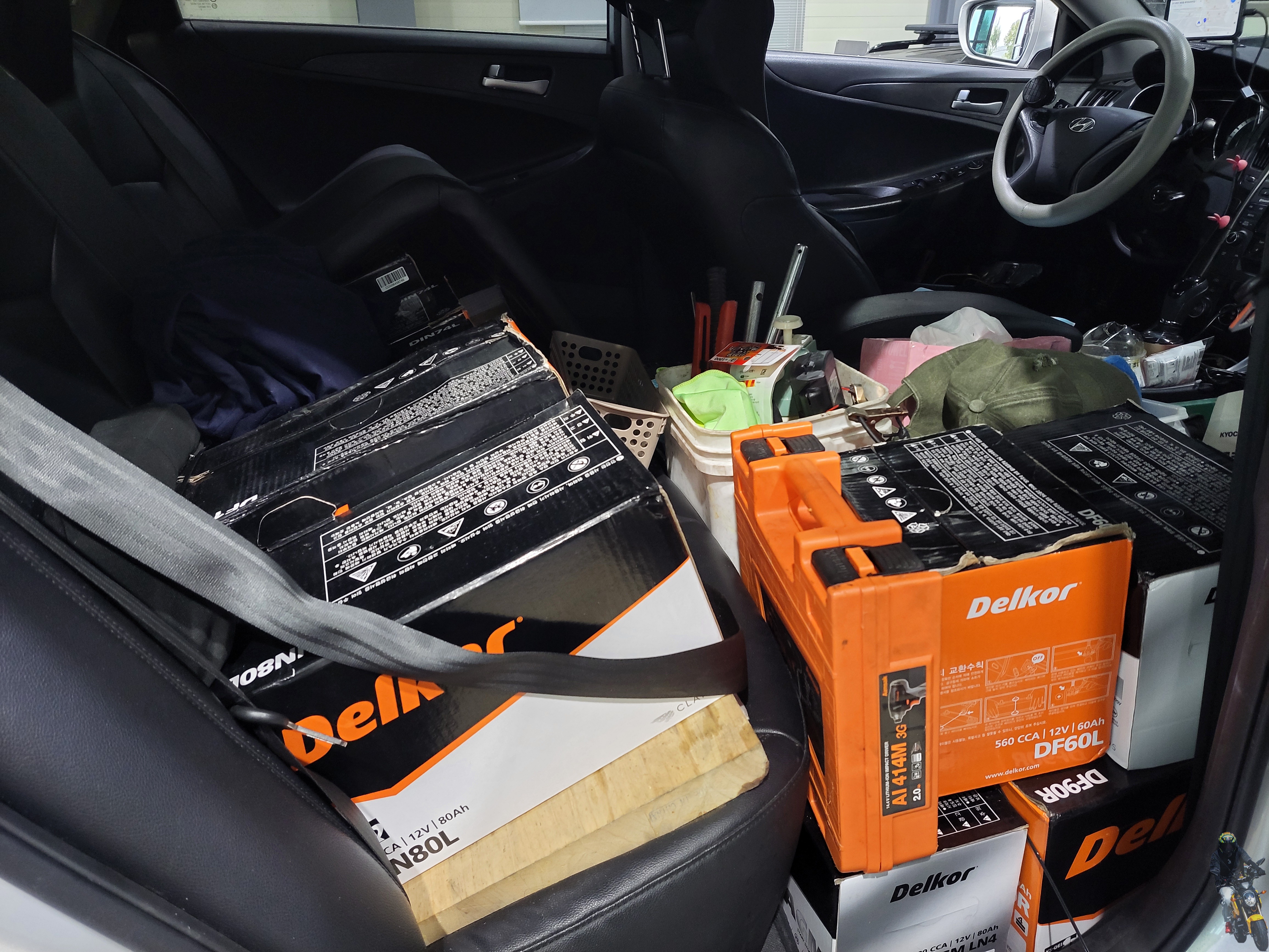 차량의 2열 승객석에는 이렇게 차량용 배터리가 많이 적재되어 있습니다
