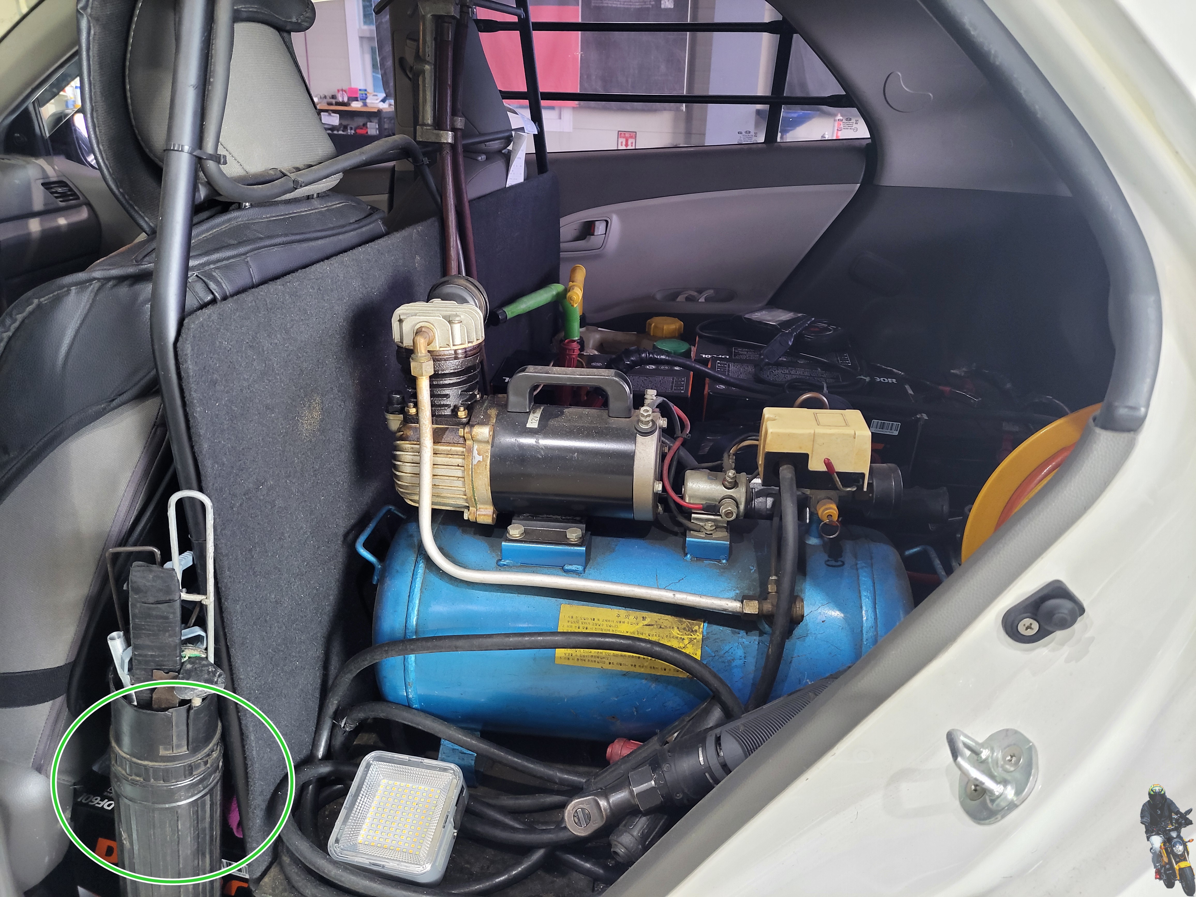 올뉴모닝 차량의 실내 모습입니다 하단부에 차량용 배터리가 적재되어 있습니다