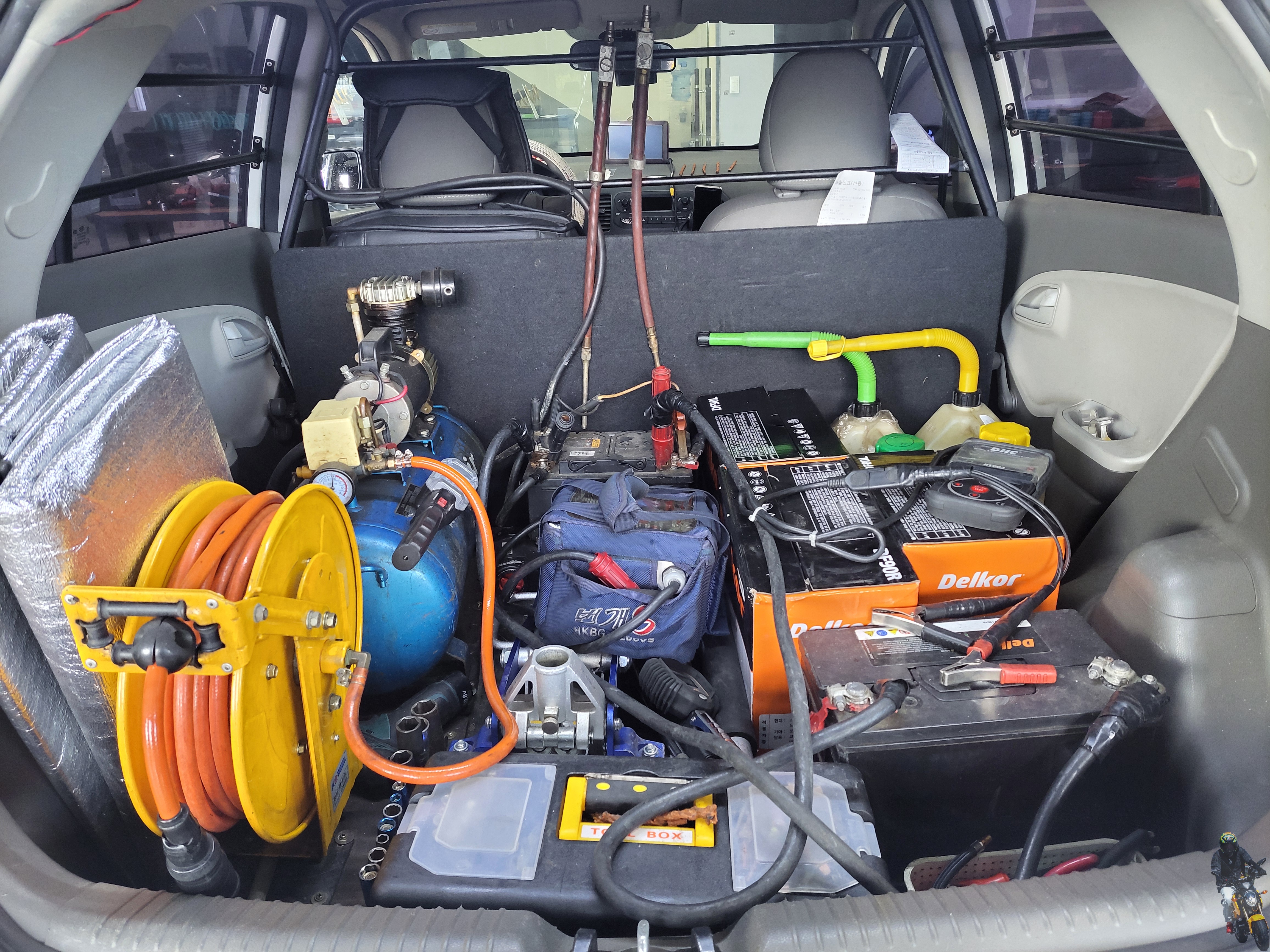 리어 공간에 차량용 배터리와 각종 장비 적재로 인해 이렇게