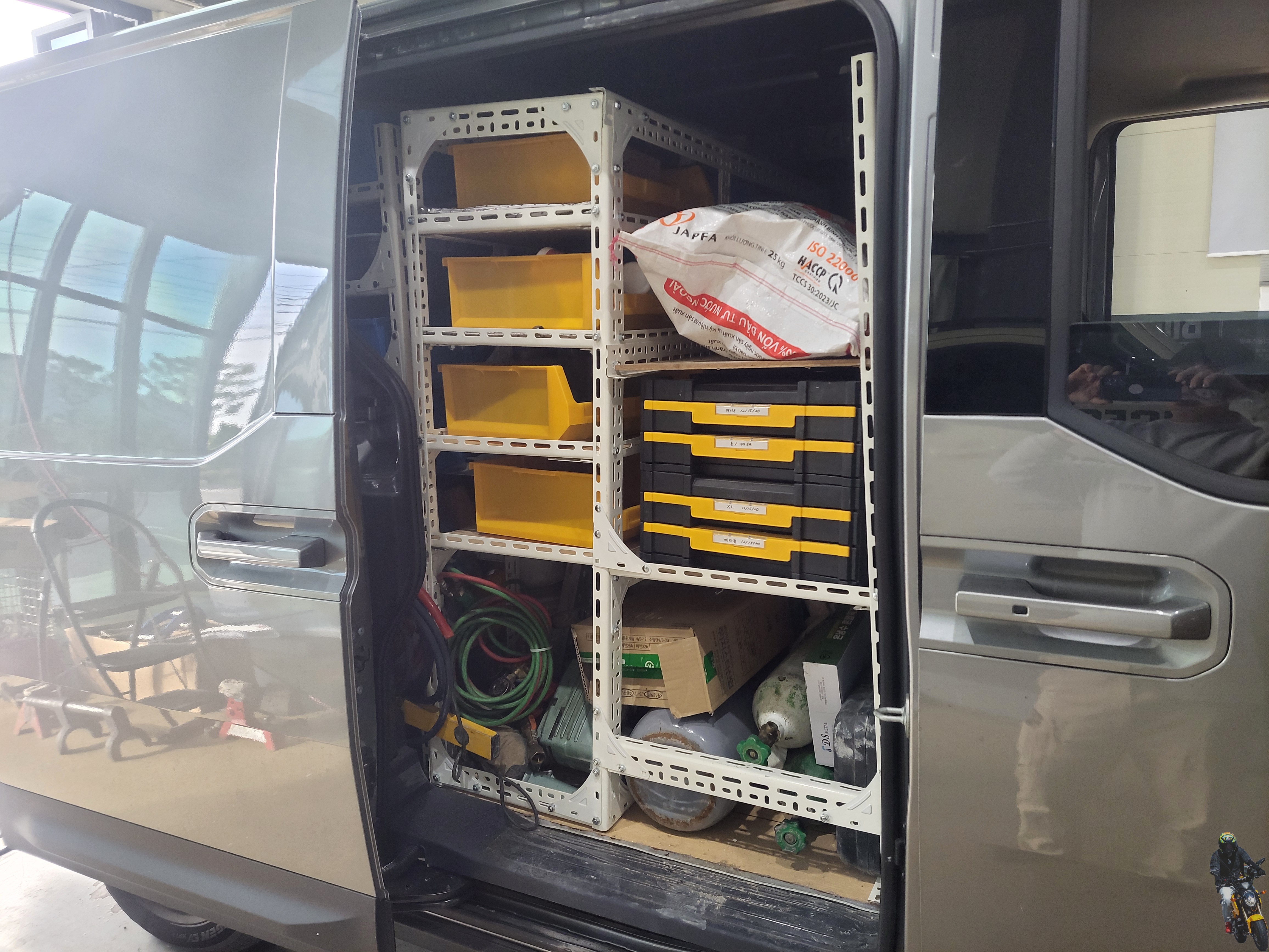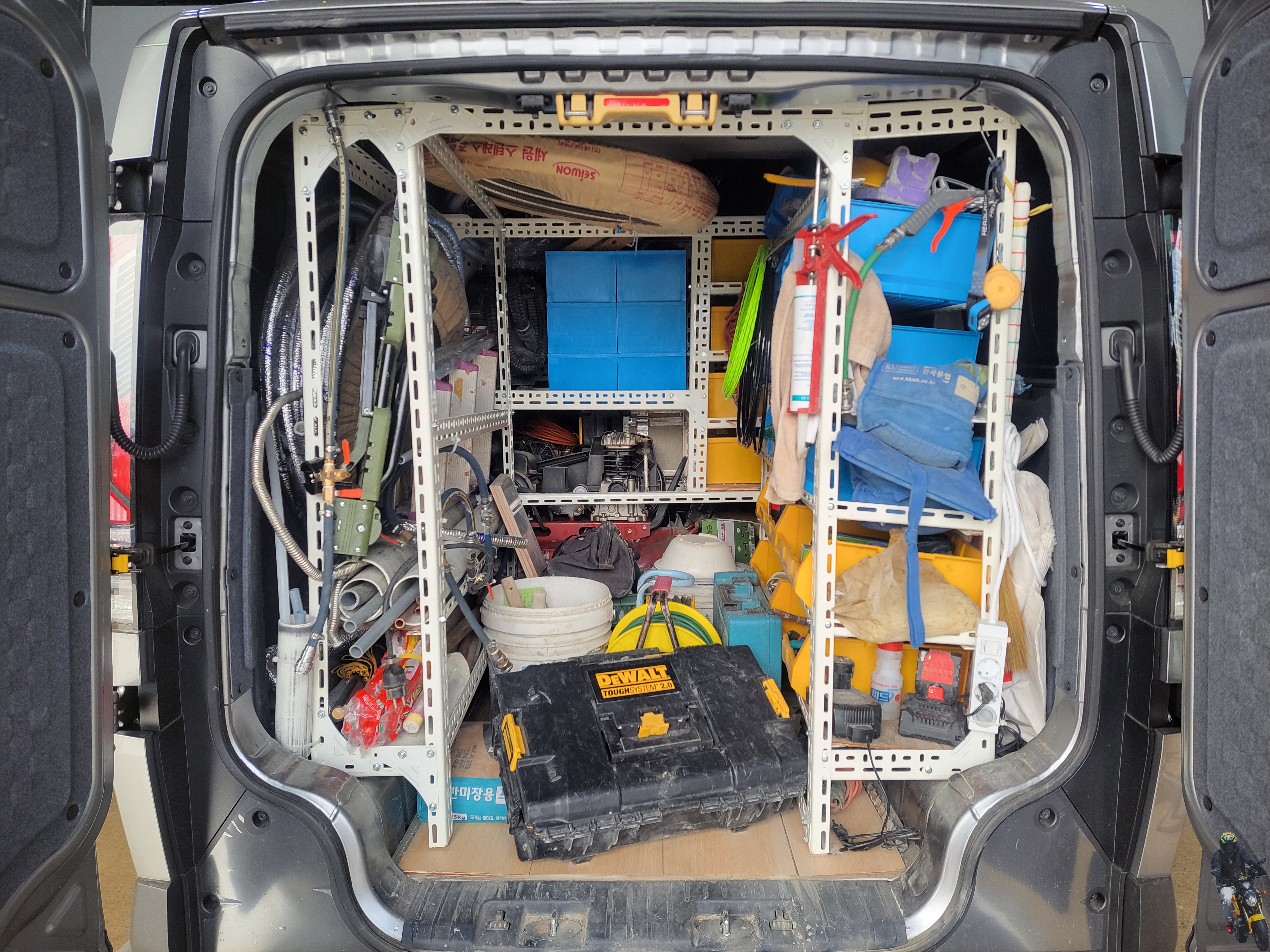 트렁크 도어를 열어보니 이렇게 앵글과 각종 장비들이 적재가