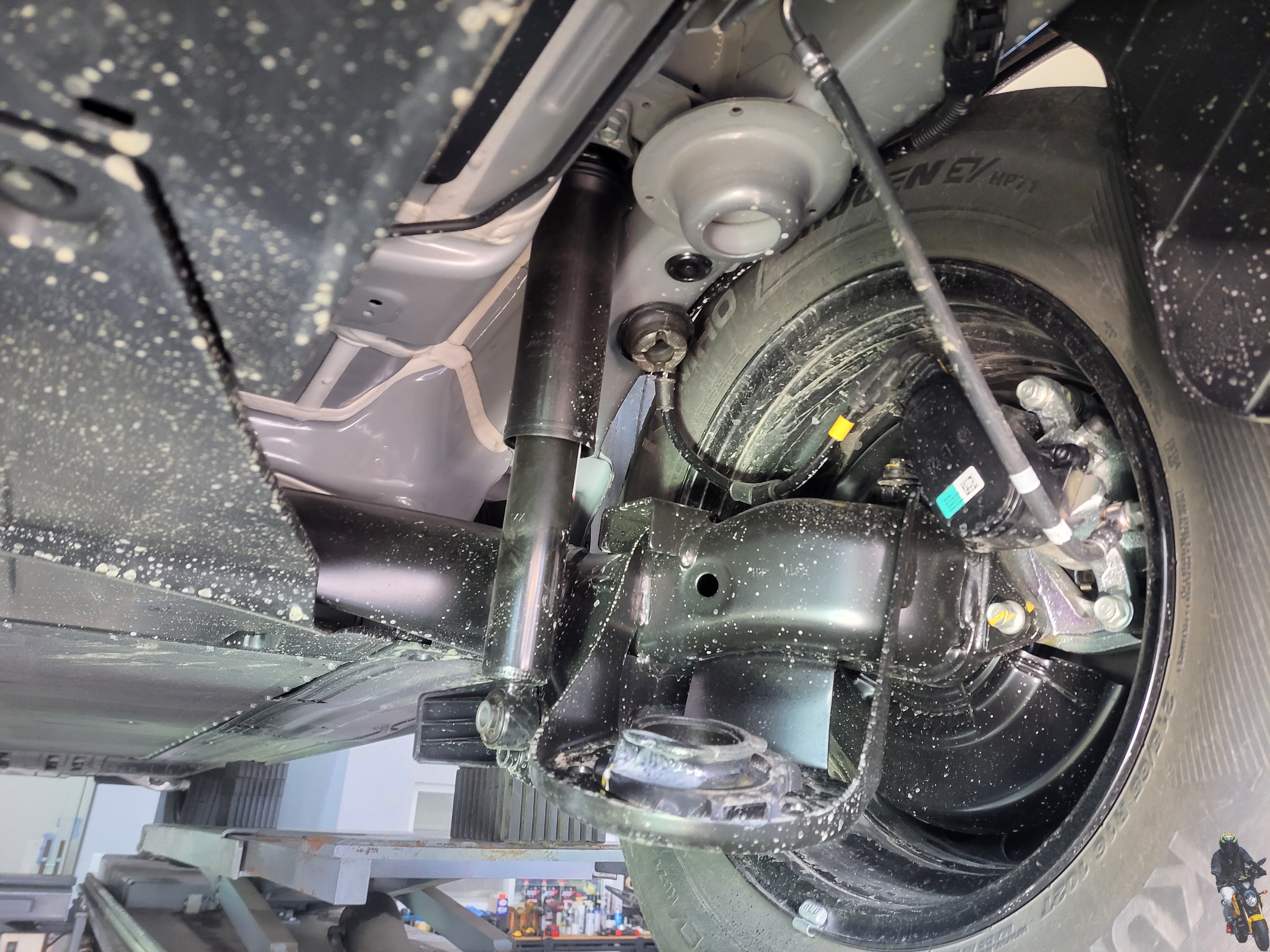 기아자동차 다목적 PV5 카고 차량의 리어 서스펜션의 모습입니다