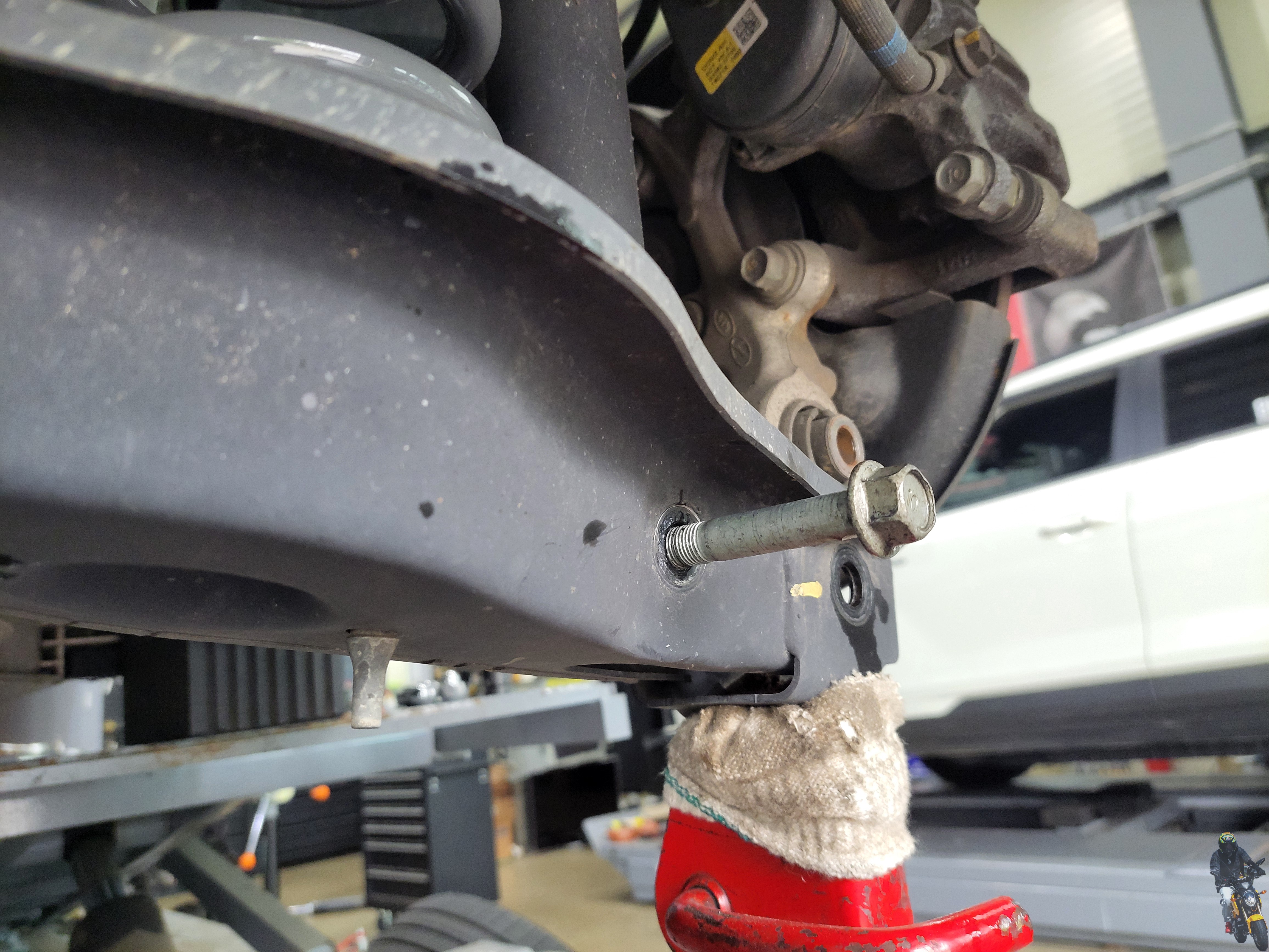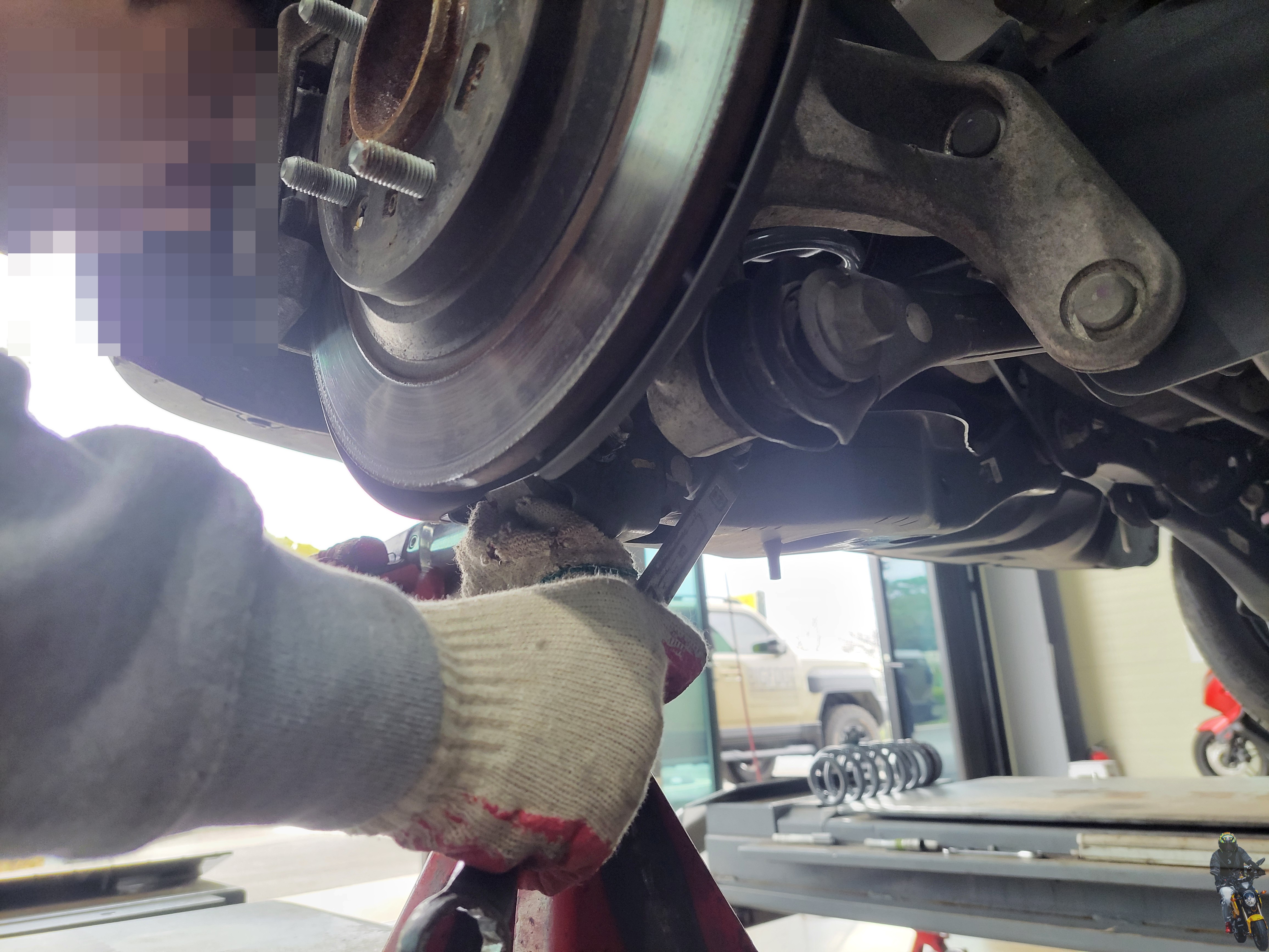로우암을 압축하면서 쇼바의 하단 고정부의 17mm 볼트를