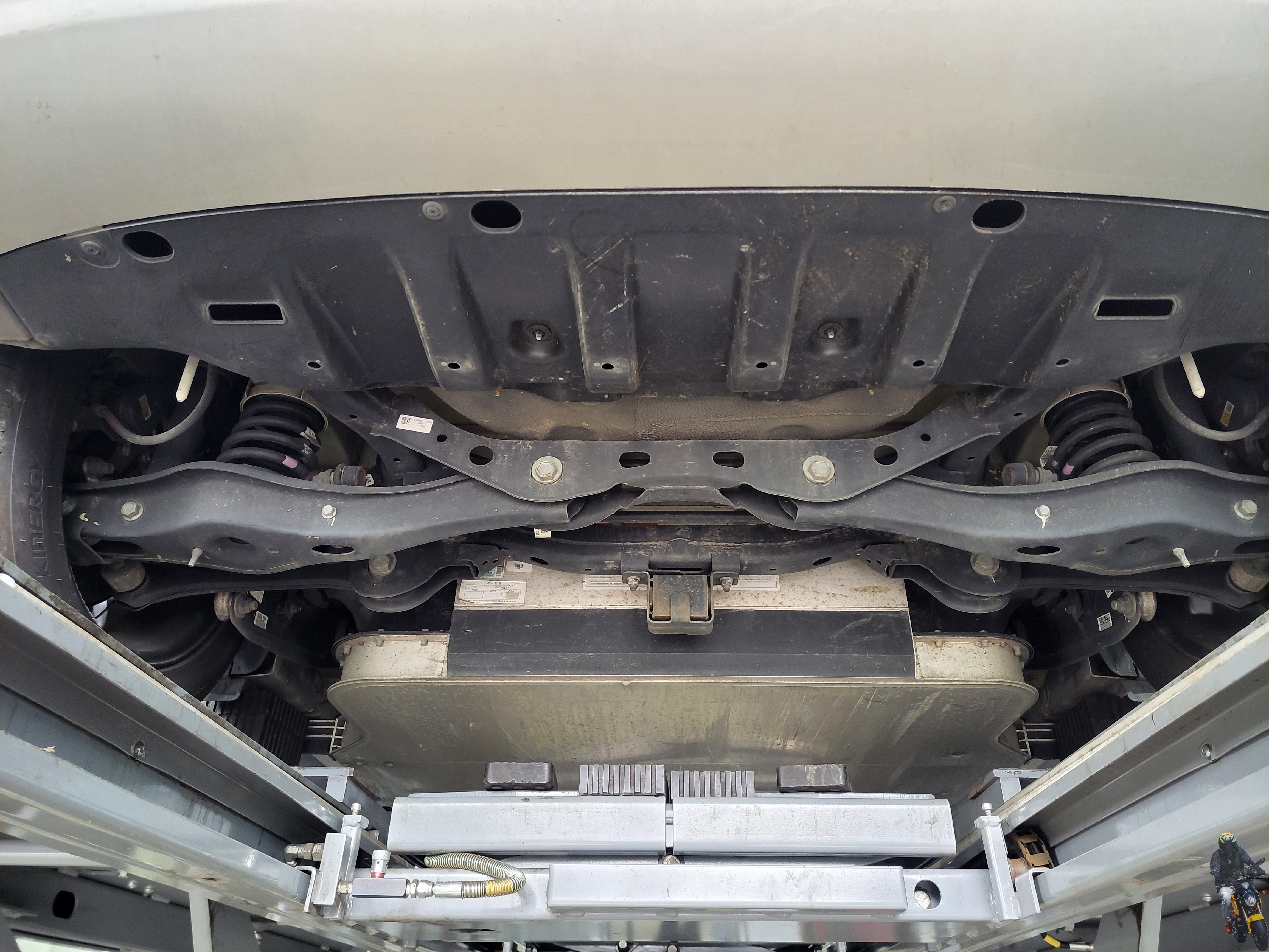 쏘울EV 차량의 하체를 보고 있습니다 가운데 차량용 메인 배터리가