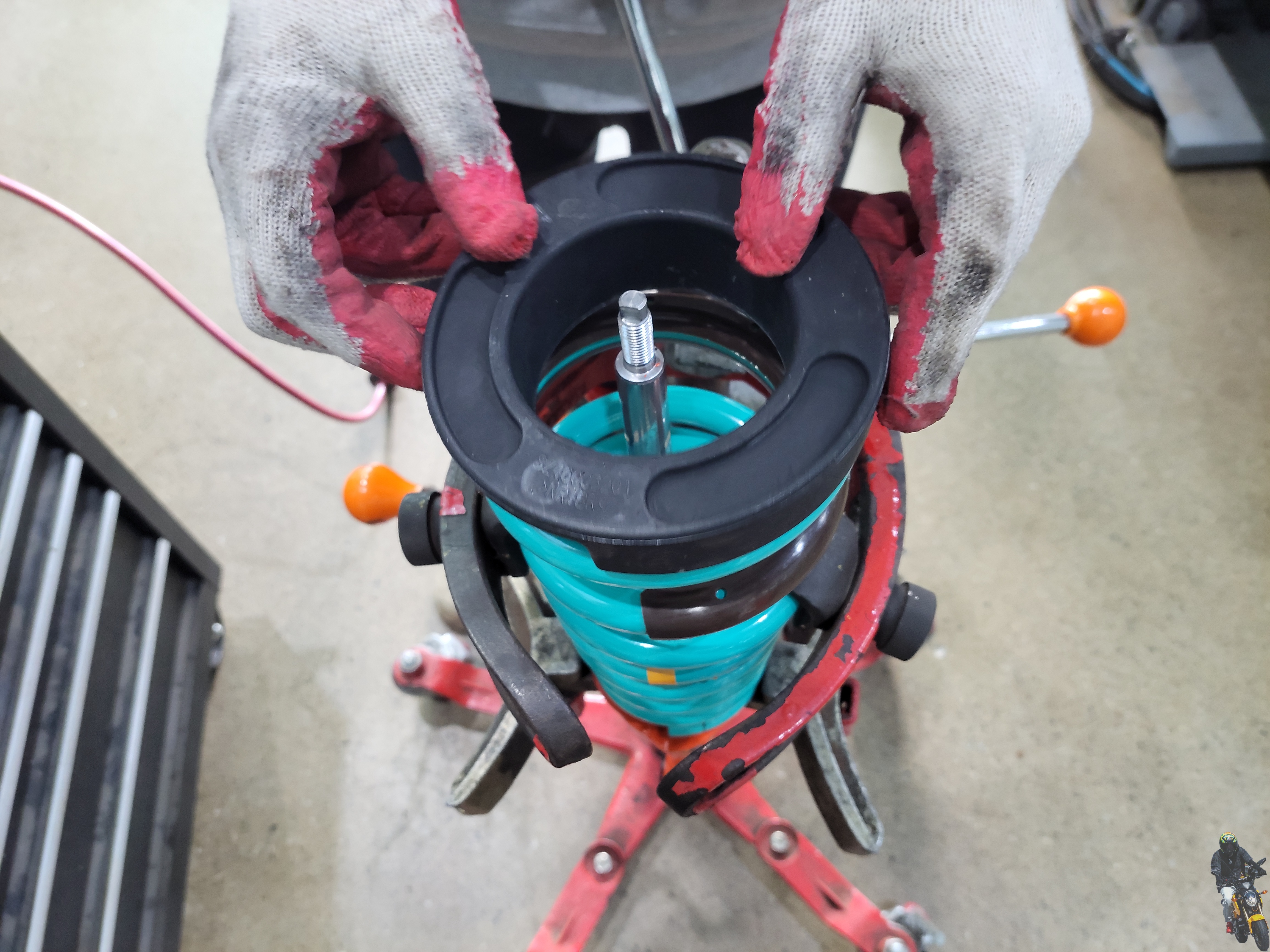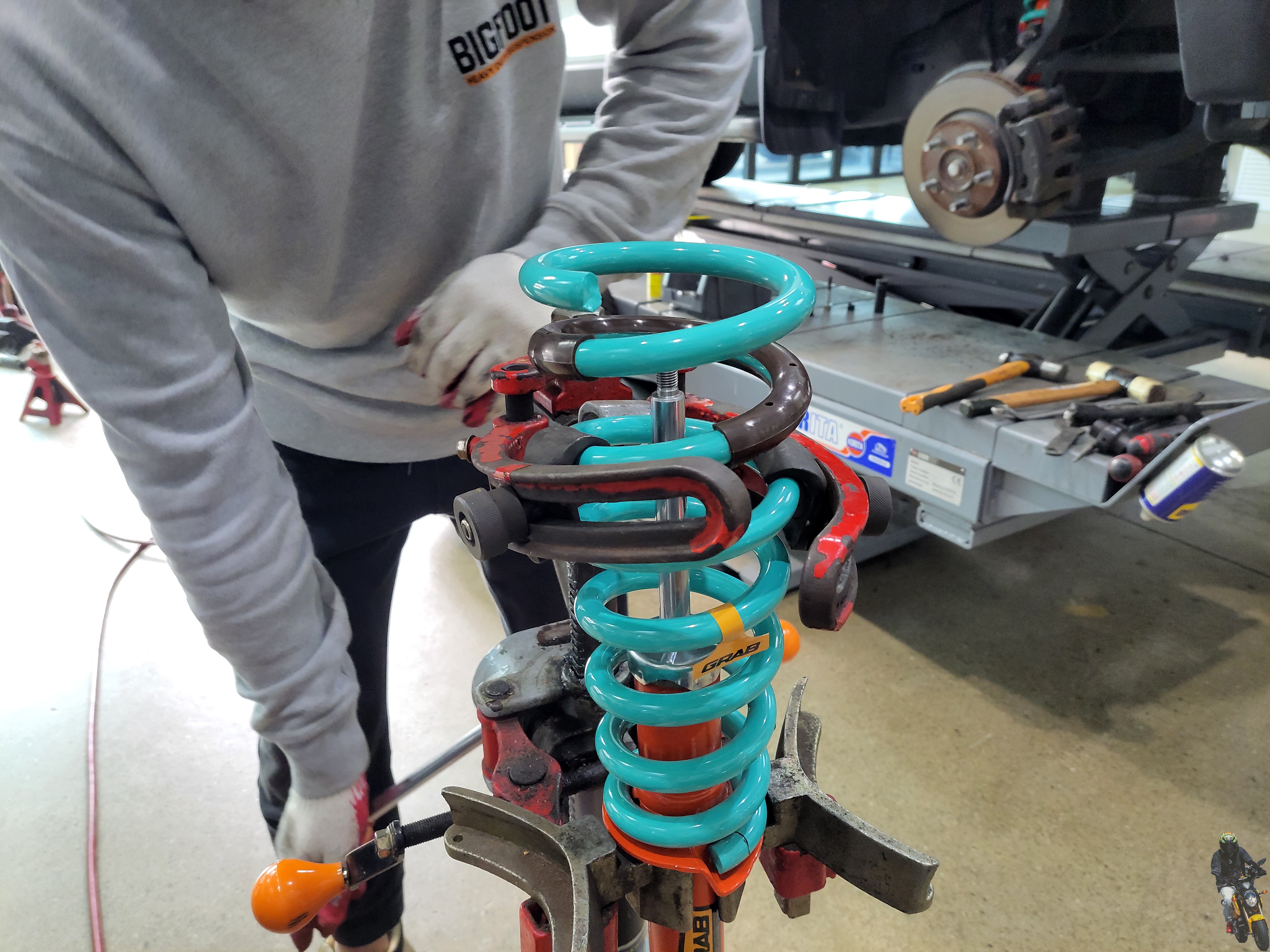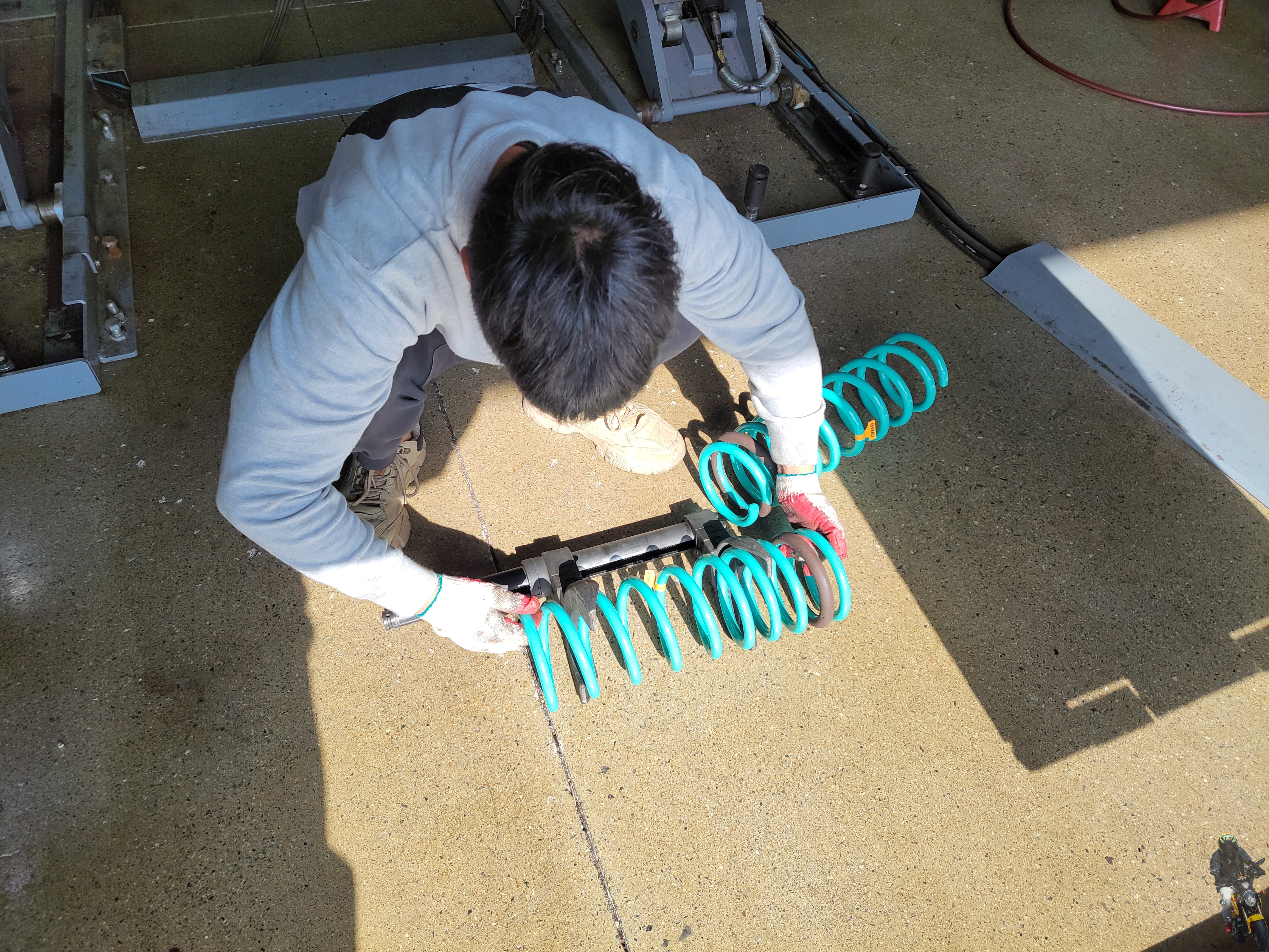 스프링 압축기를 이용해서 스프링을 압축하고 있습니다