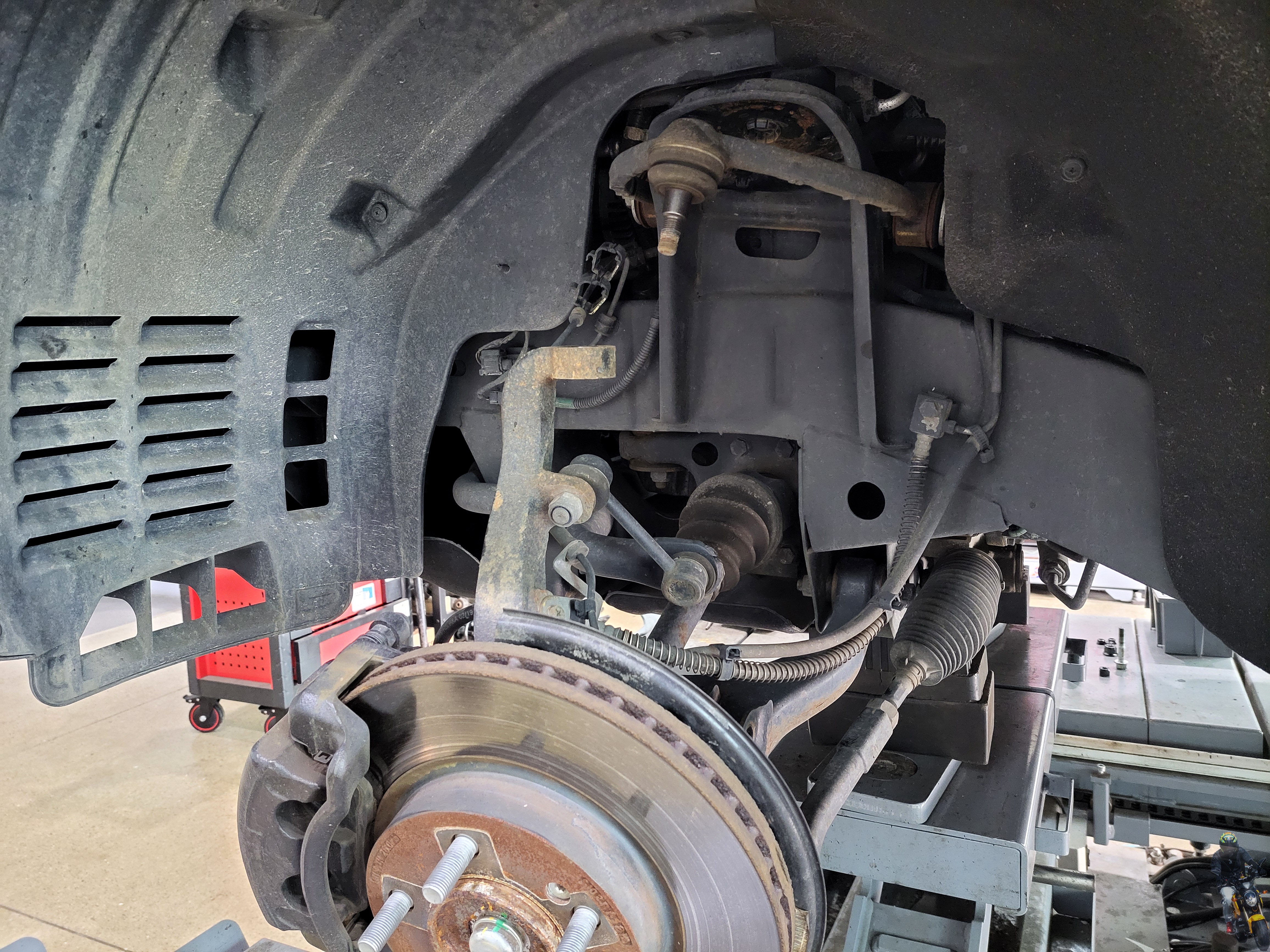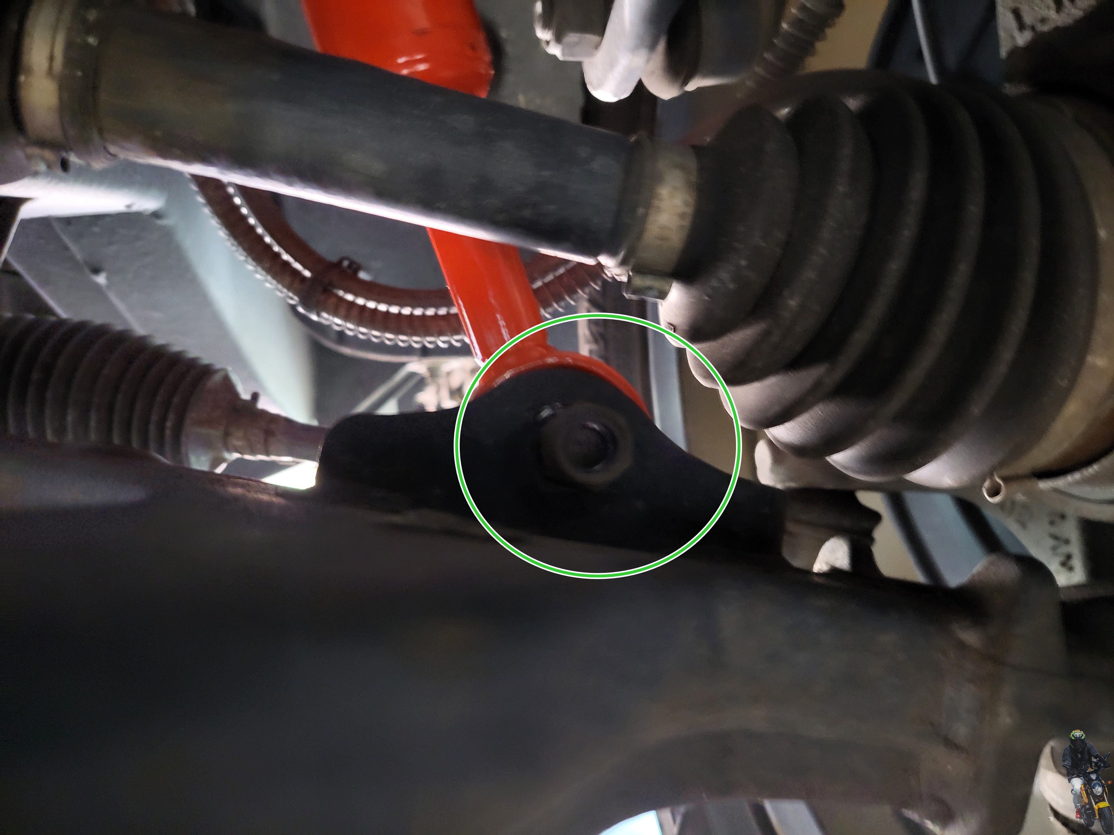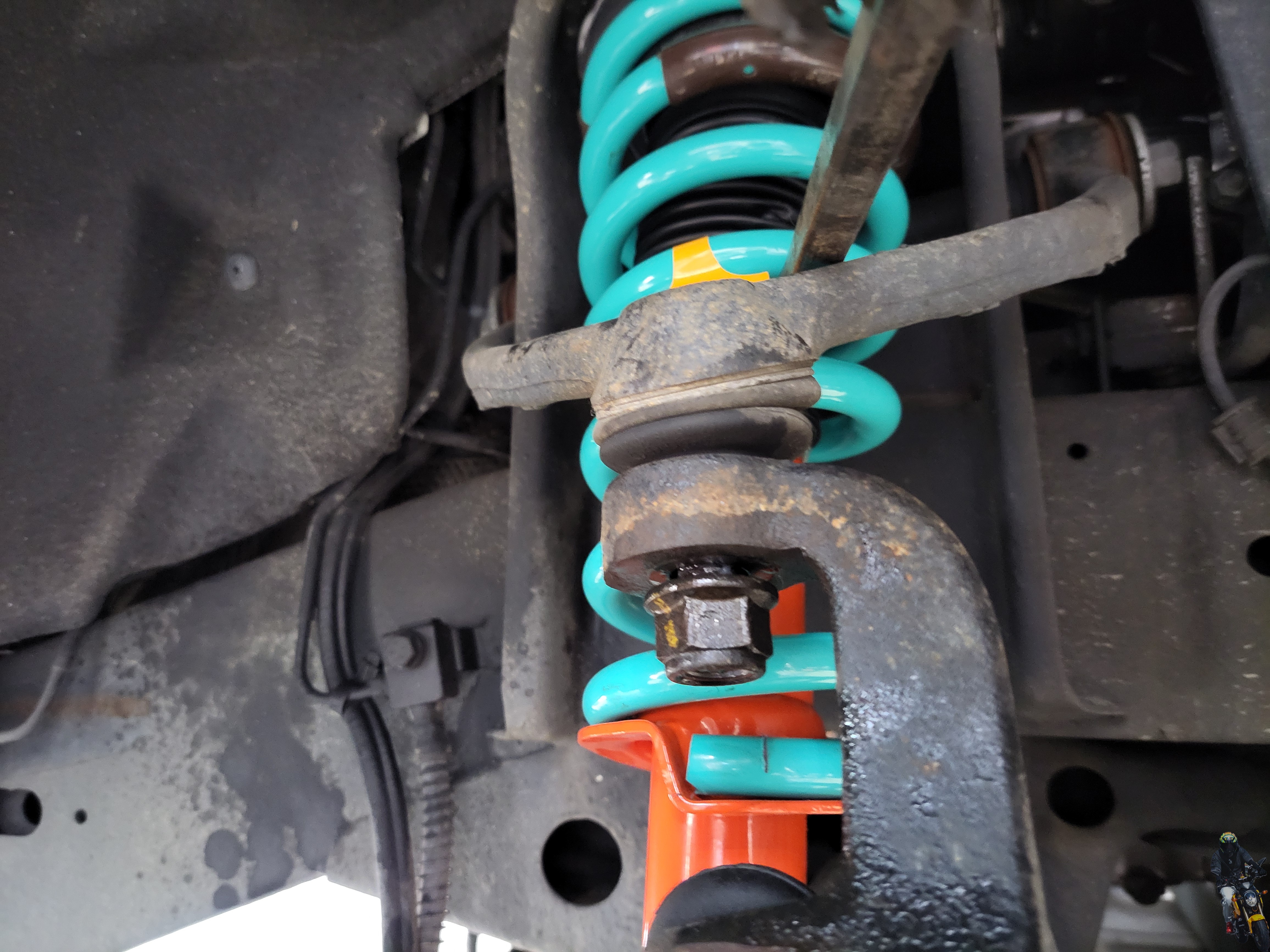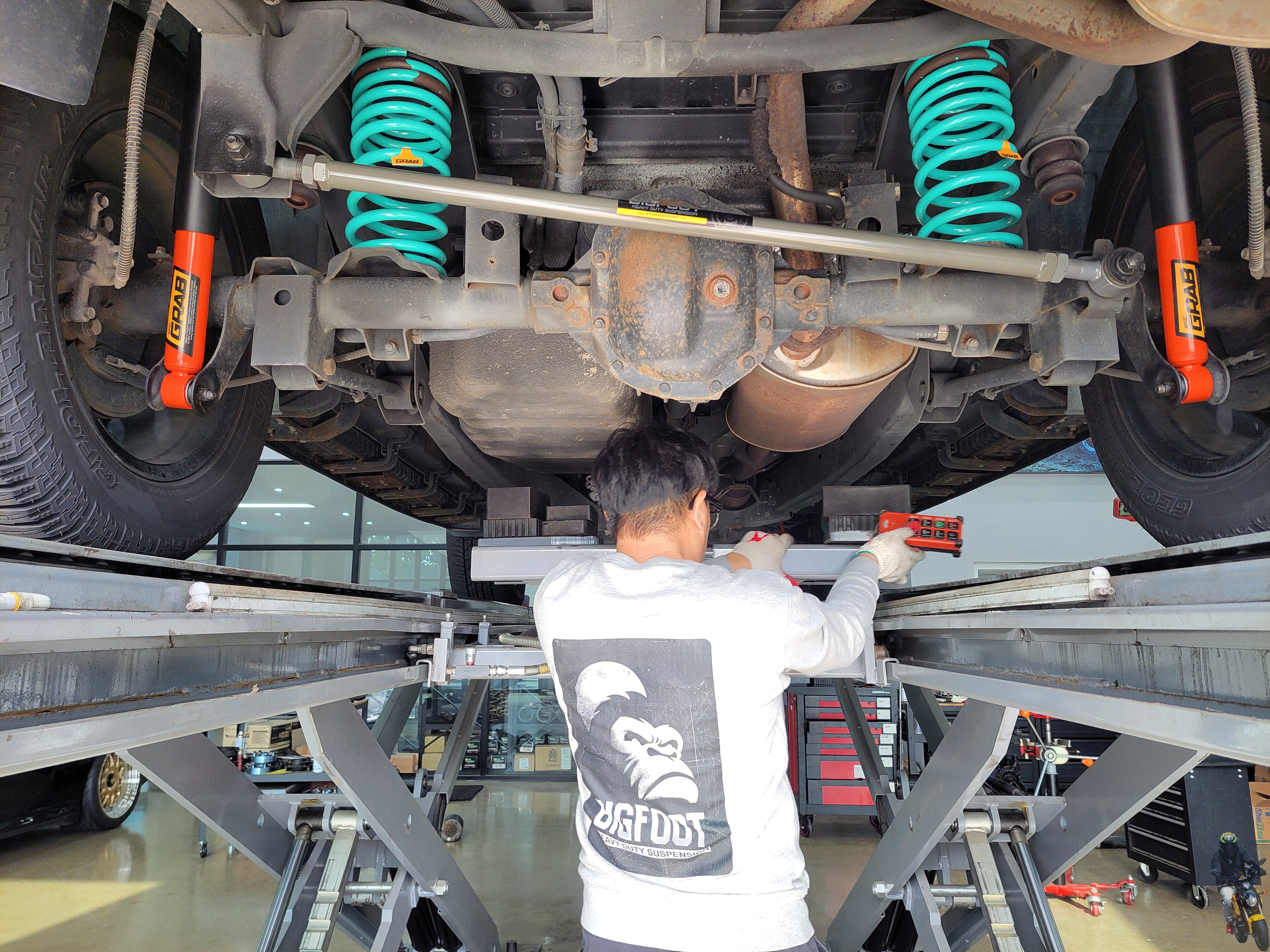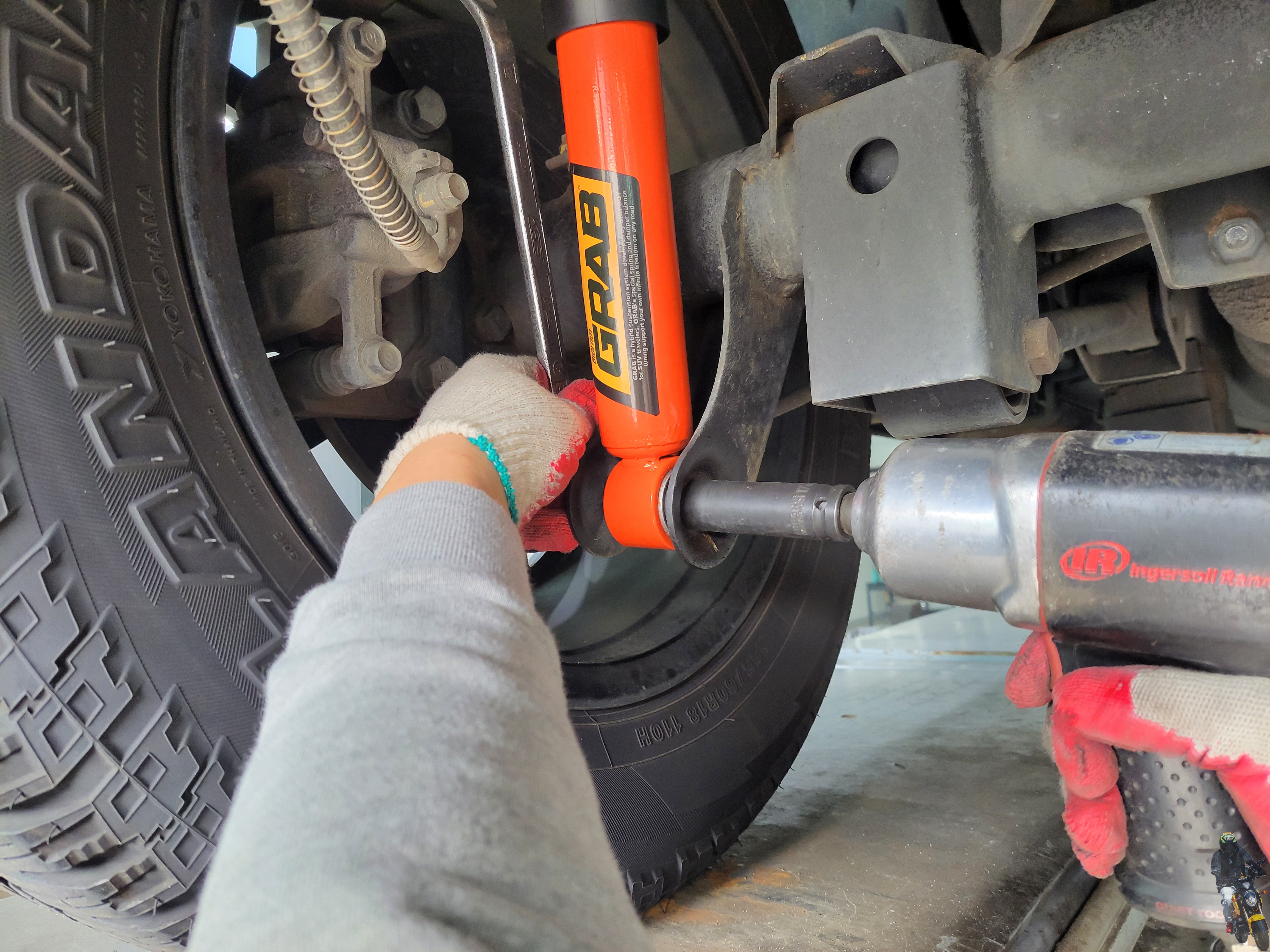 차량을 내려서 쇼바 하단 고정부의 공차체결을 하고 있습니다