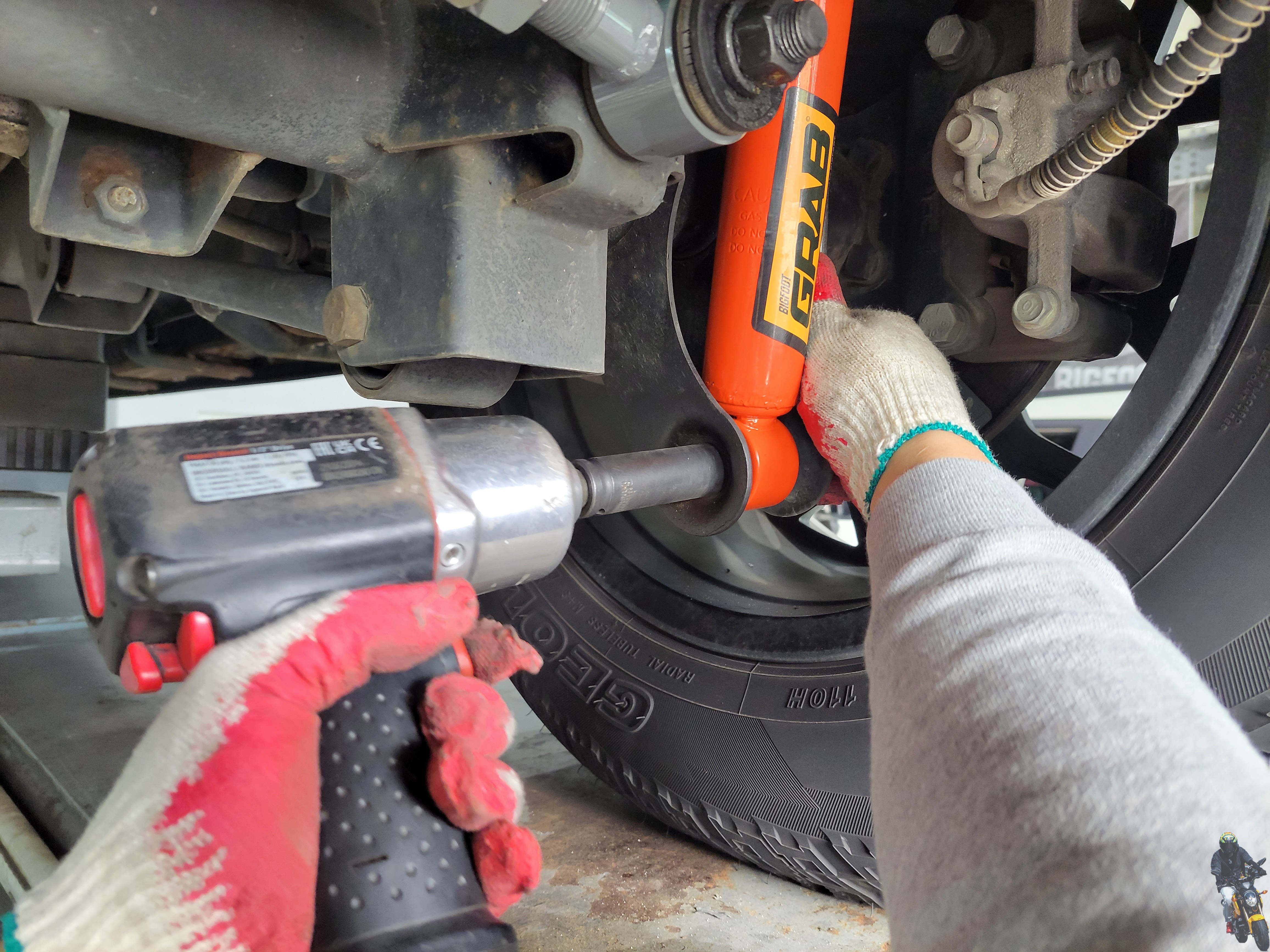 마지막으로 차량을 내리고 쇼바의 하단 부싱 고정 너트를 조이고 있습니다