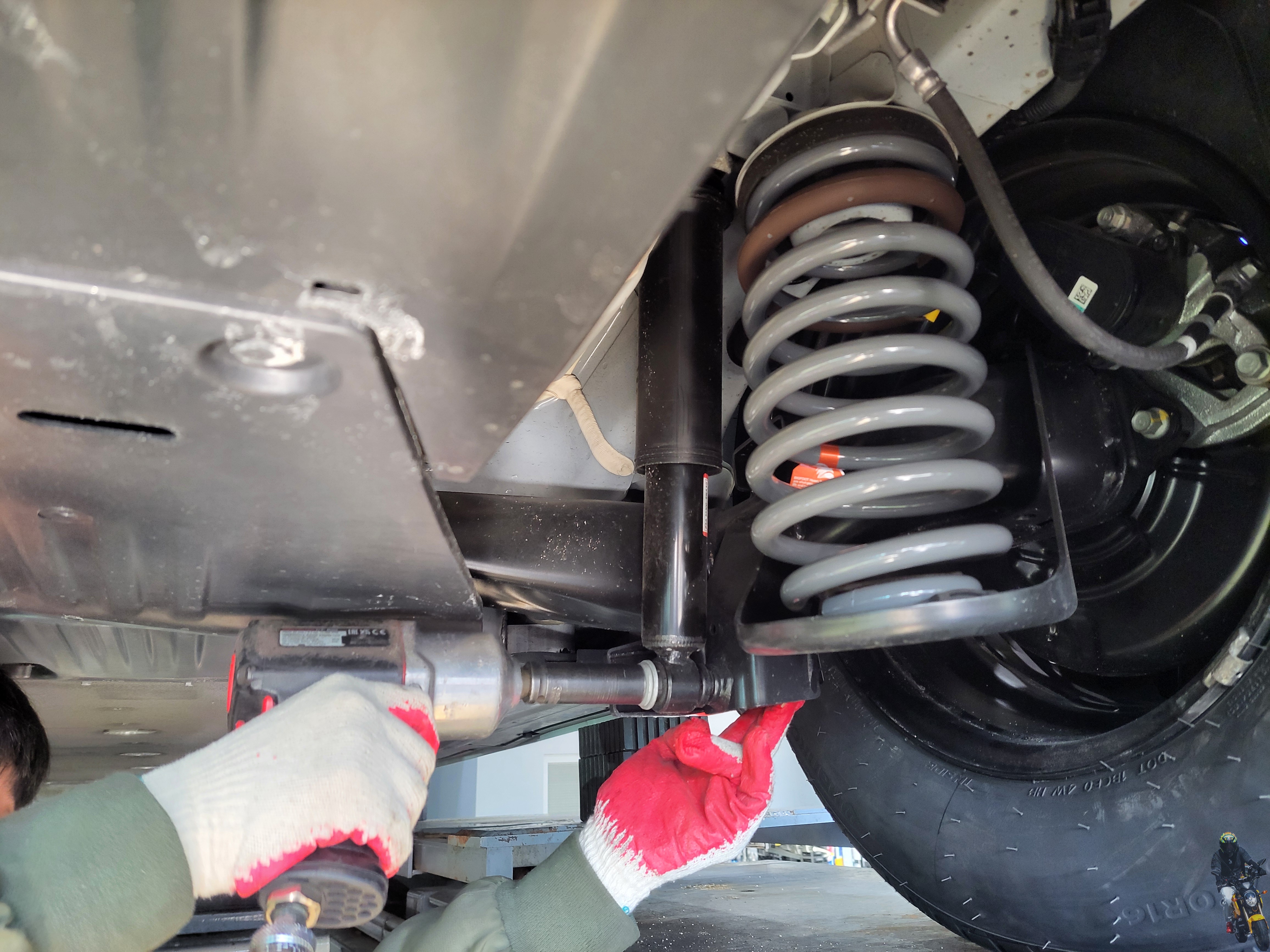 리프트를 내리면서 쇼바의 고정부를 잘 맞추고 볼트를 조이고 있습니다