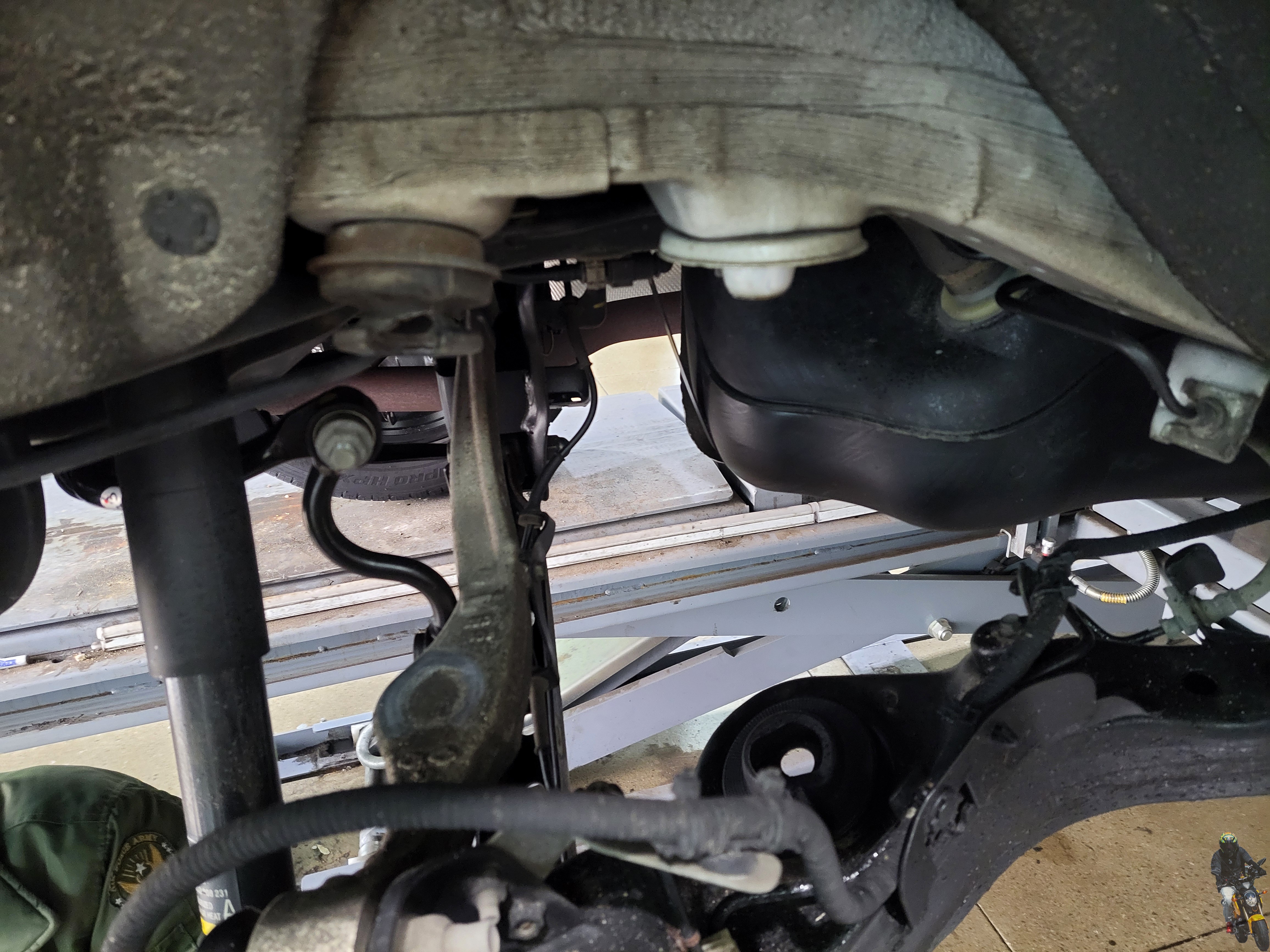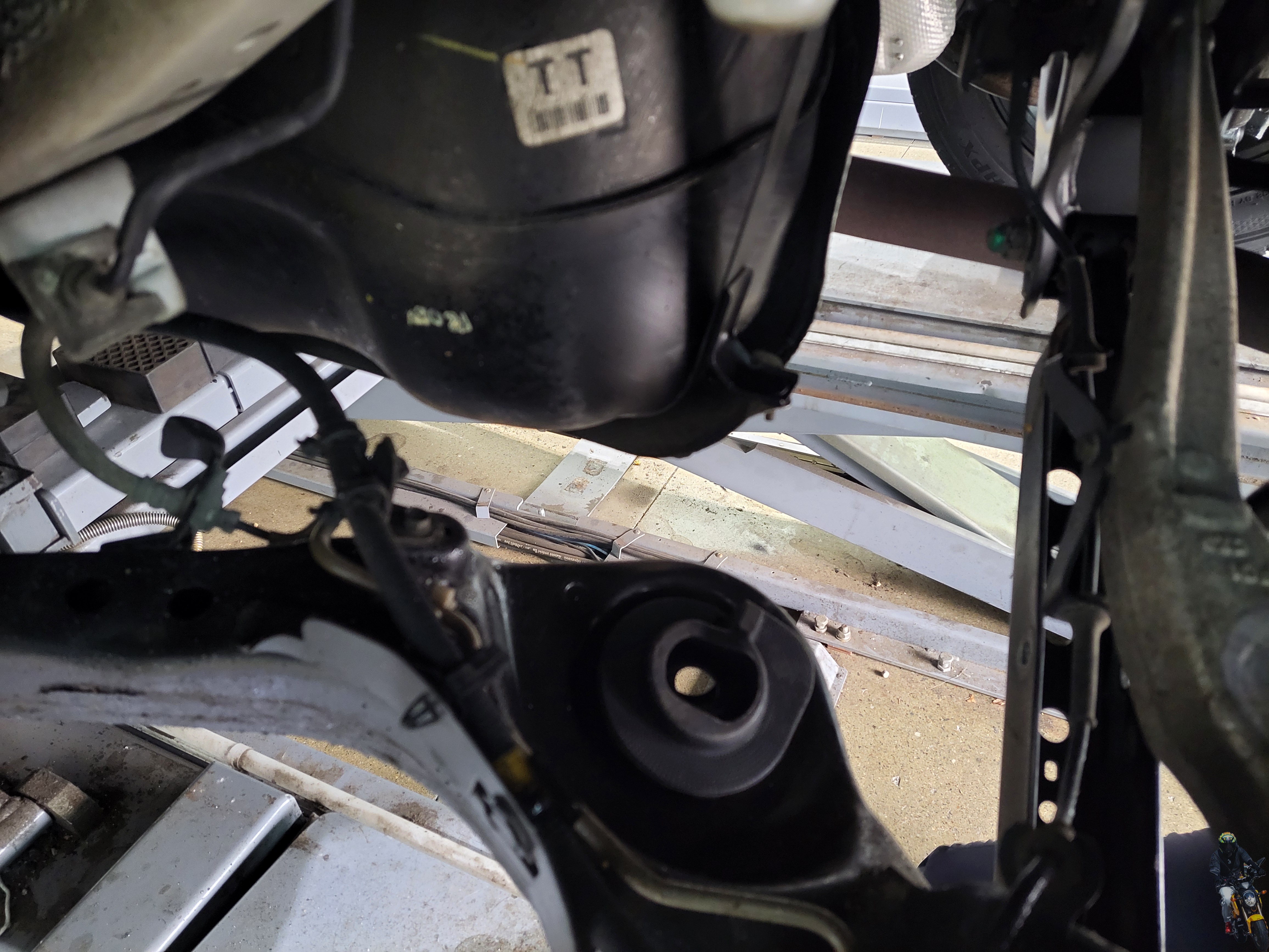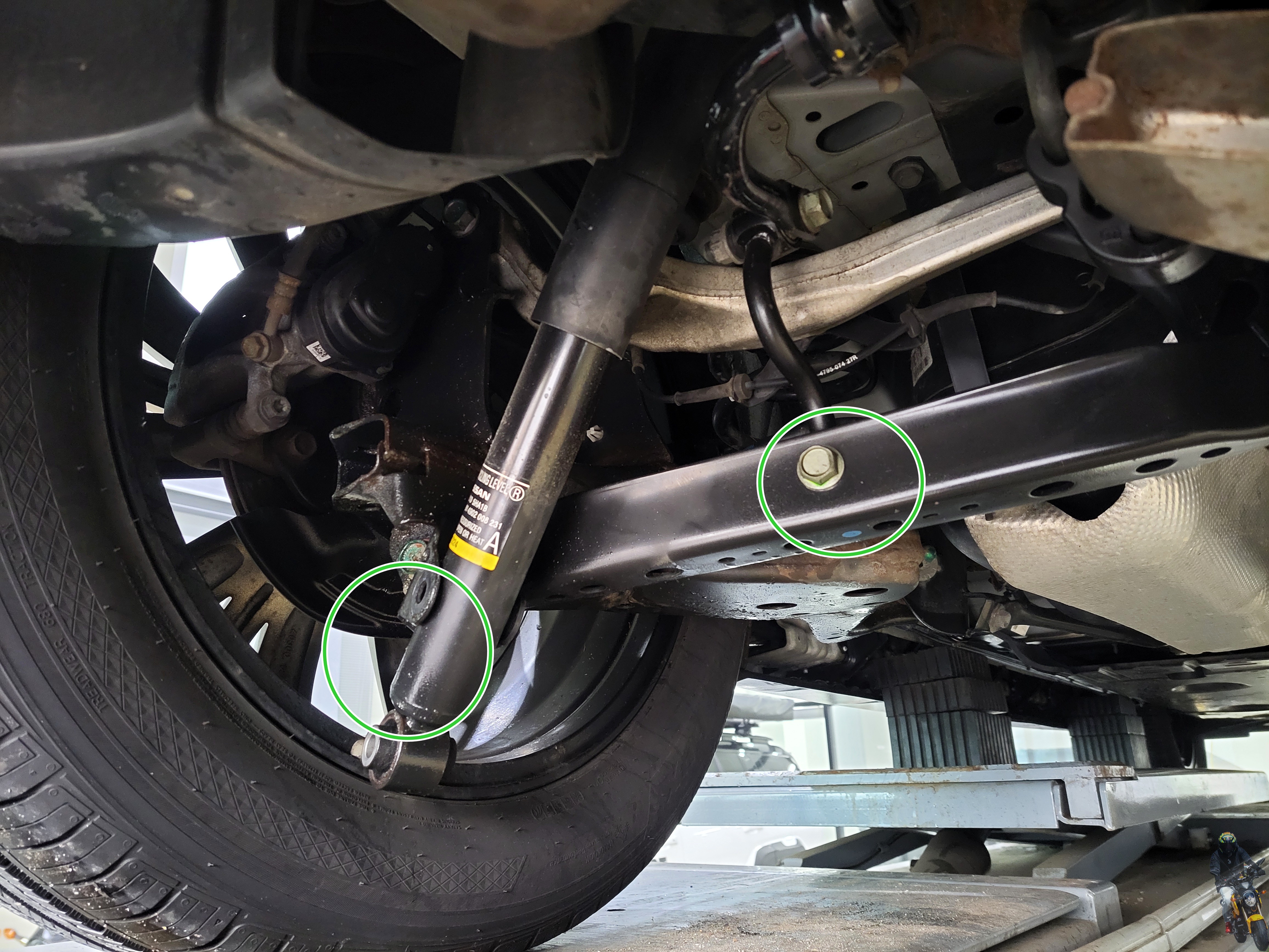 이제 리프트를 내리고 쇼바의 하단 부싱 부분을 고정하고