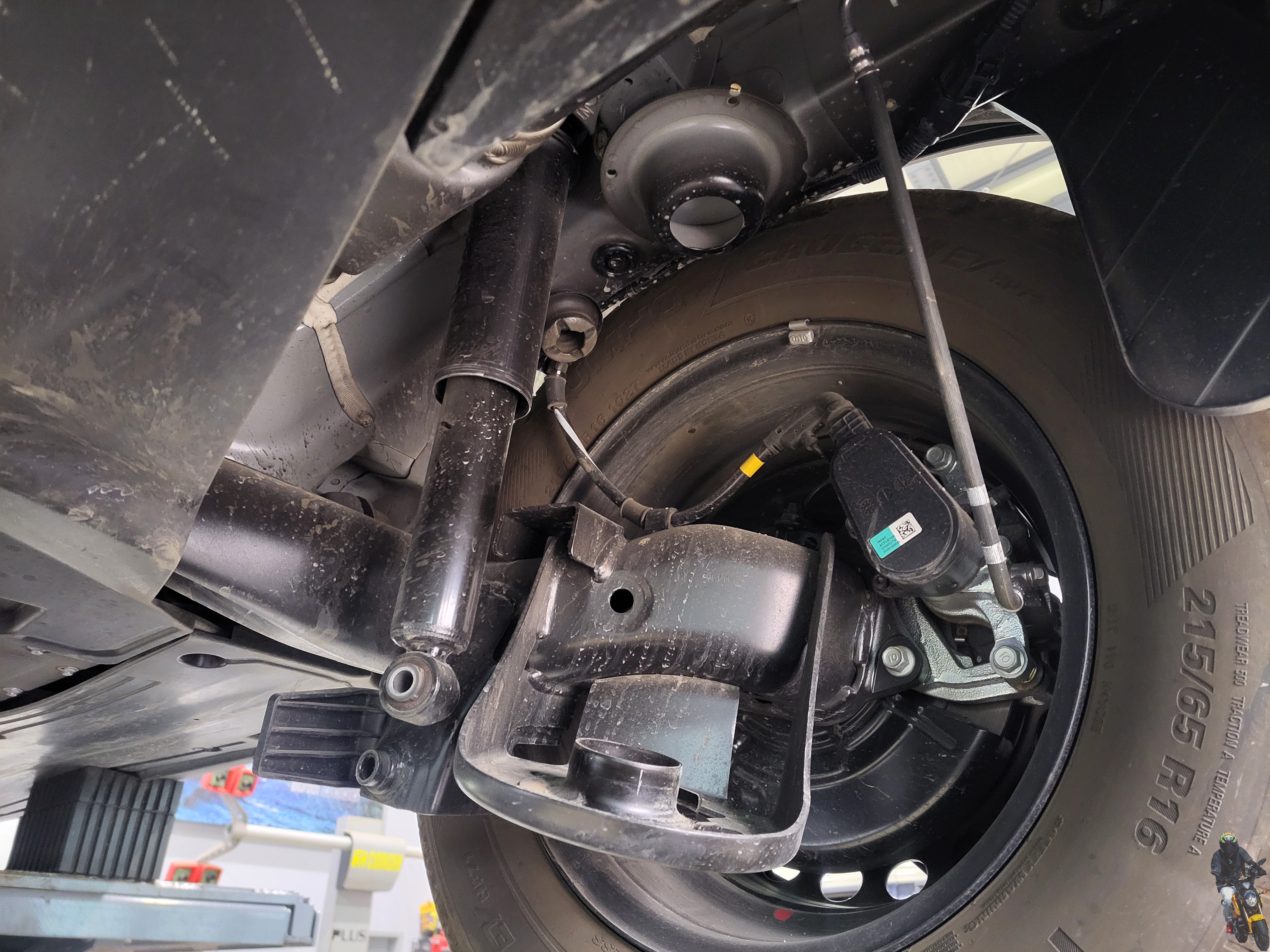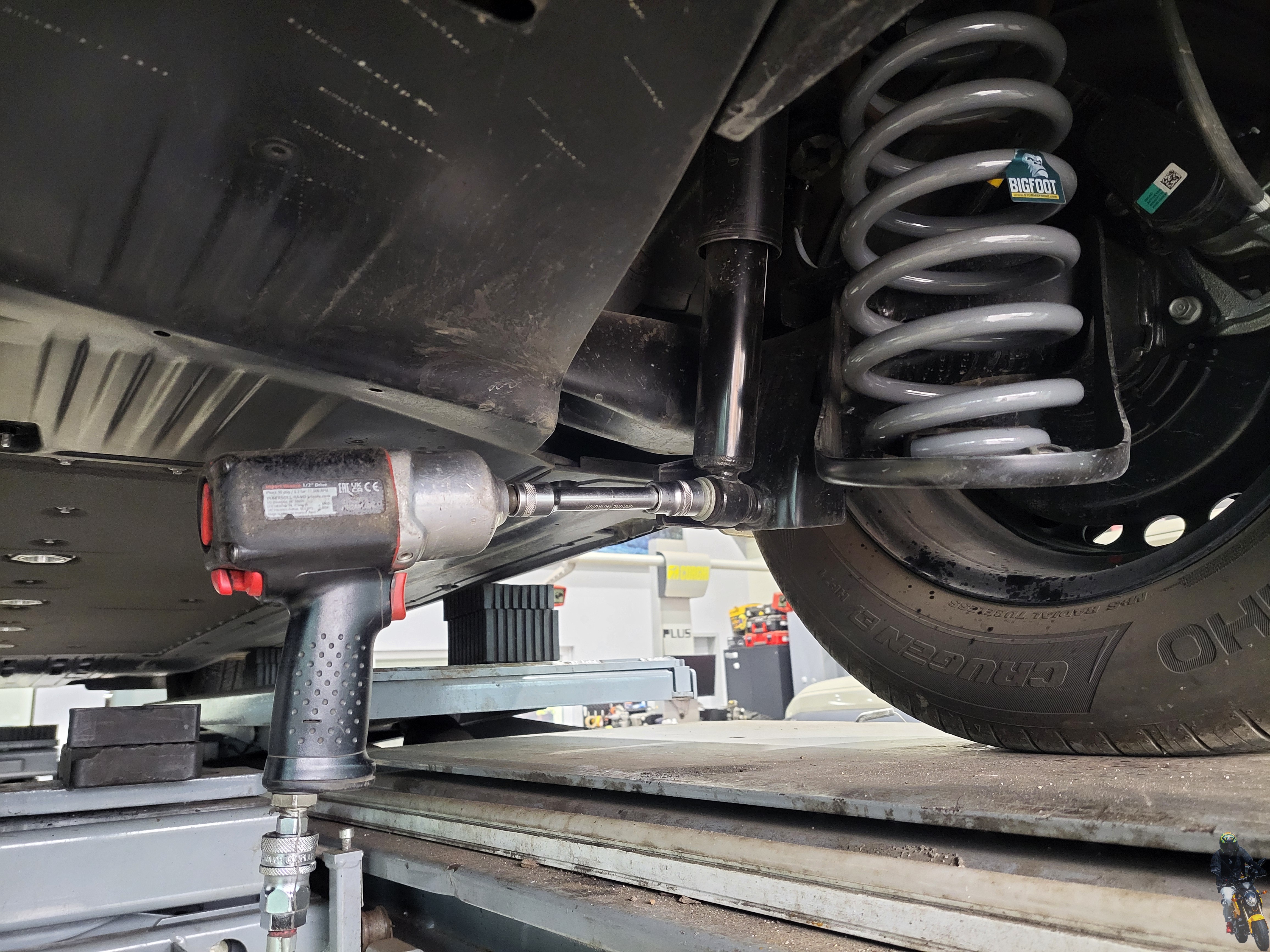 리프트를 내리면서 쇼바의 하단 고정부를 조이고 있습니다