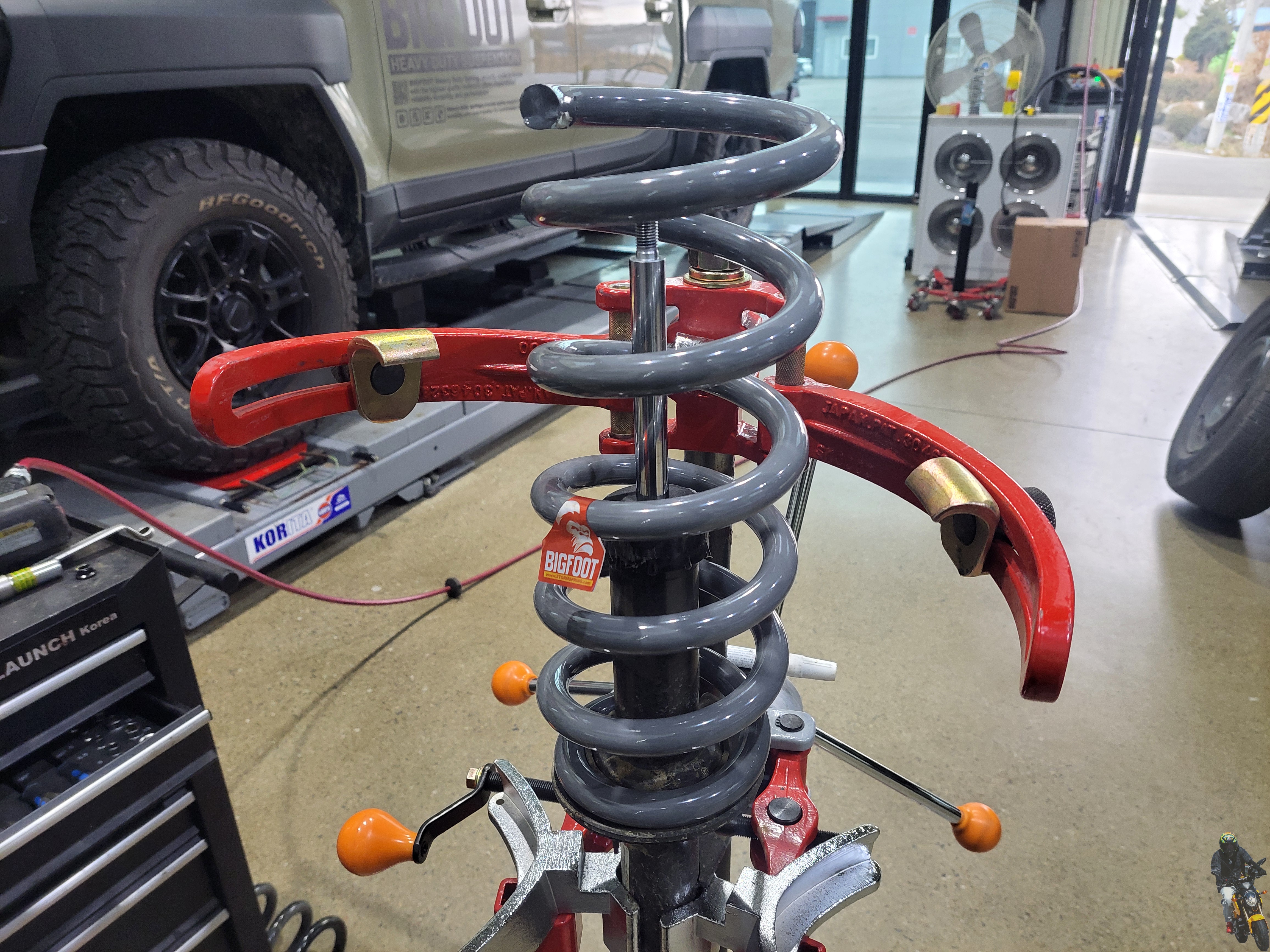 탈거한 프런트 쇼바스프링을 스프링 압축기에 고정을 하였습니다