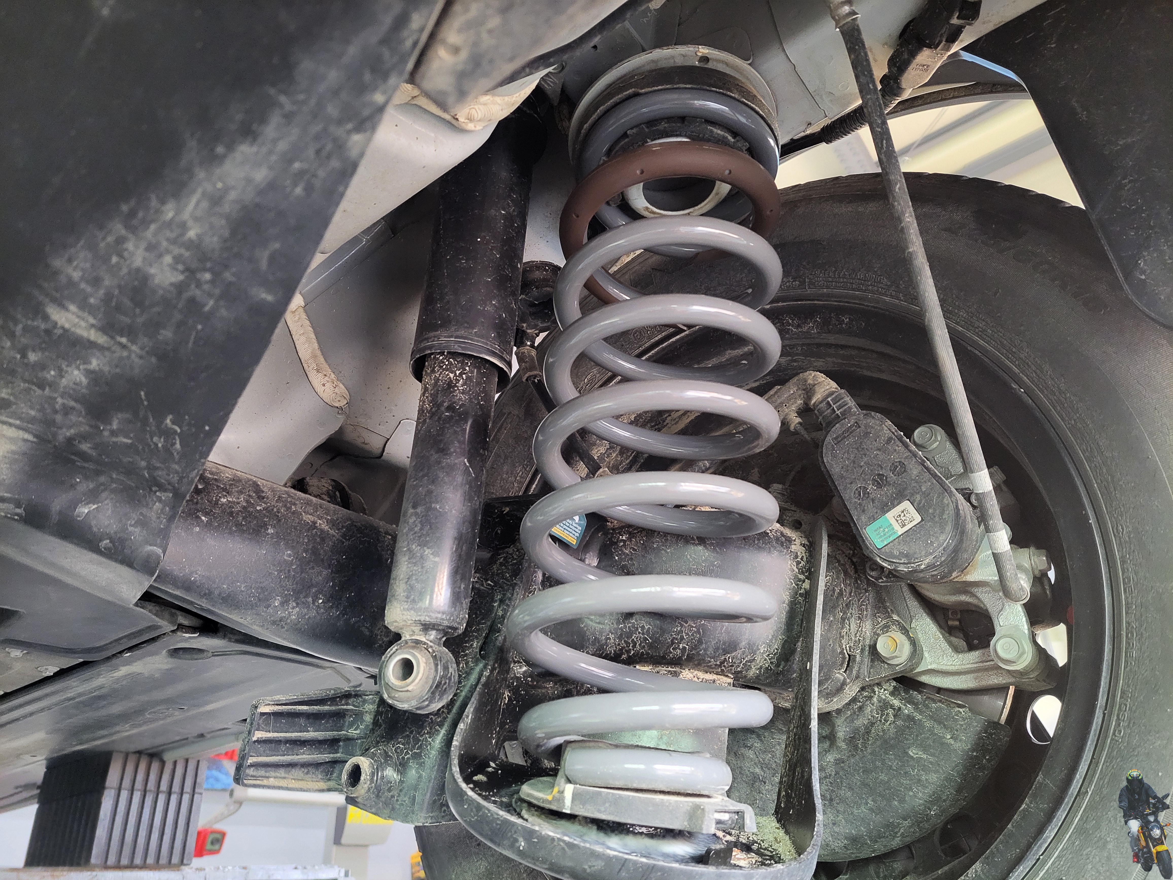 강성스프링이 조립된 순정쇼바를 차량에 장착하고 있습니다