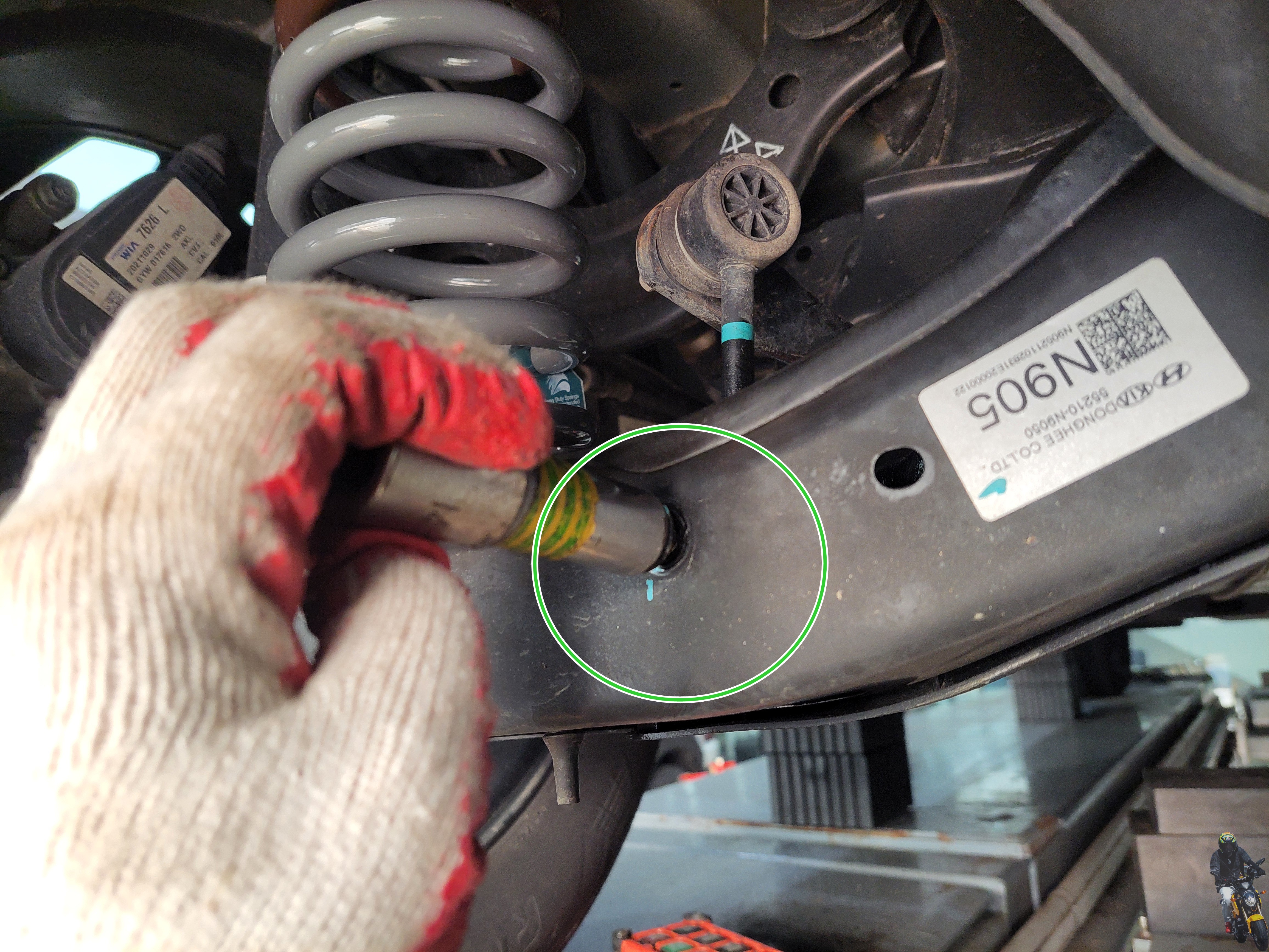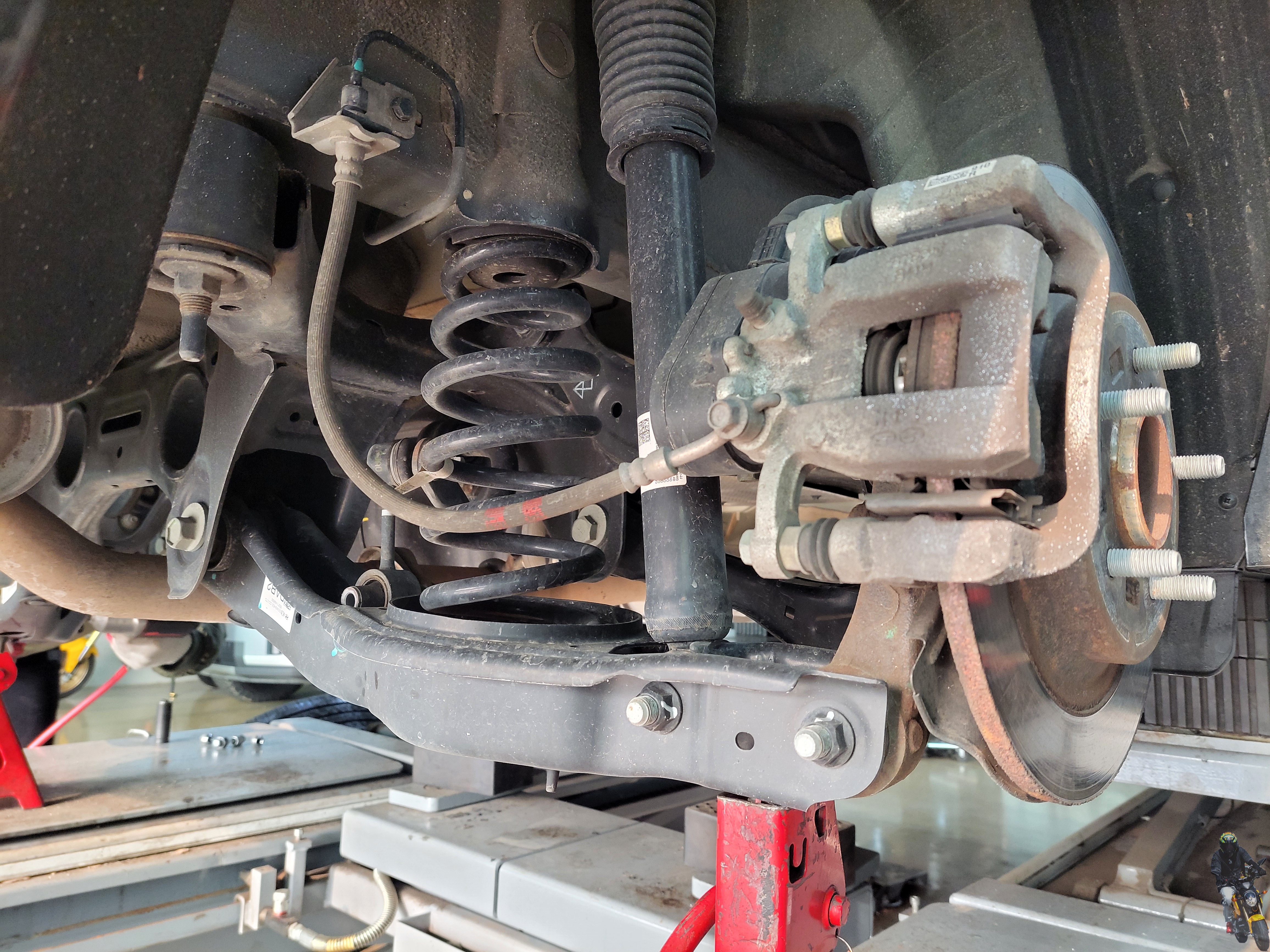 휠타이어를 탈거하고 로우암과 너클 쇼바의 고정부를