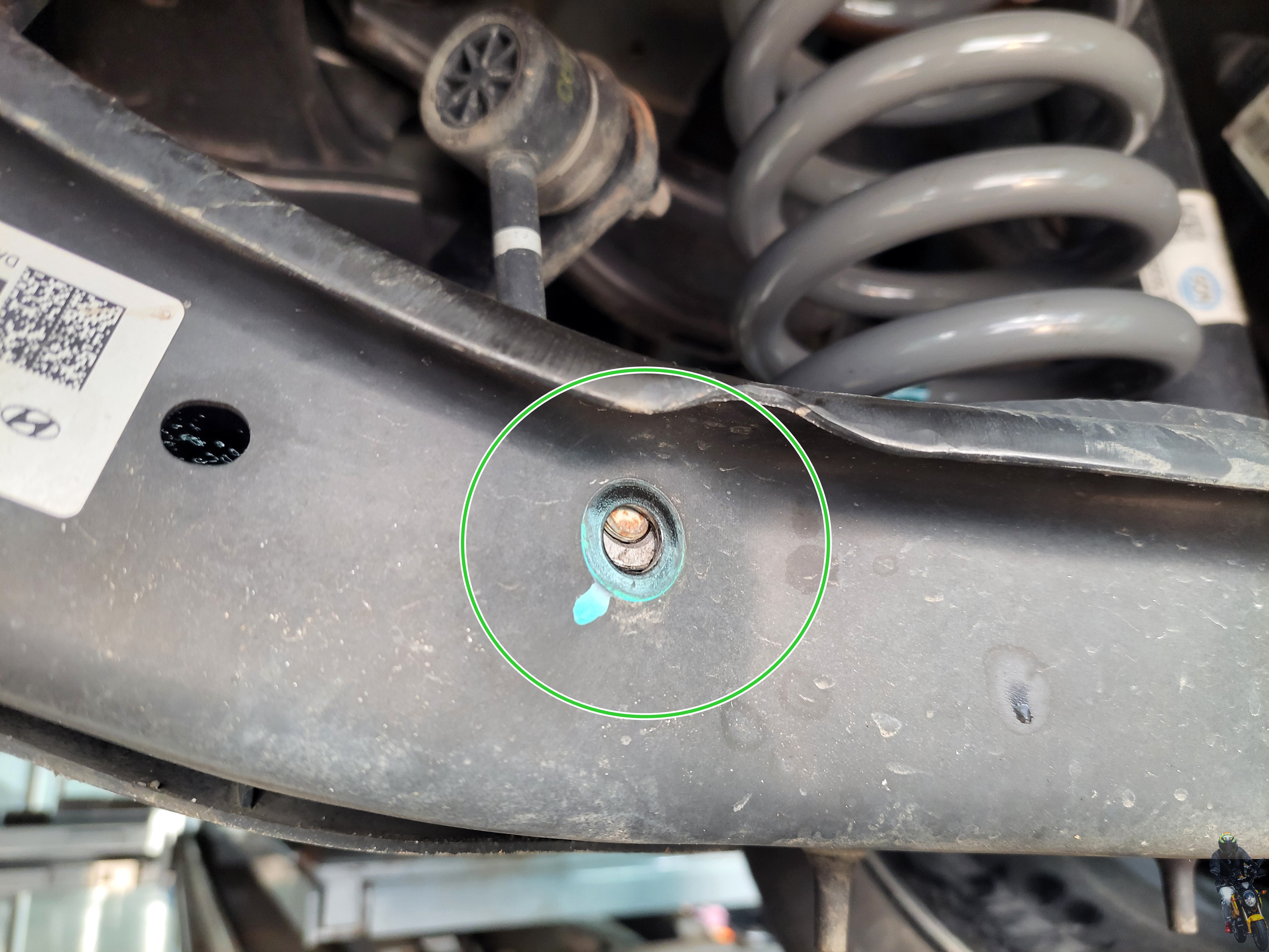 이렇게 로우암에 고정된 스테빌라이저 링크 볼트너트를 탈거합니다