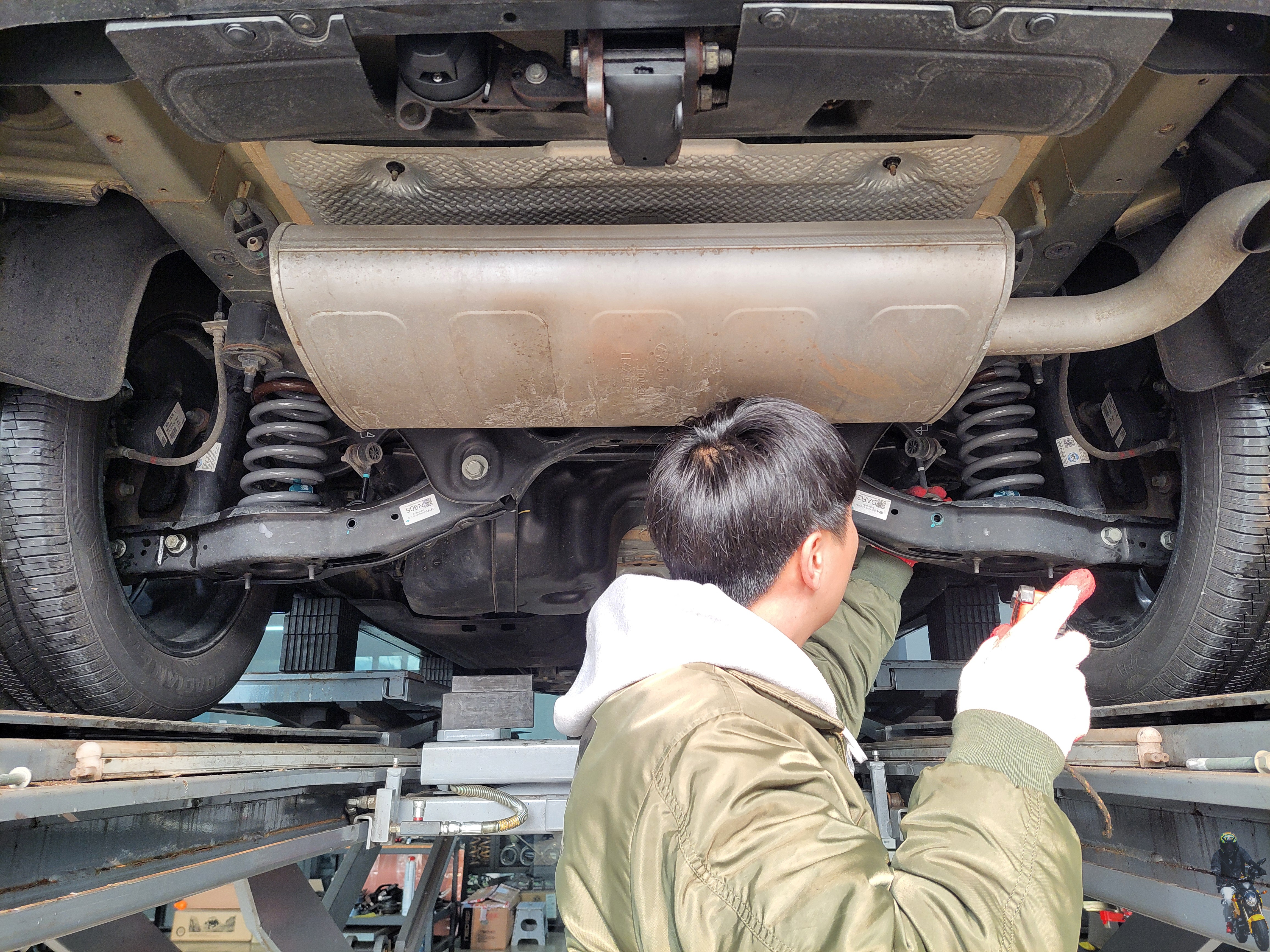 마지막으로 스테빌라이저 링크의 볼트너트를 조이고 있습니다