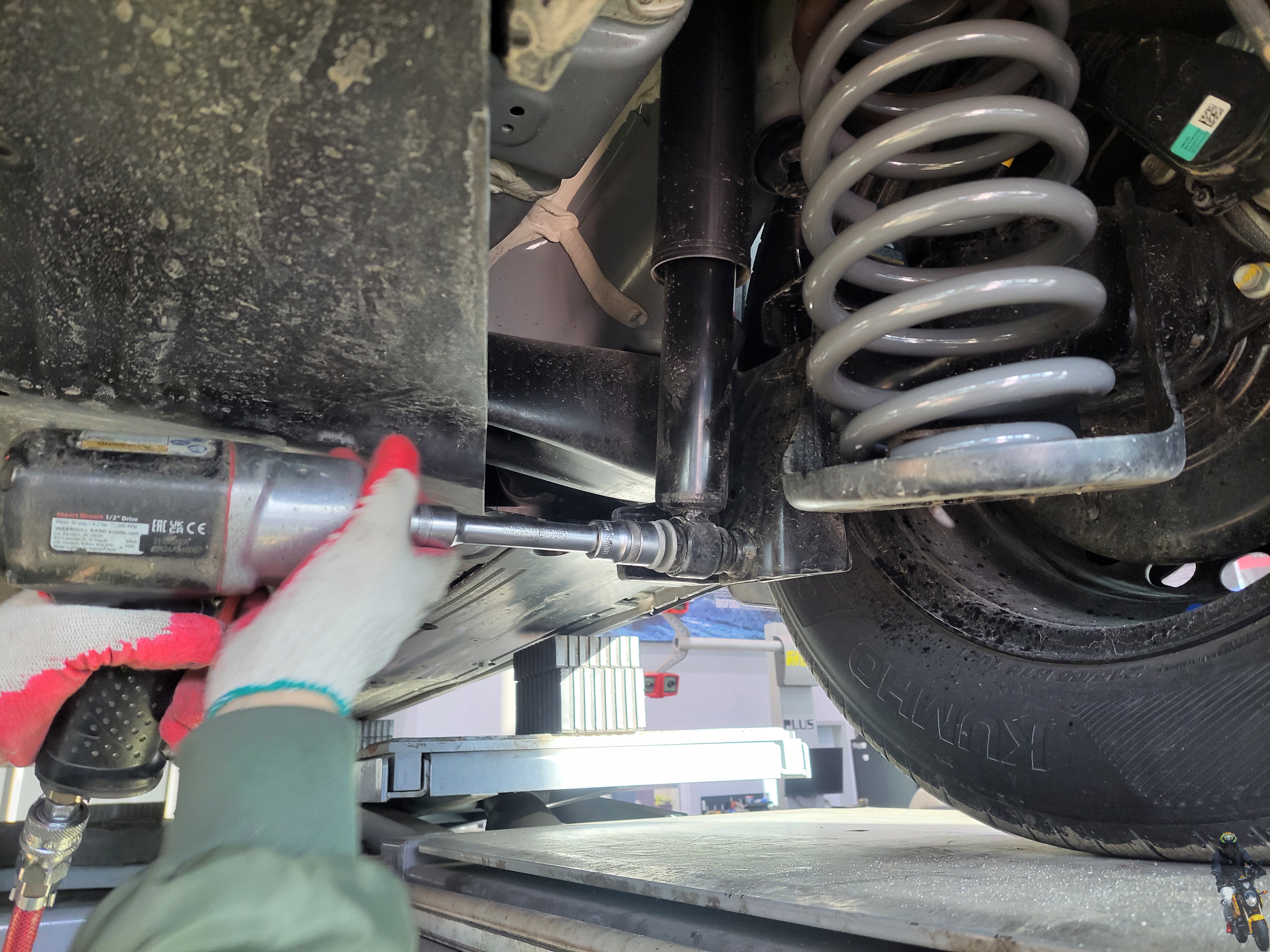 차량을 올려서 리어 순정스프링을 탈거하고 있습니다