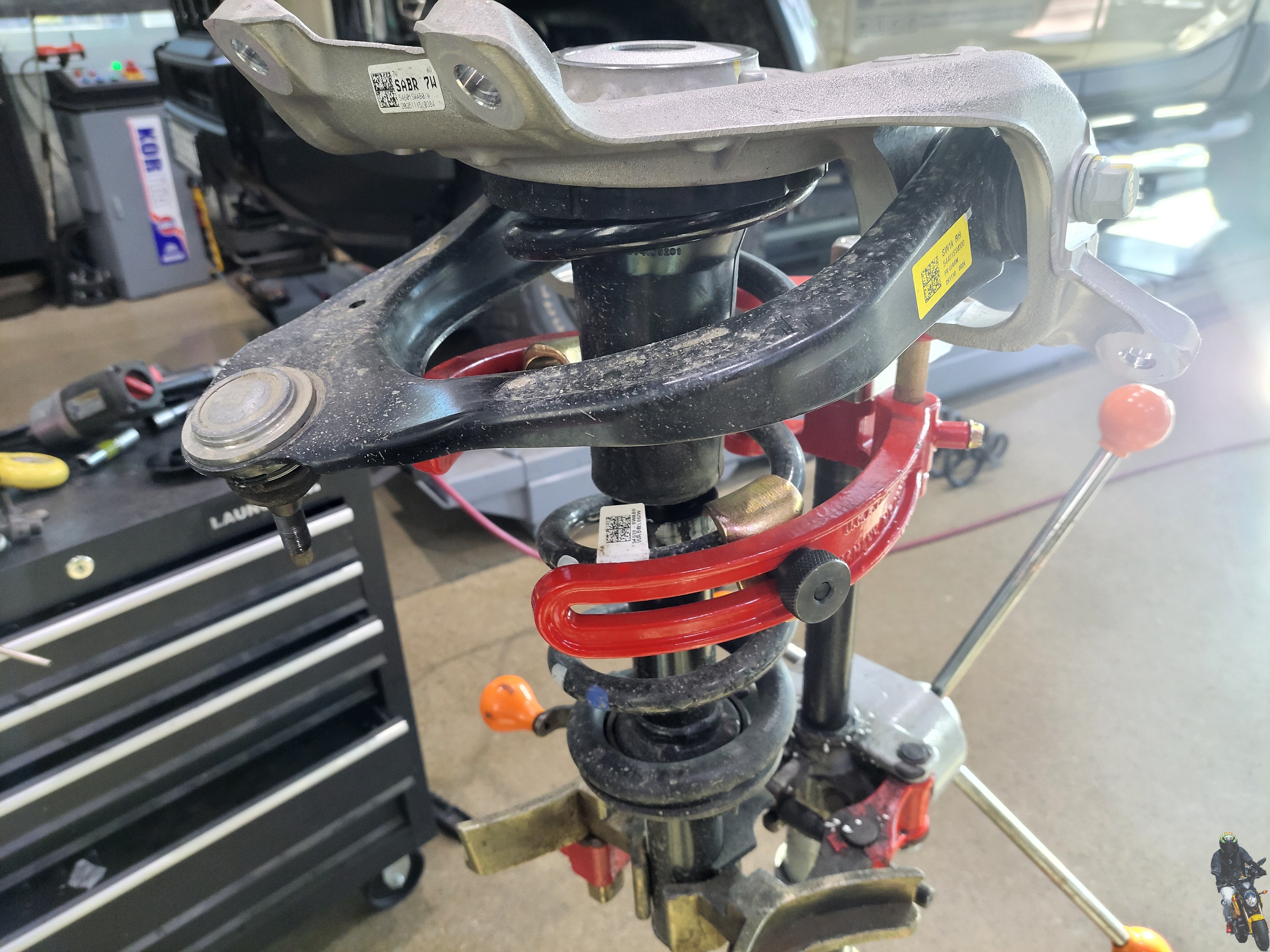 PV5차량의 프런트 쇼바스프링을 스프링 압축기에 고정을 하였습니다