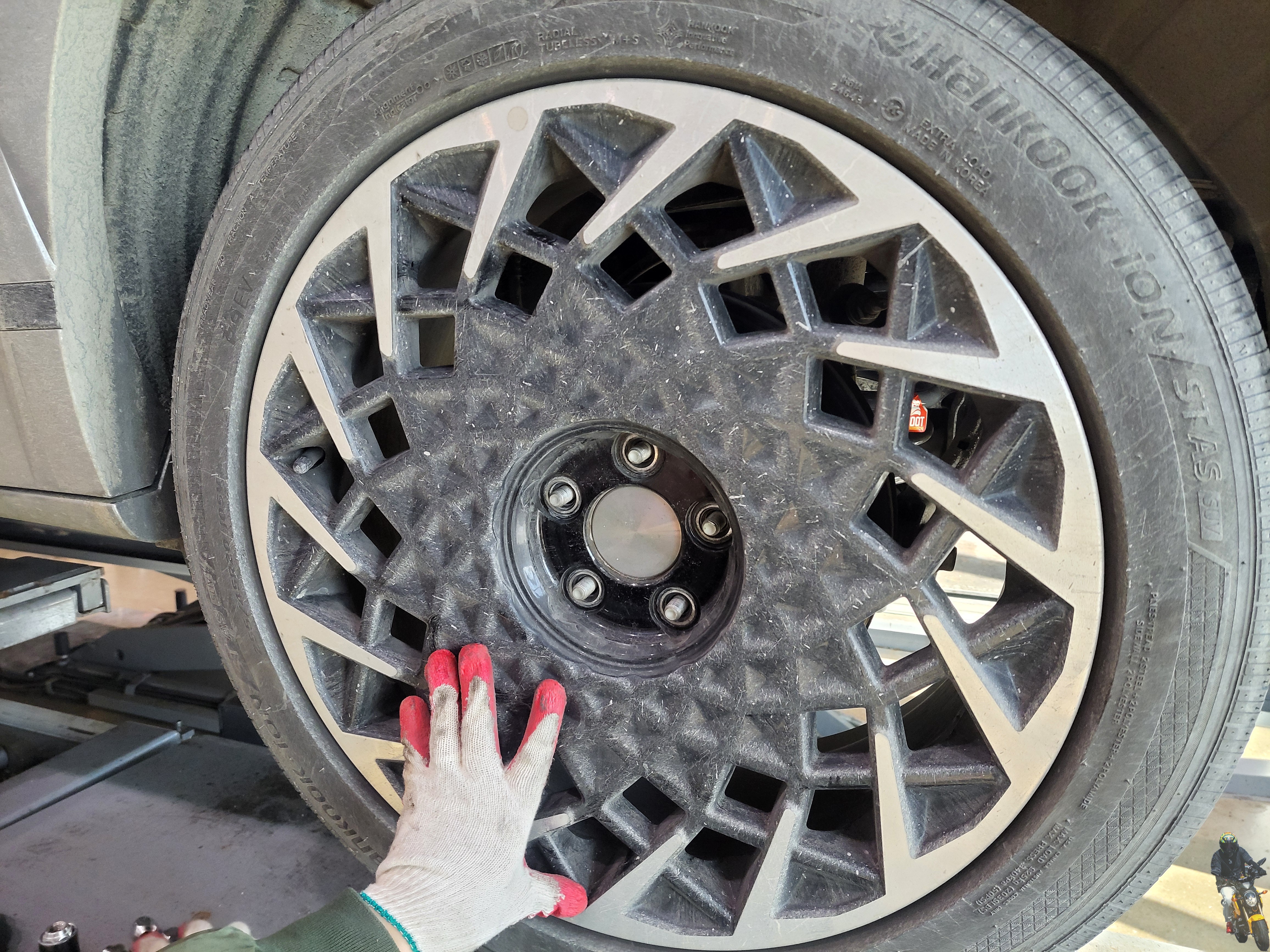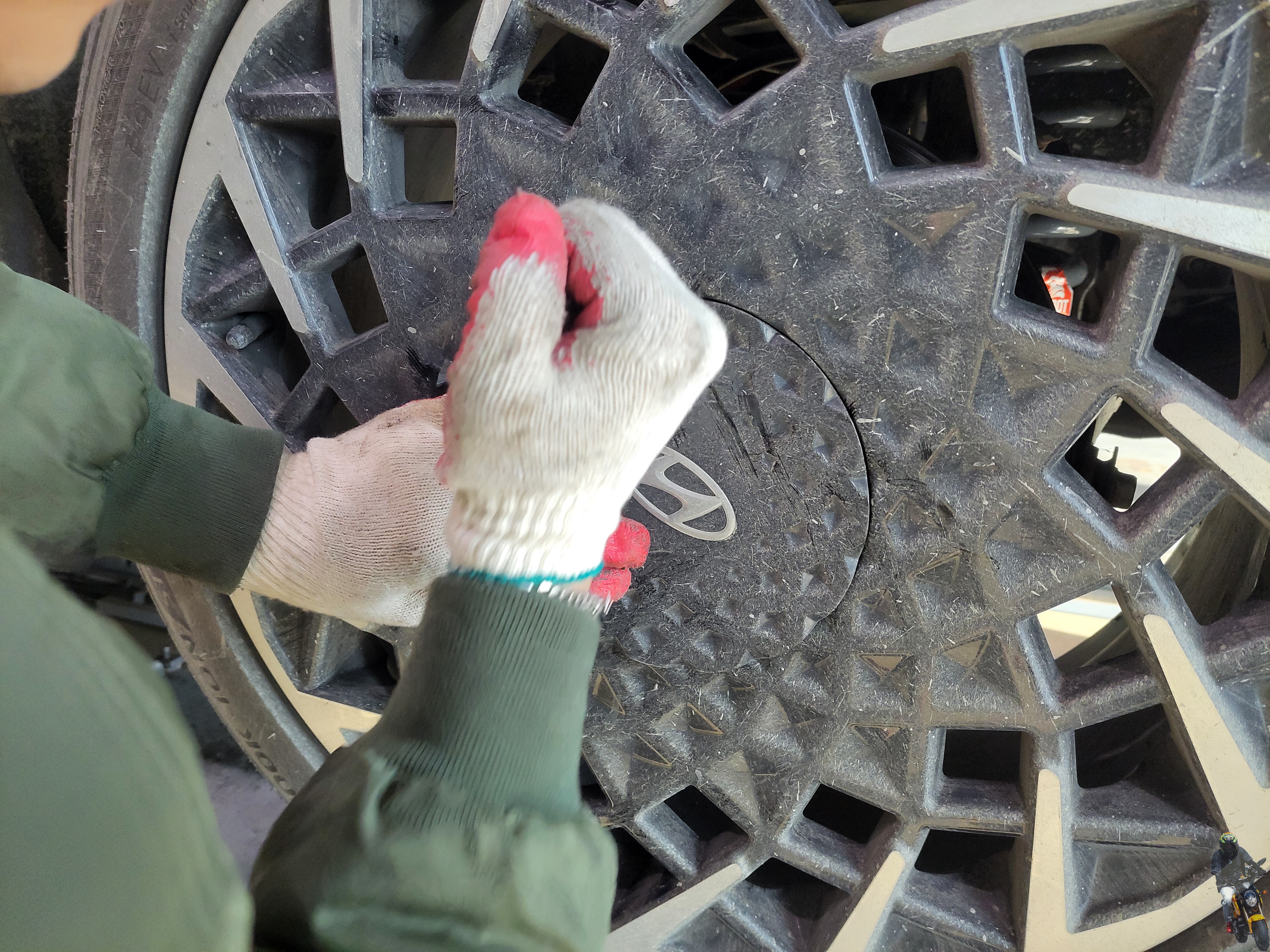 휠타이어를 장착하고 휠캡을 고정하고 있습니다