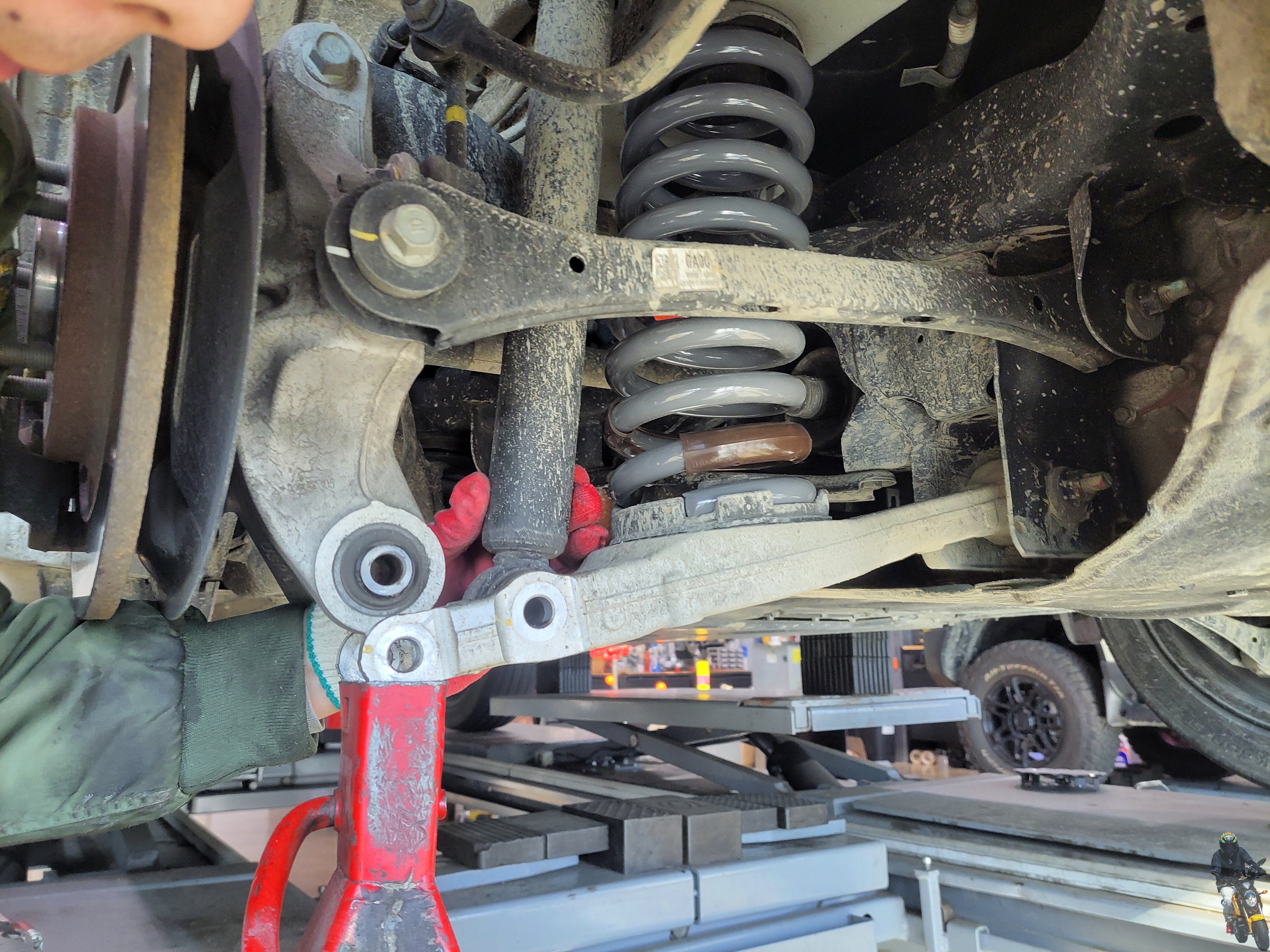 스프링 자리에 잘 안착시켰습니다 이제 로우암을 압축하면서